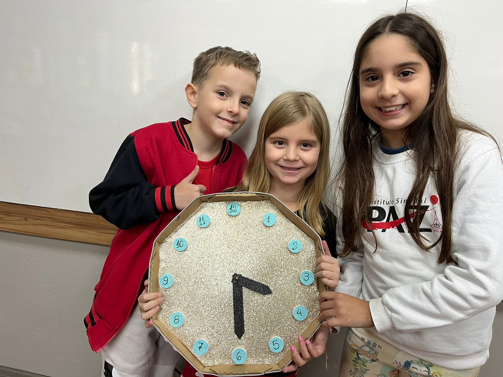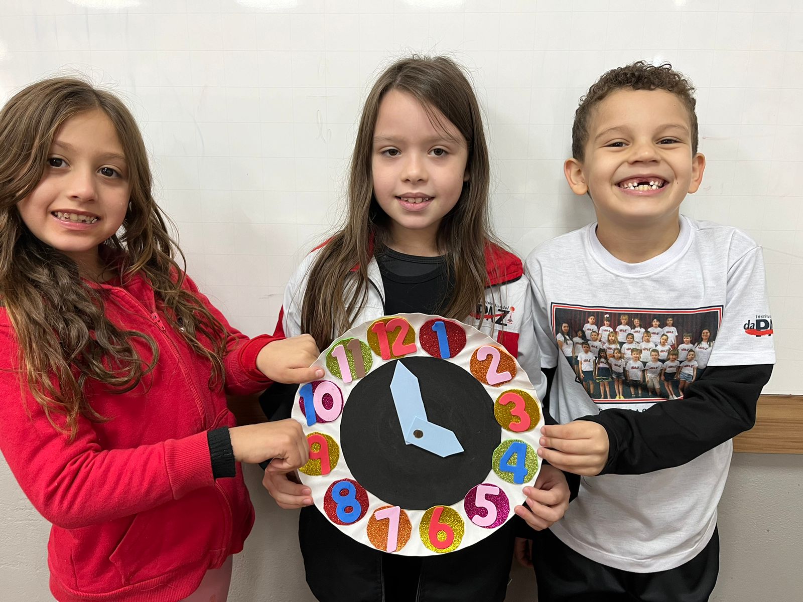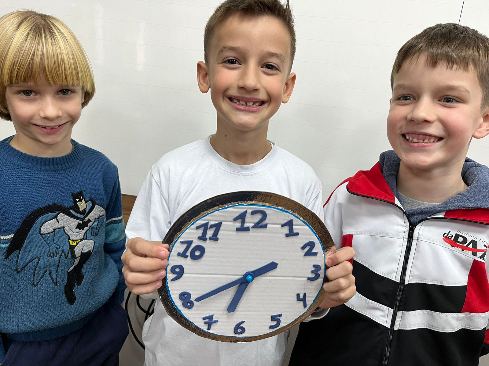 Os alunos dos segundos anos estão aprendendo sobre as horas nas aulas de Língua Inglesa. A professora Priscila propôs que eles fizessem relógios usando materiais recicláveis. O resultado ficou muito divertido!! Learning is fun!