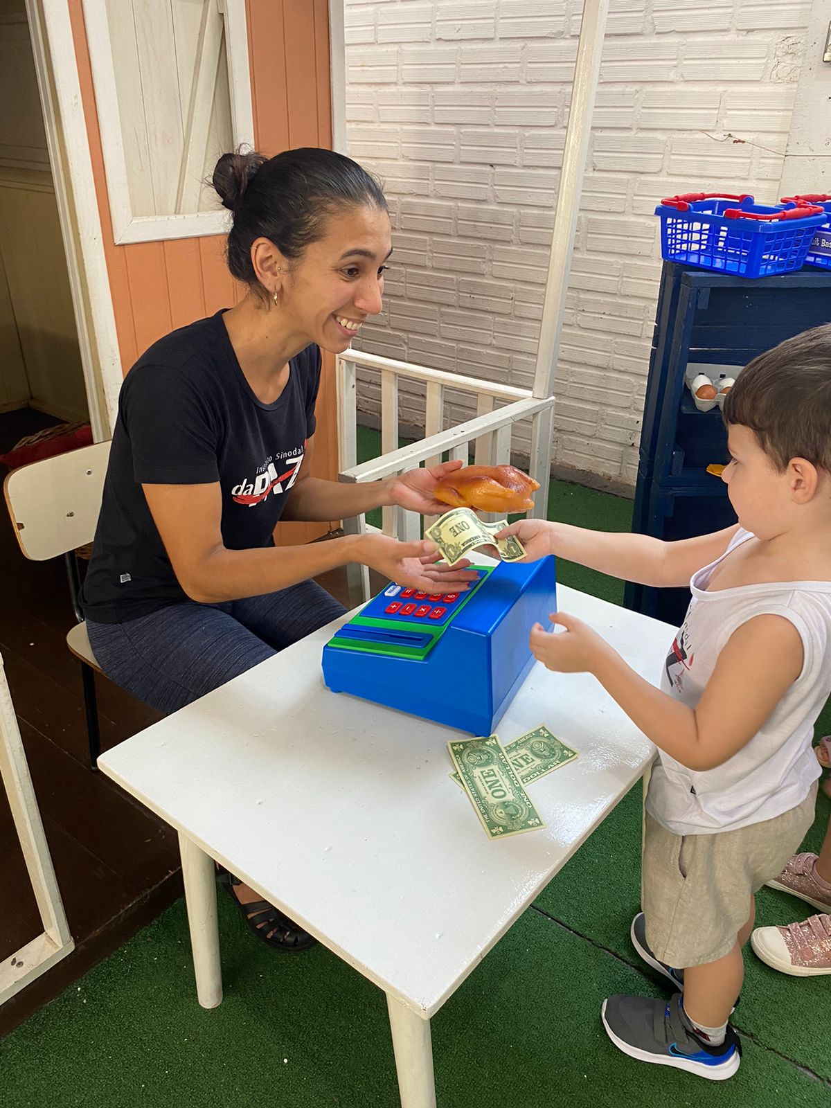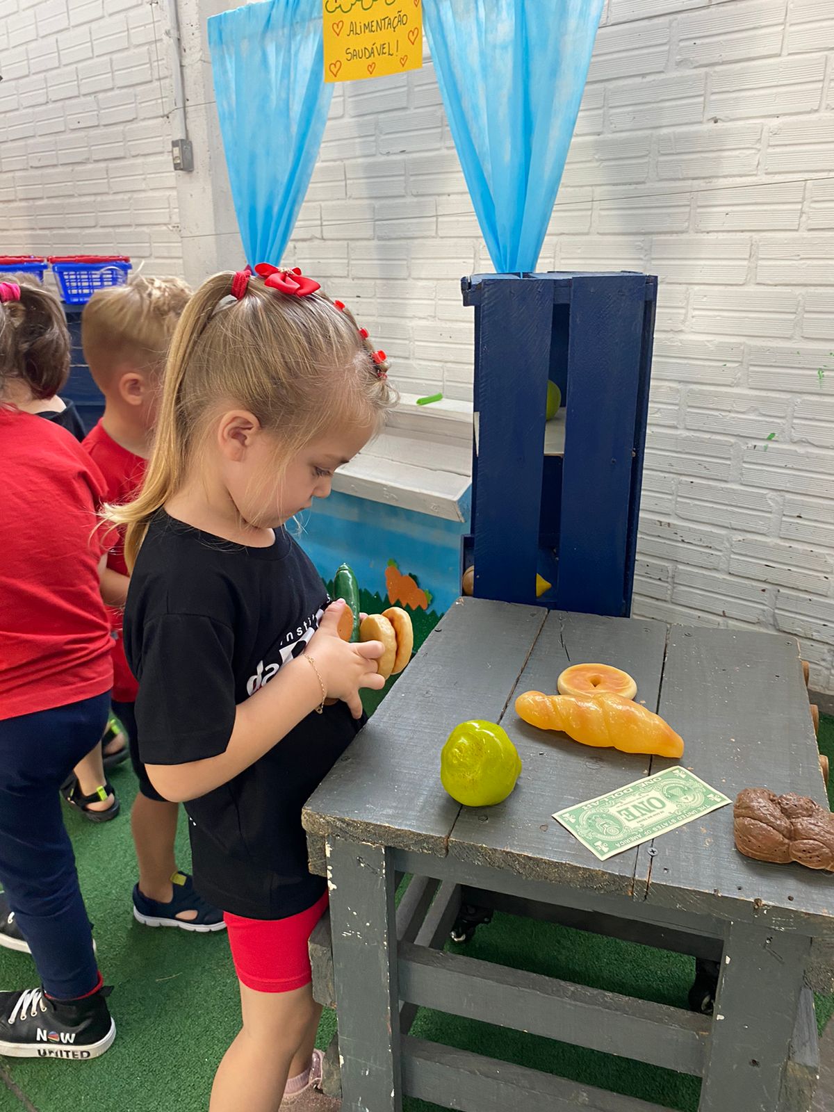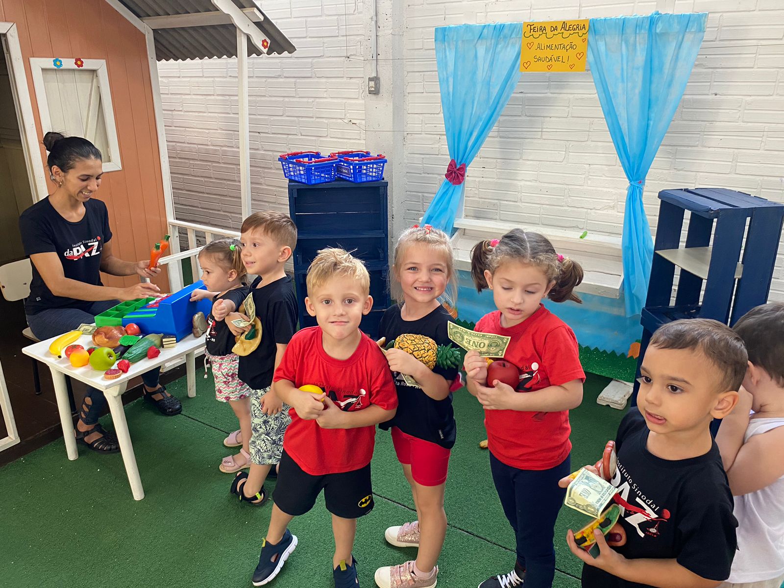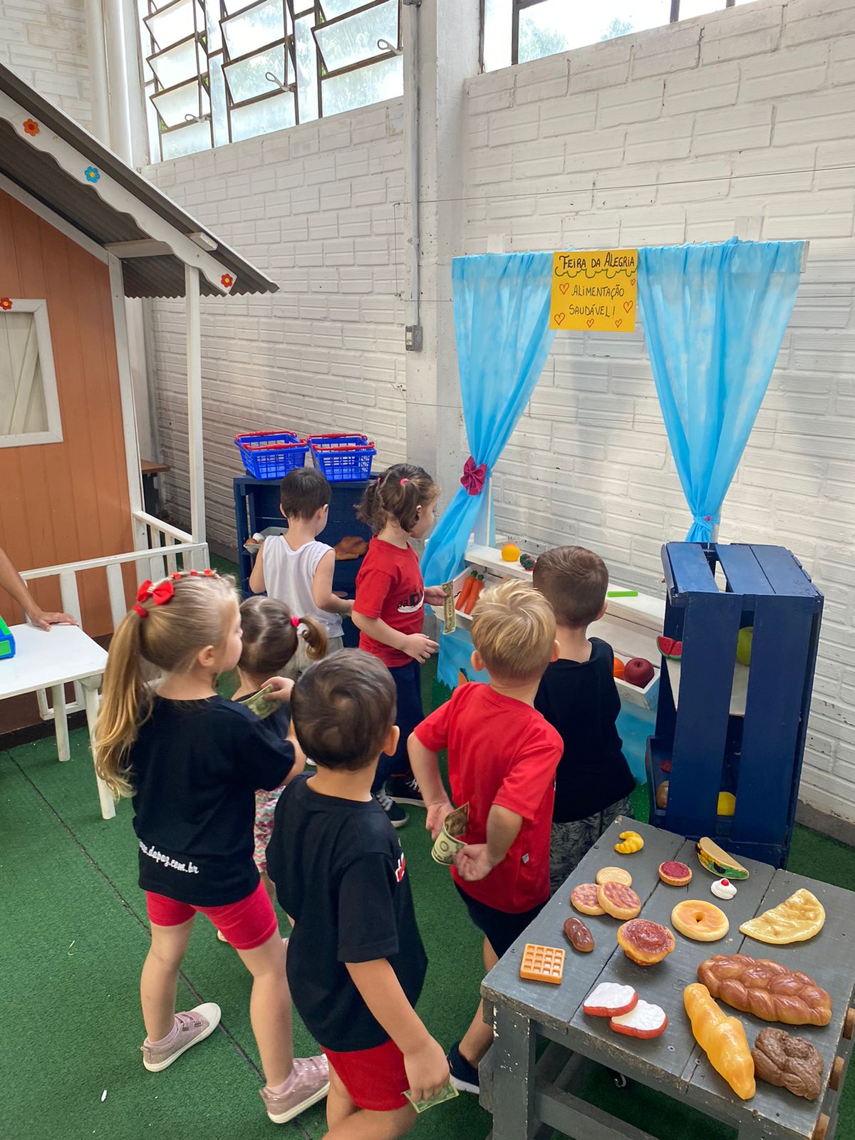 A turma de 03 anos da Professora Camila, realizou a Feira da Alegria, cada criança tinha seu próprio dinheiro e foram a feira comprar alimentos saudáveis!