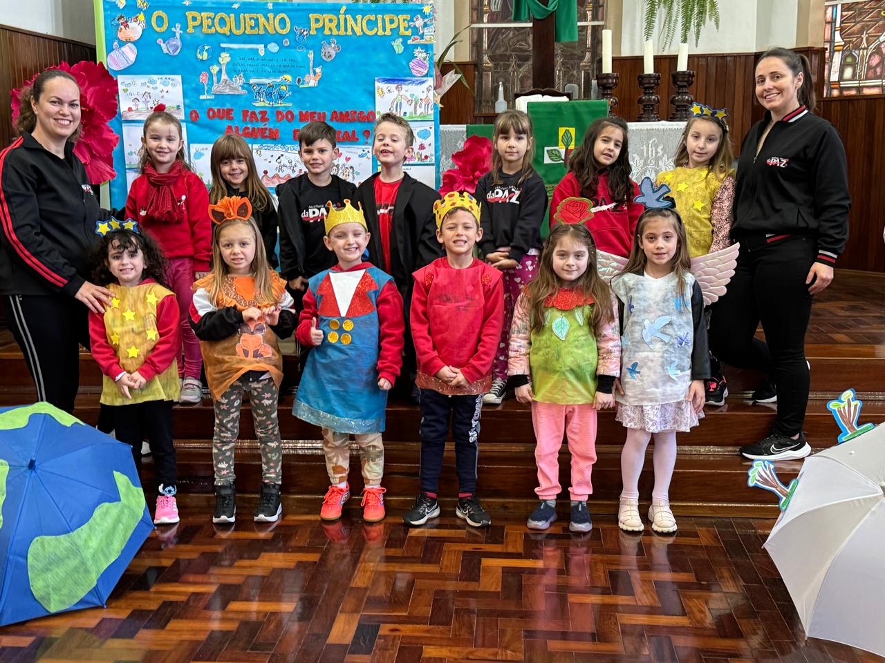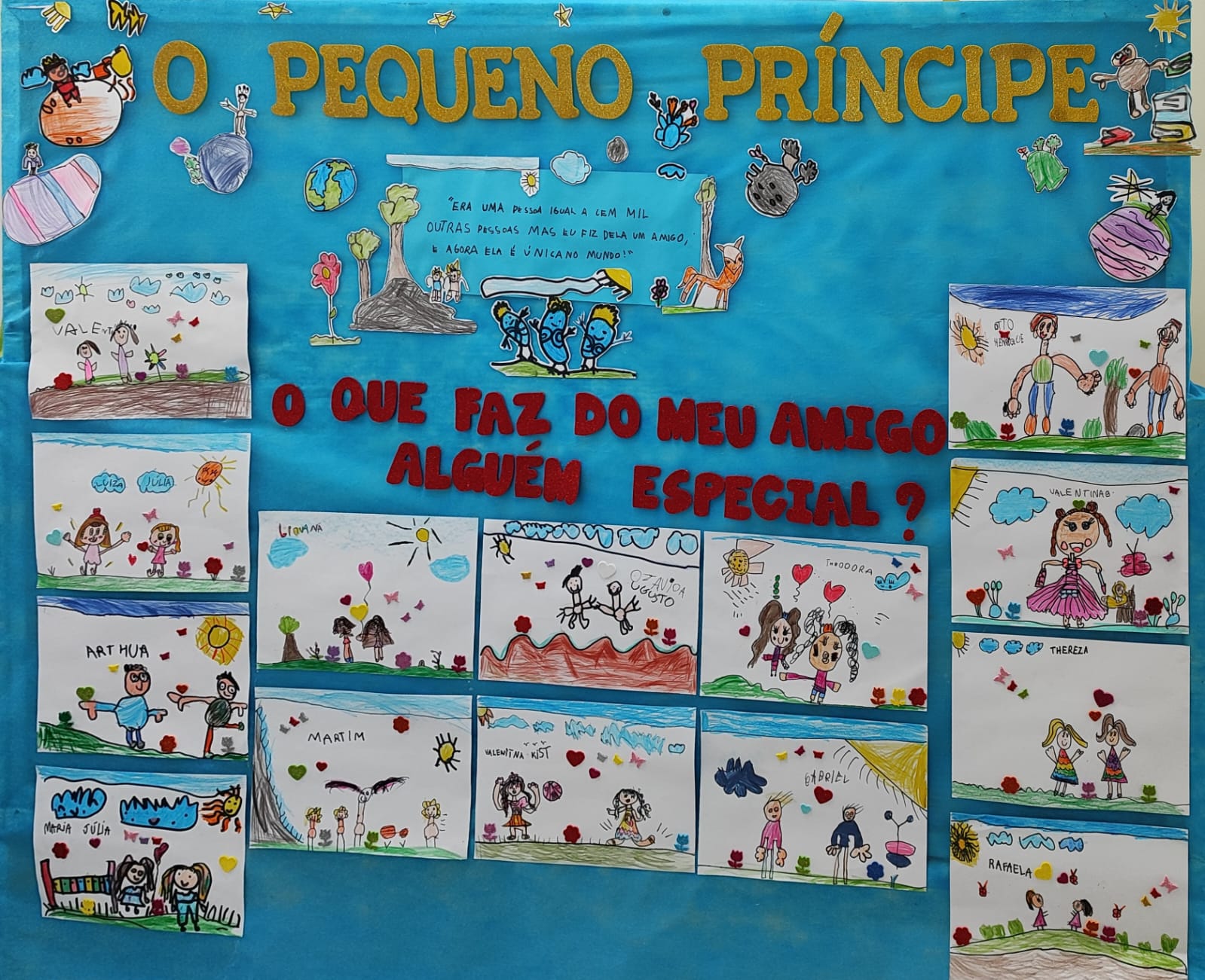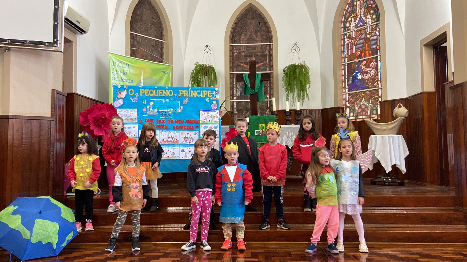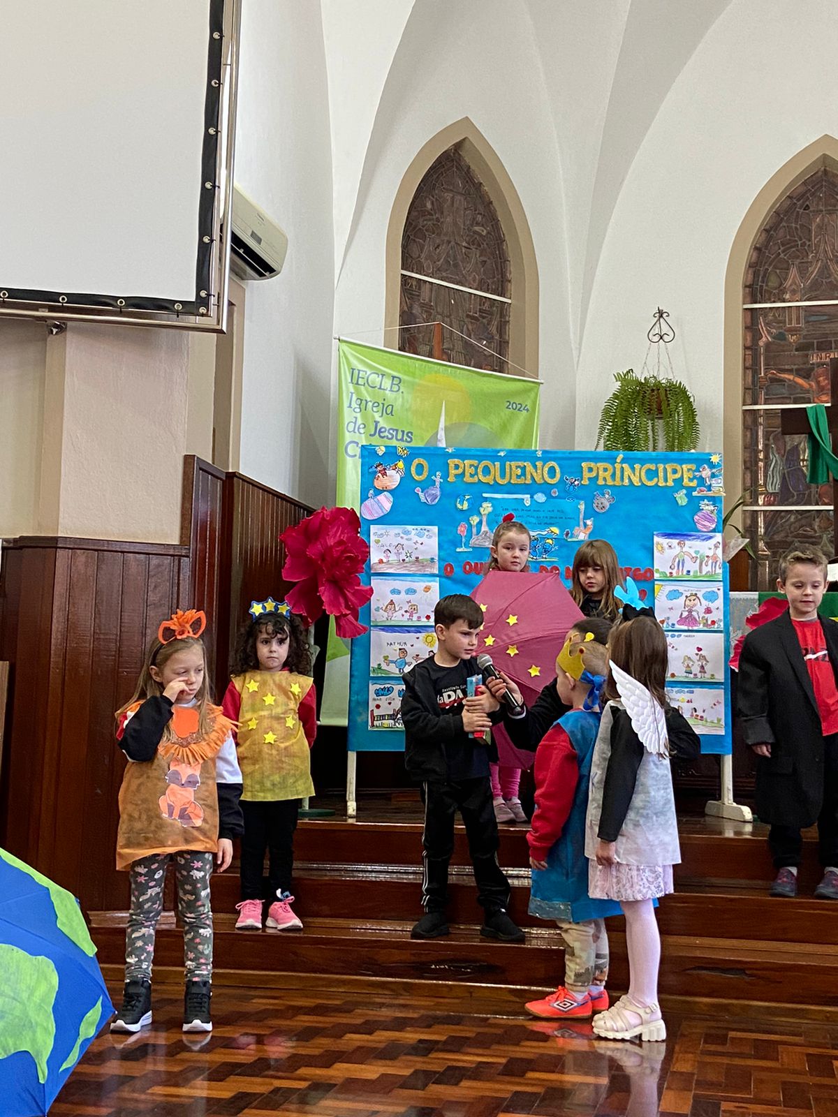 No dia 17.7.24, a turma da Pré-escola- 05 anos A, das professores Amanda e Denise, realizou o Boa Tarde na Igreja, com a apresentação do livro: " O PEQUENO PRÍNCIPE" de Antonie de Saint' Exupery, sobre o tema "AMIZADE". Após o teatro, cada aluno apresentou seu desenho sobre a temática: "O QUE FAZ DO MEU AMIGO ALGUÉM ESPECIAL?" e conversamos sobre o tema amizade, através da fala da Pastora Eliana. Na sequência, os alunos cantaram a canção "A AMIZADE", letra e música da Banda Infantil: Mundo Bita.