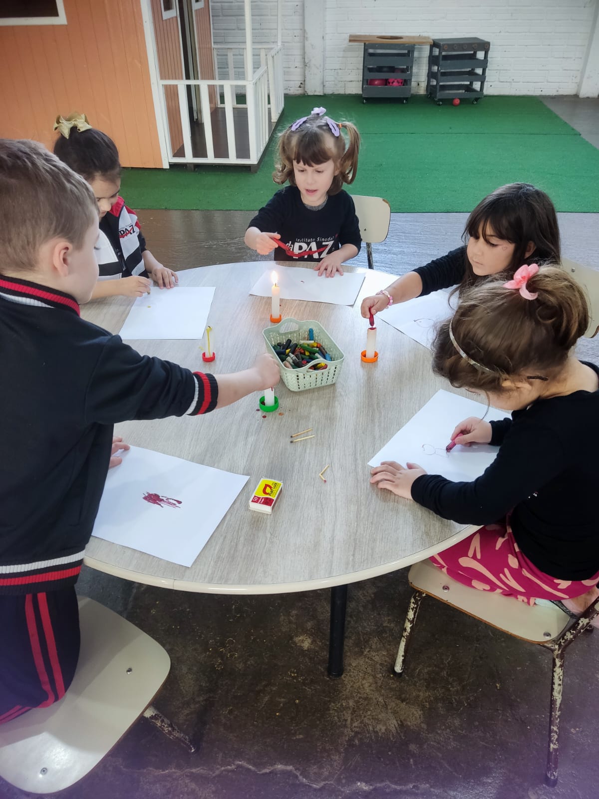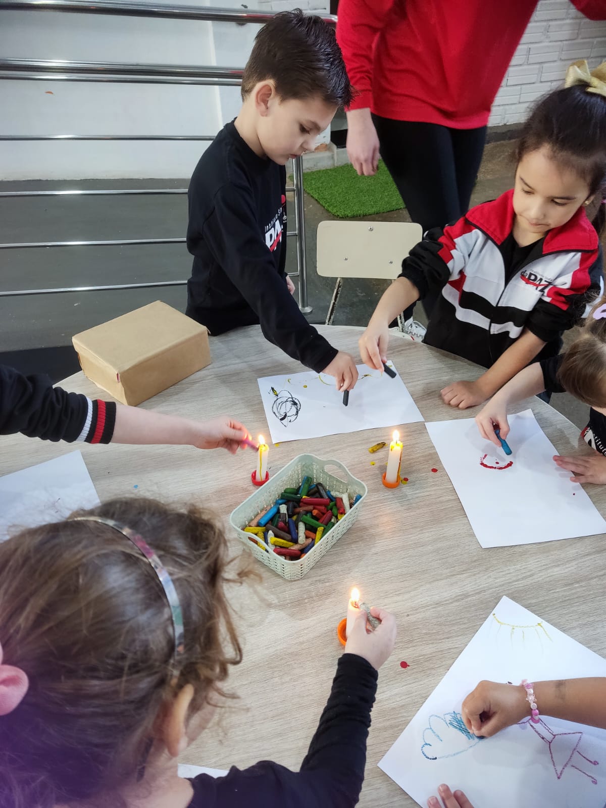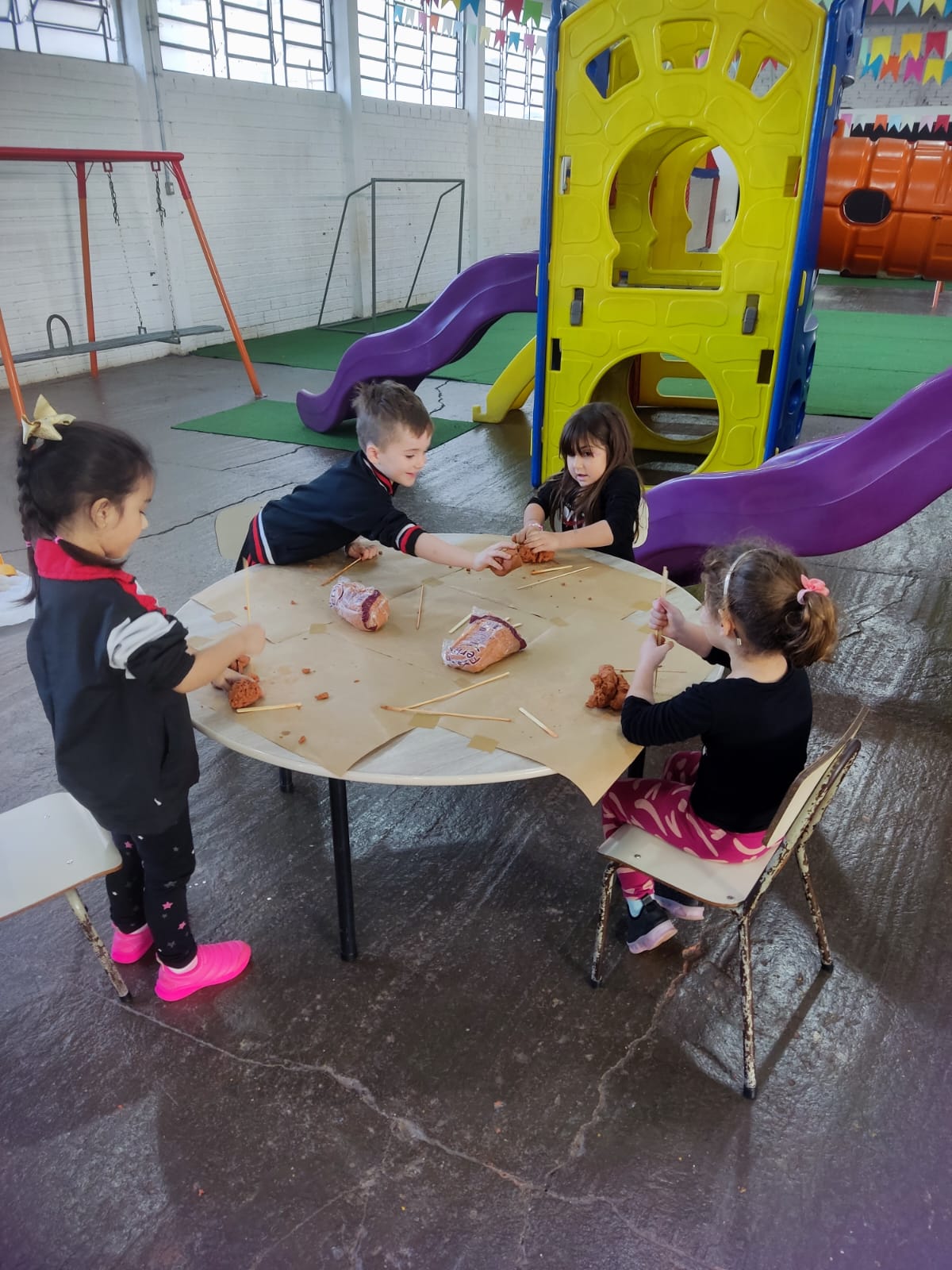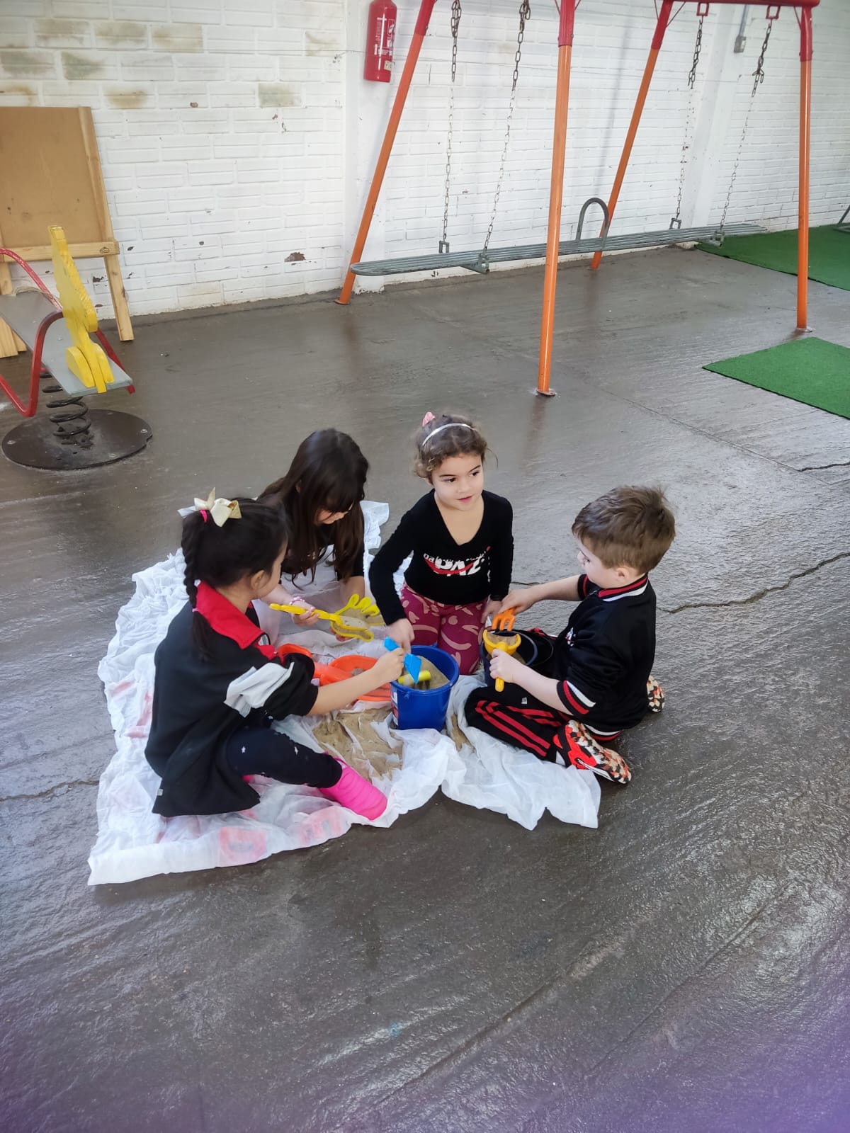 Durante o estudo da Sequência Didática "Criando Narrativas com o Corpo", a turma da Pré-escola 04 anos da professora Vanessinha, estudou sobre os quatro elementos da natureza, e para finalizar a sequência, a turma foi convidada a participar de uma oficina dos quatro elementos da natureza, onde foram organizados quatros estações (água, ar, terra e fogo).