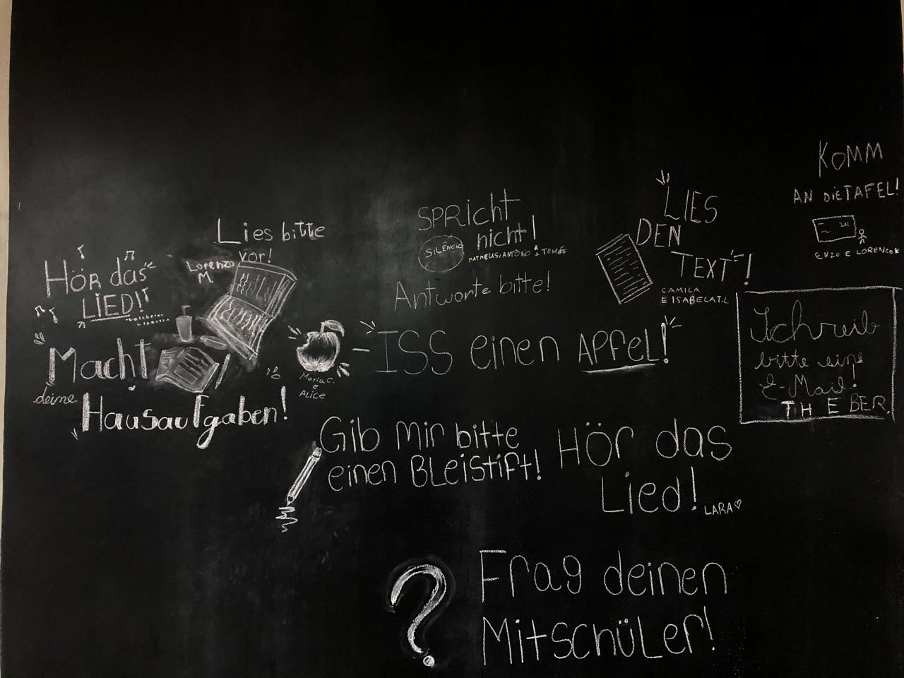 Meine Klasse: Alunos do 7 ano decoraram sua sala de aula com frases no imperativo em língua alemã com alguns comandos da sala de aula.