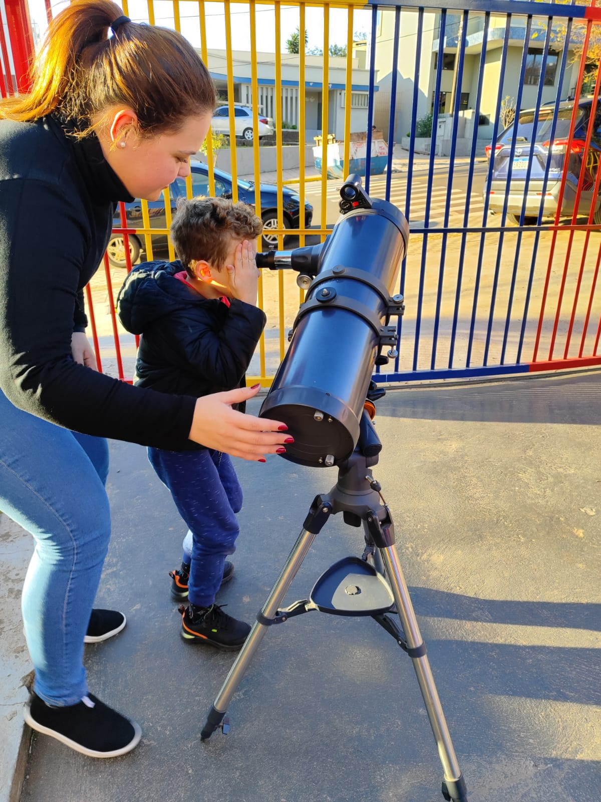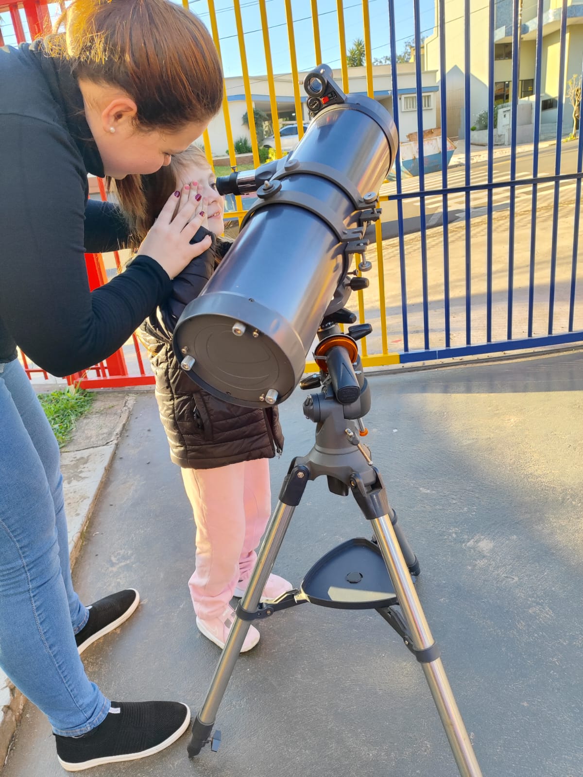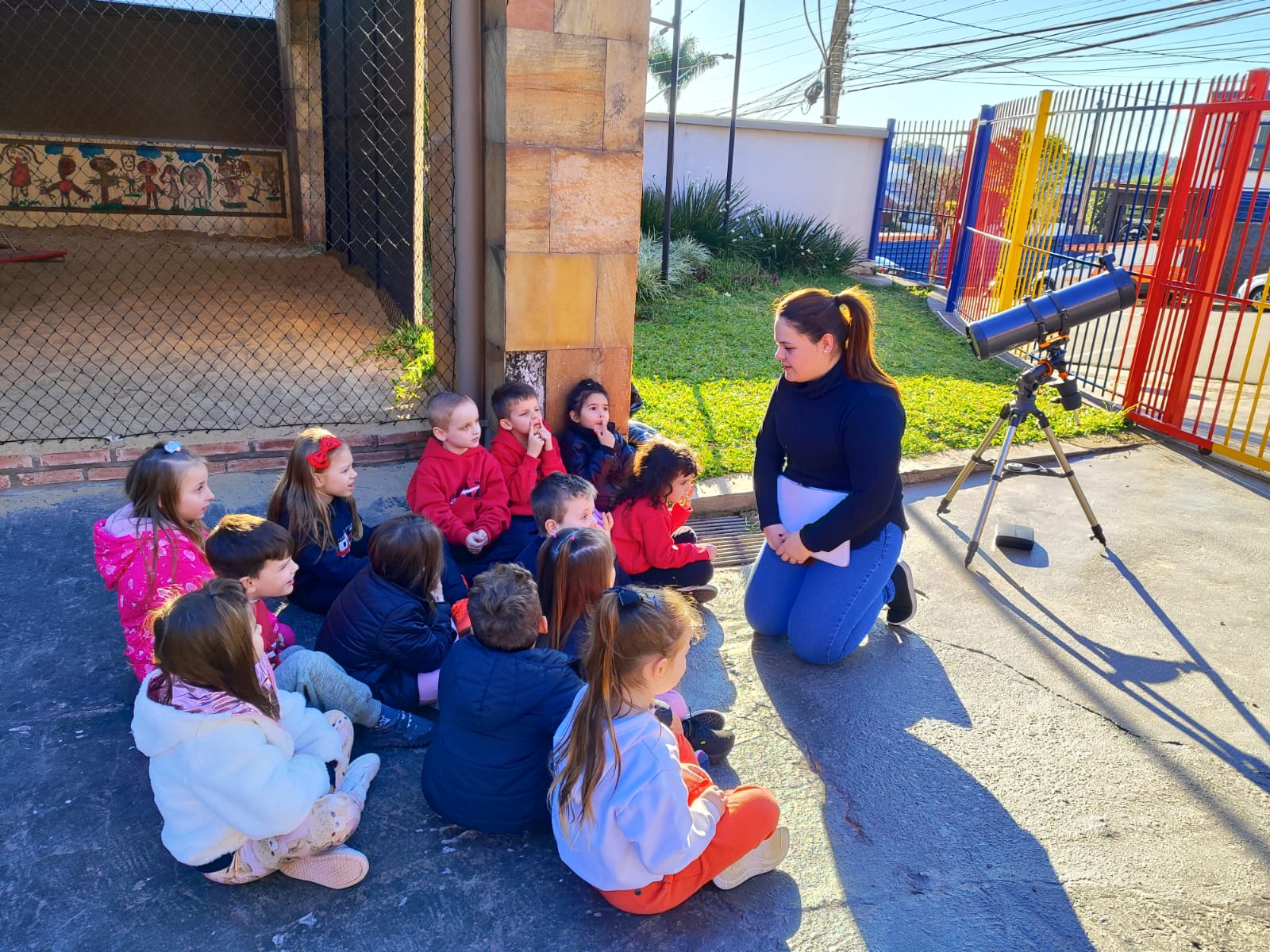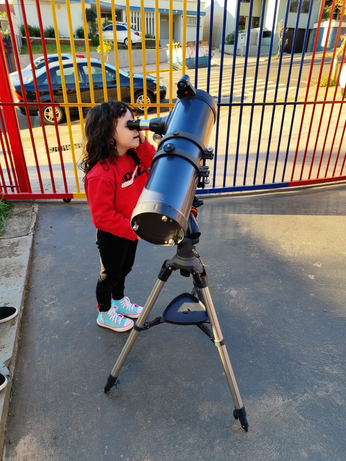 A turma da pré-escola 05 anos da professora Amanda durante a Sequência Didática "Viagem ao Universo” foi convidada a observar um telescópio e entender como este equipamento é usado nas pesquisas. Neste momento recebemos a Professora de Física Daniela (mamãe do nosso colega de turma) que demonstrou aos alunos o equipamento, e nos trouxe várias curiosidades sobre o universo. Confira alguns registros desse momento.