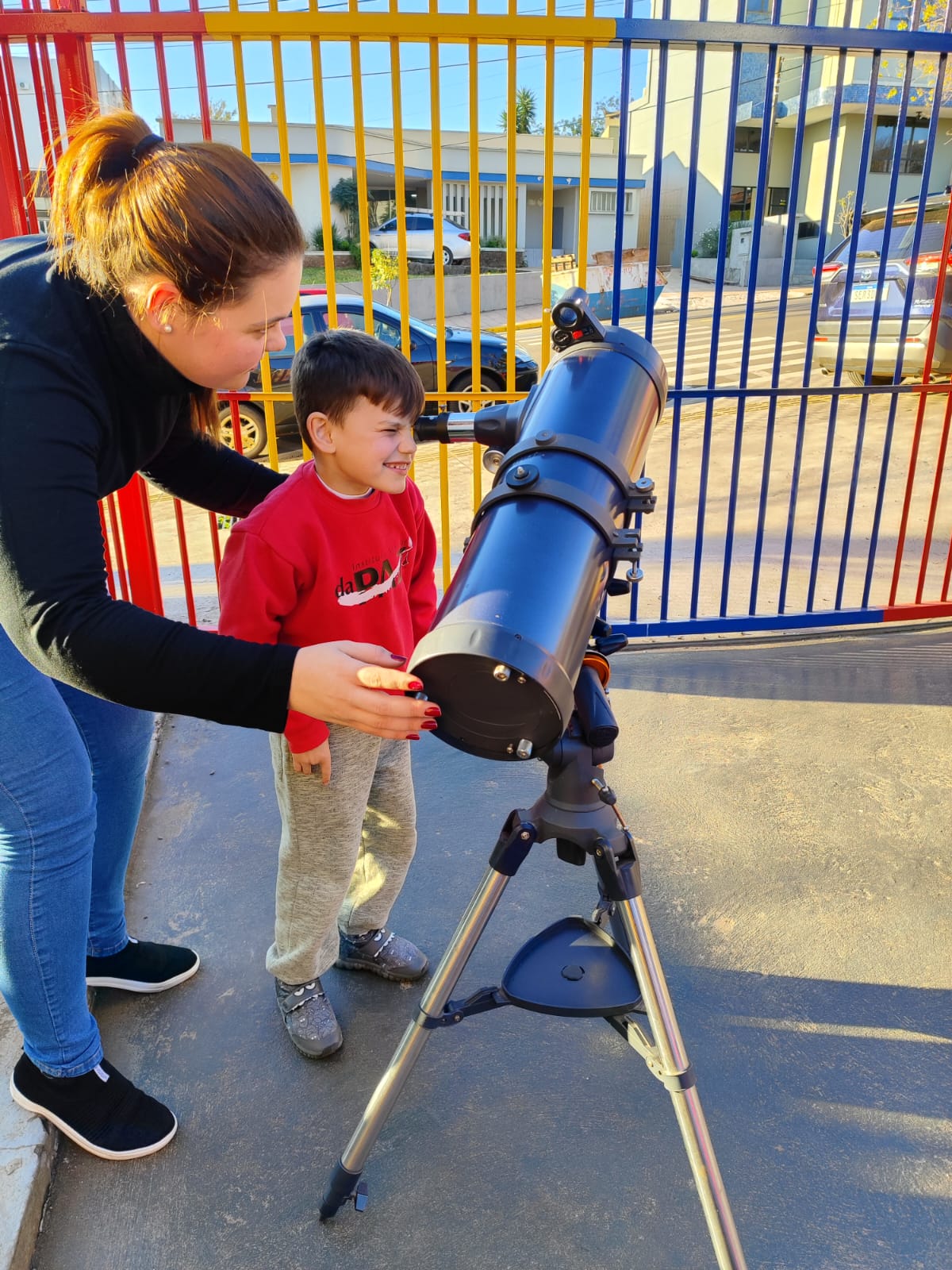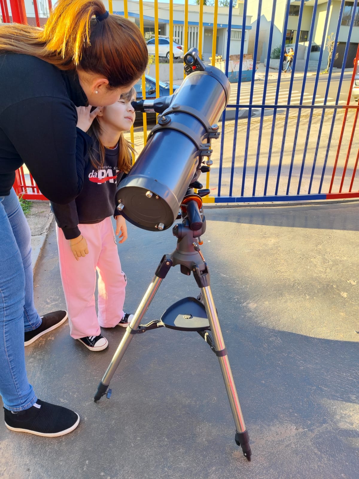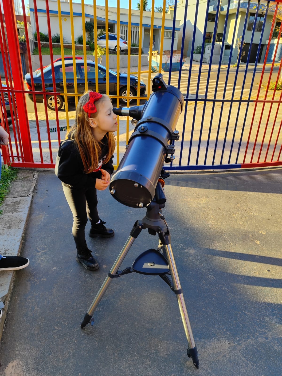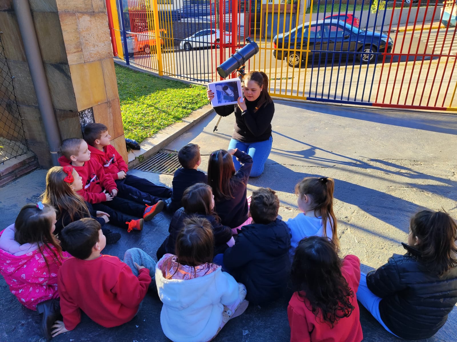 A turma da pré-escola 05 anos da professora Amanda durante a Sequência Didática "Viagem ao Universo” foi convidada a observar um telescópio e entender como este equipamento é usado nas pesquisas. Neste momento recebemos a Professora de Física Daniela (mamãe do nosso colega de turma) que demonstrou aos alunos o equipamento, e nos trouxe várias curiosidades sobre o universo. Confira alguns registros desse momento.