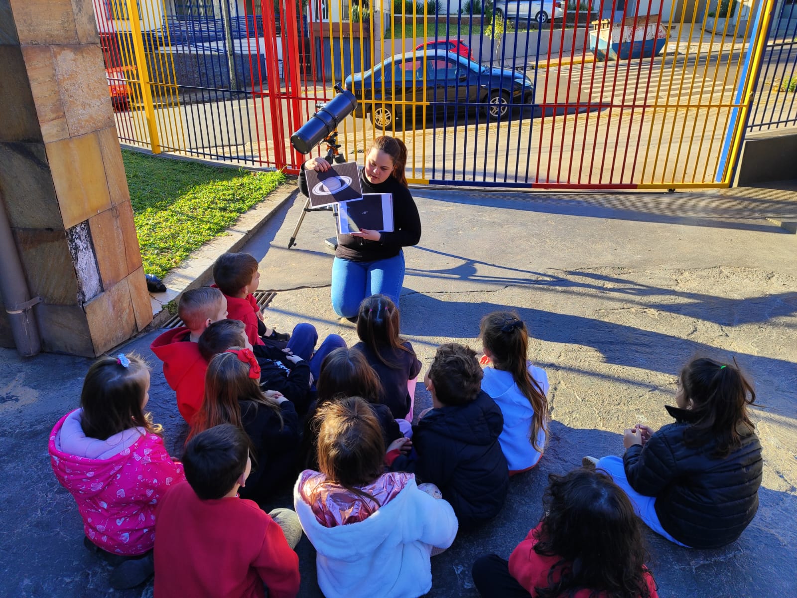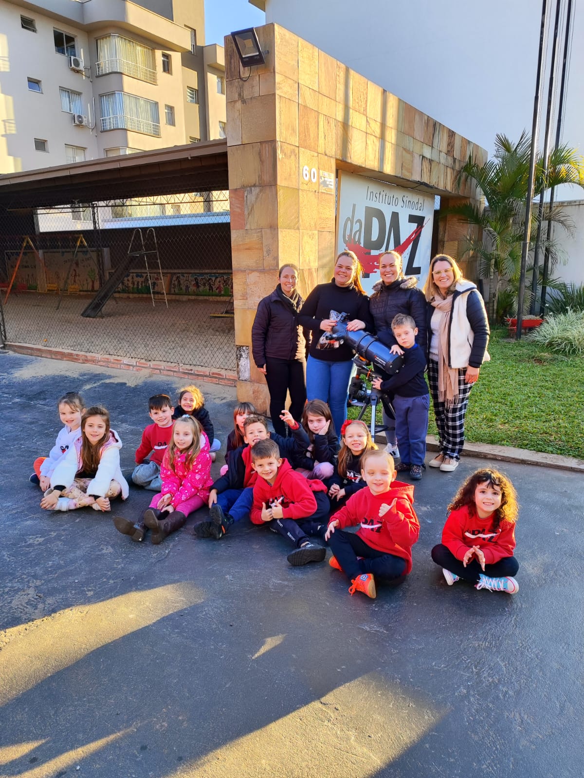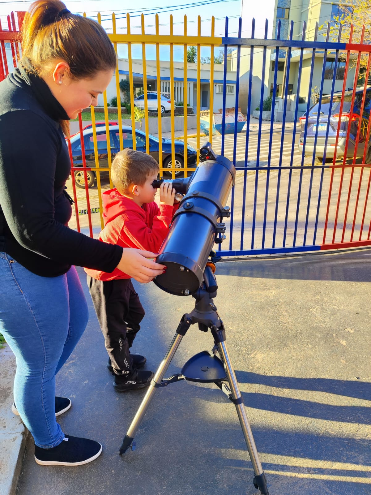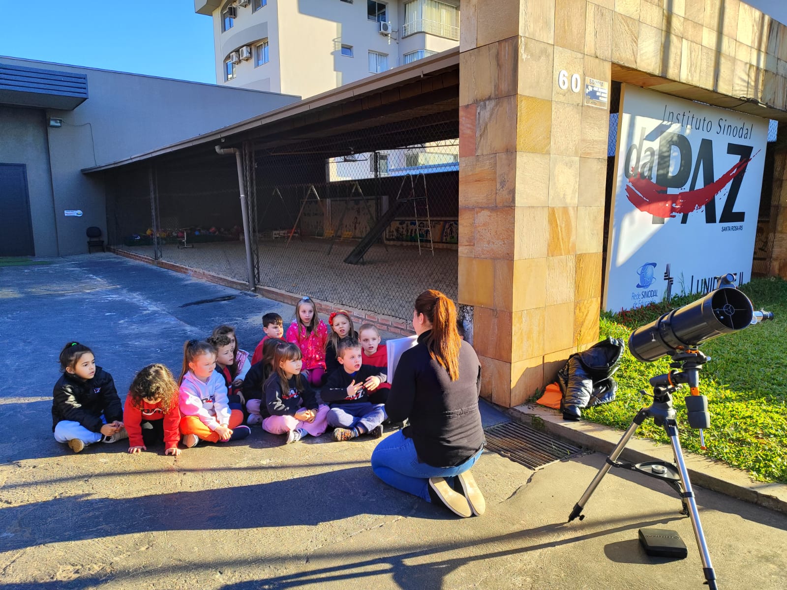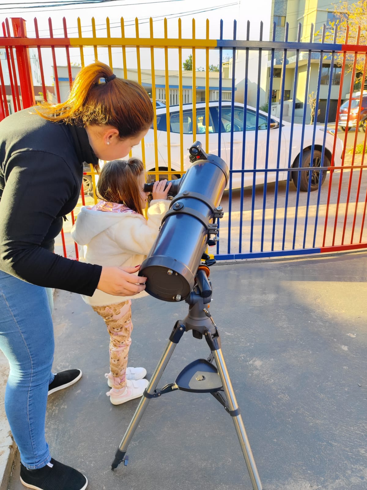 A turma da pré-escola 05 anos da professora Amanda durante a Sequência Didática "Viagem ao Universo” foi convidada a observar um telescópio e entender como este equipamento é usado nas pesquisas. Neste momento recebemos a Professora de Física Daniela (mamãe do nosso colega de turma) que demonstrou aos alunos o equipamento, e nos trouxe várias curiosidades sobre o universo. Confira alguns registros desse momento.