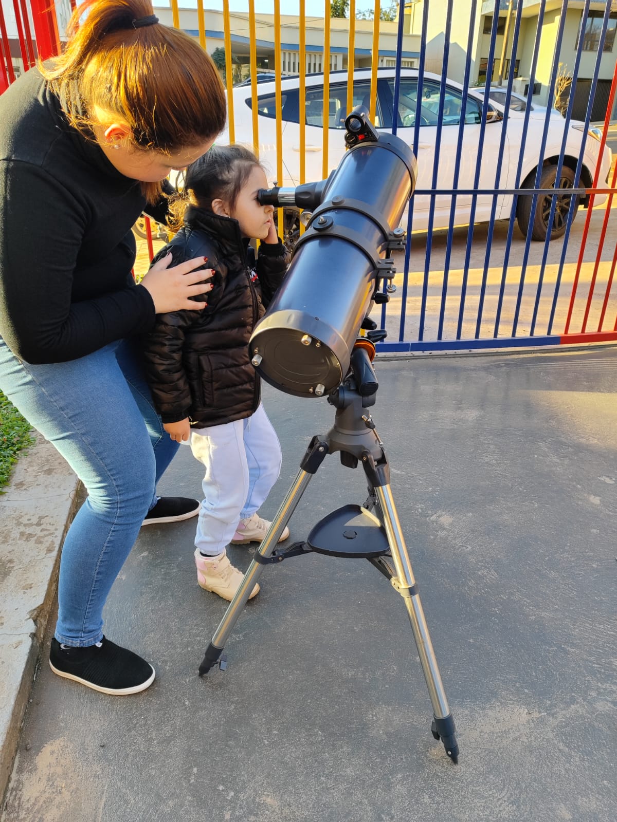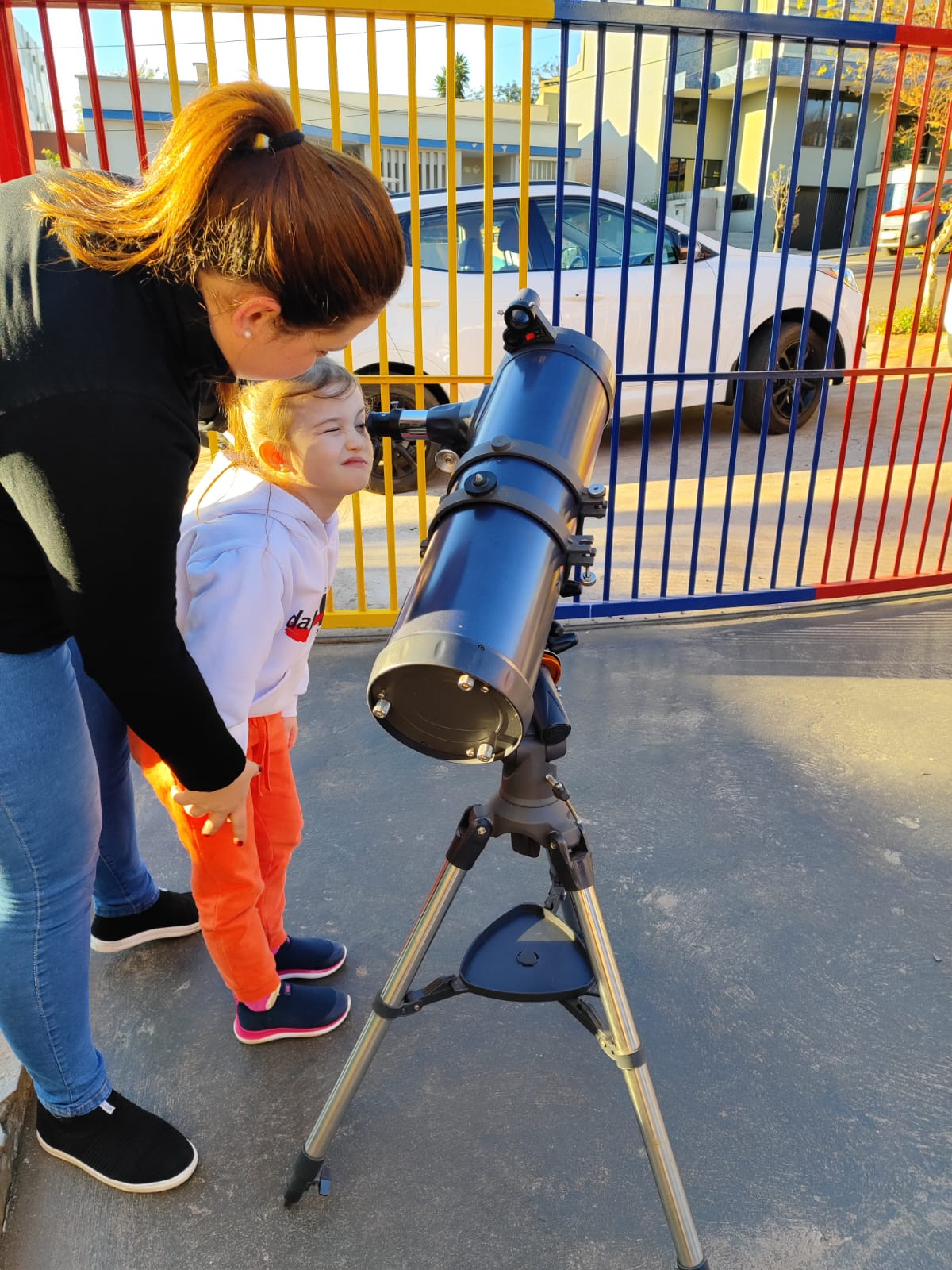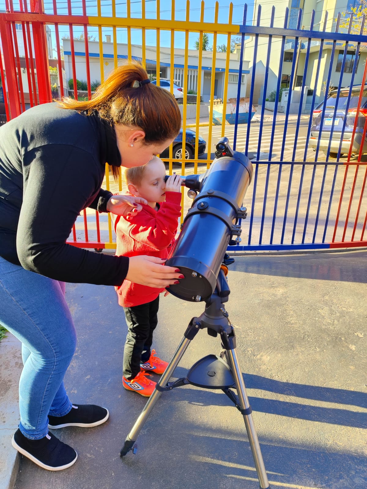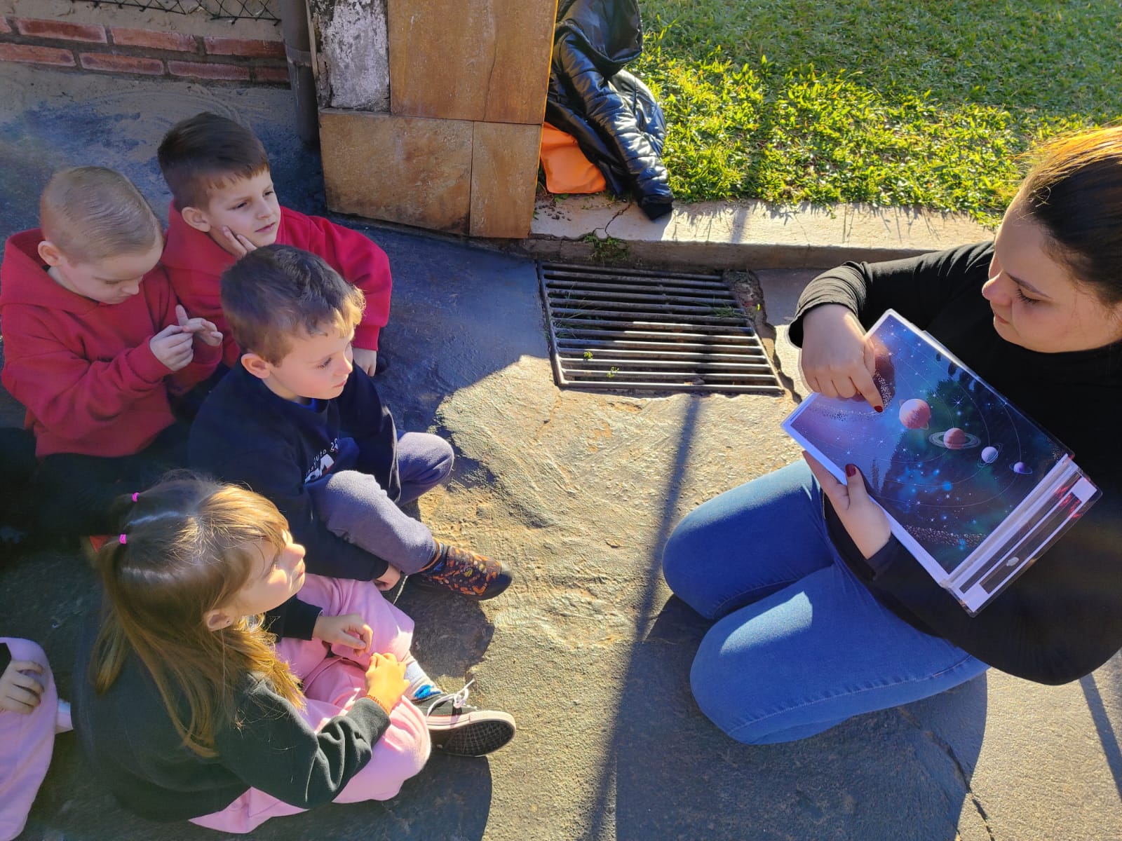 A turma da pré-escola 05 anos da professora Amanda durante a Sequência Didática "Viagem ao Universo” foi convidada a observar um telescópio e entender como este equipamento é usado nas pesquisas. Neste momento recebemos a Professora de Física Daniela (mamãe do nosso colega de turma) que demonstrou aos alunos o equipamento, e nos trouxe várias curiosidades sobre o universo. Confira alguns registros desse momento.