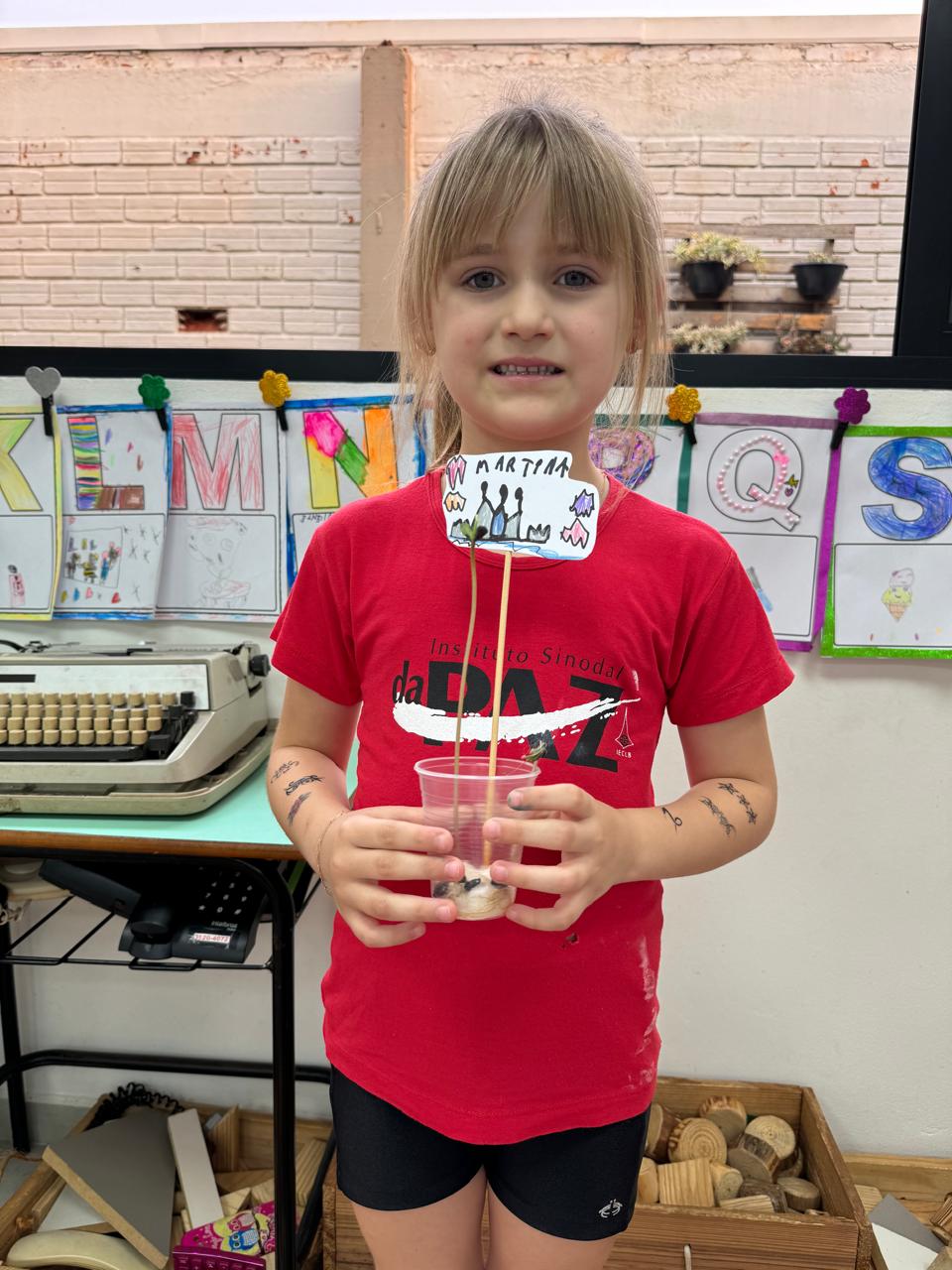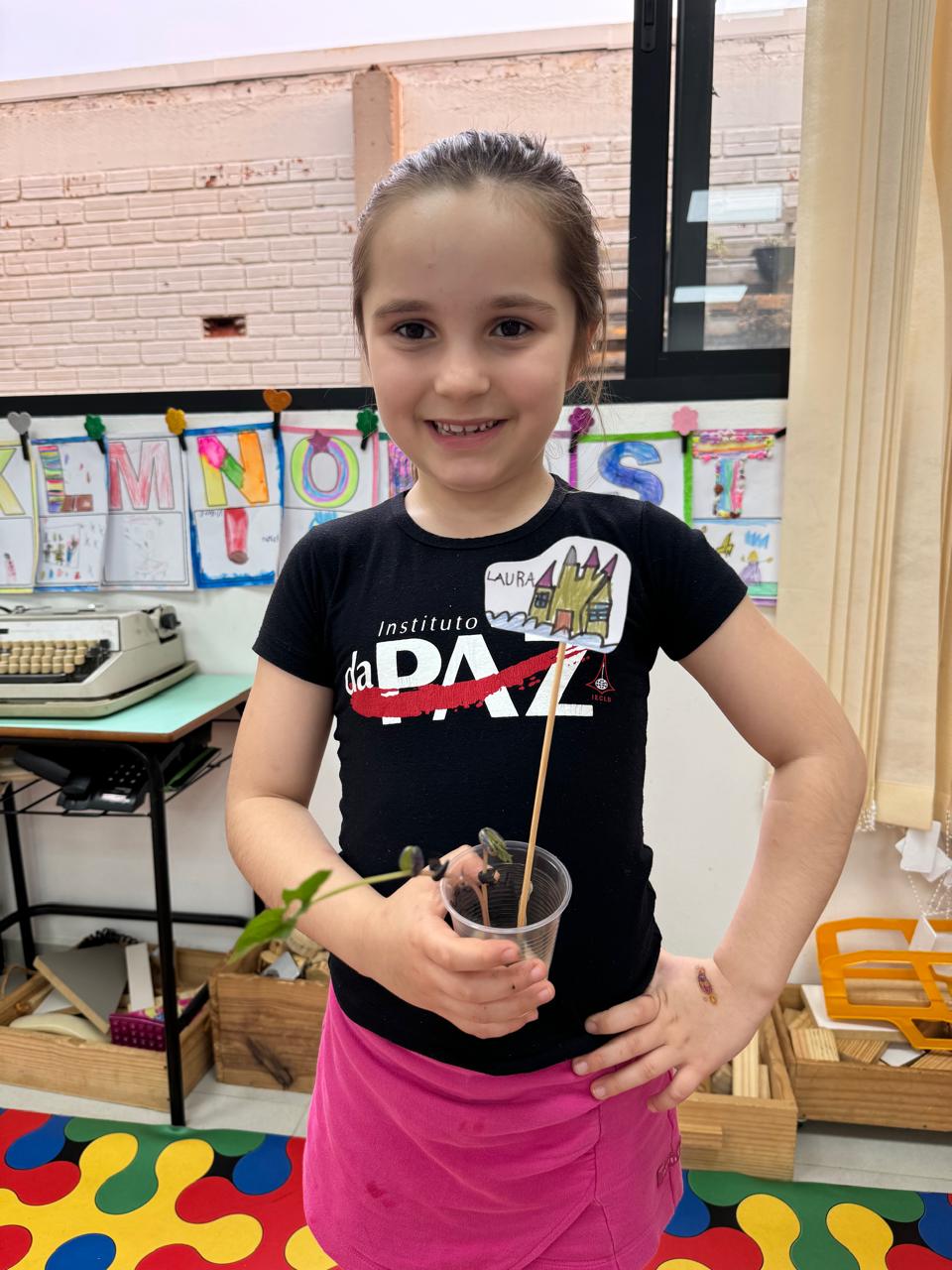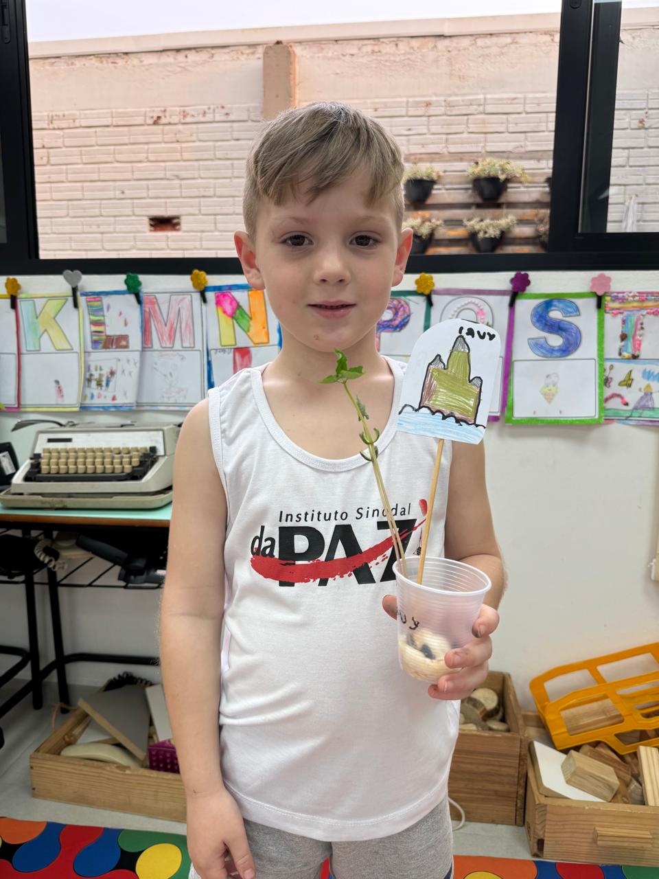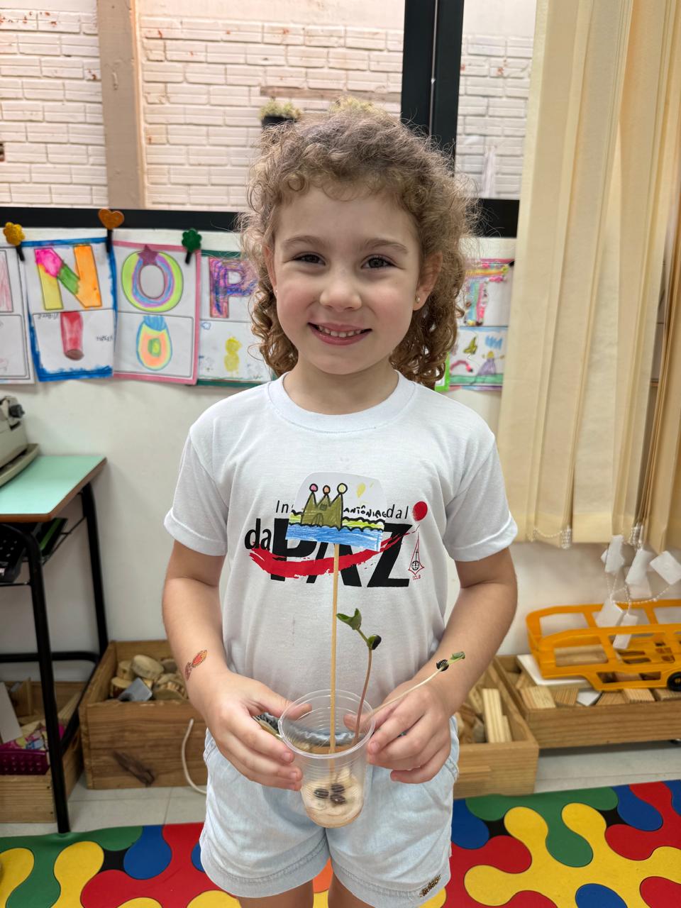 Didática "Livro de histórias coletivas do grupo" escutaram a história João e o pé de feijão, em seguida, as crianças realizaram uma experiência plantando grãos de feijão em copinhos com algodão. Confira alguns registros desse momento.