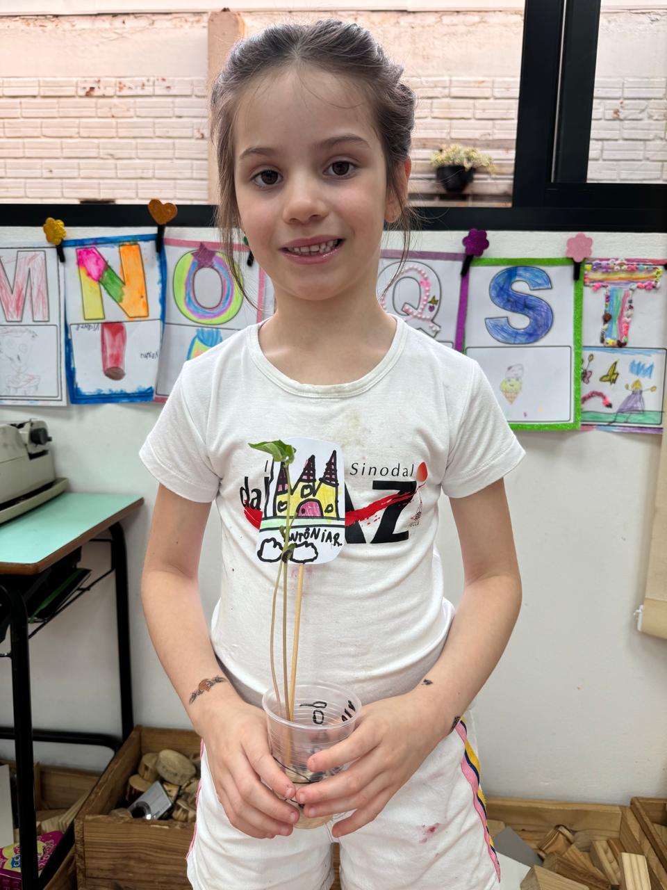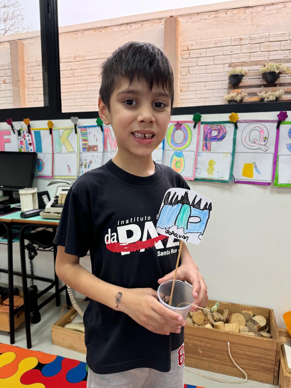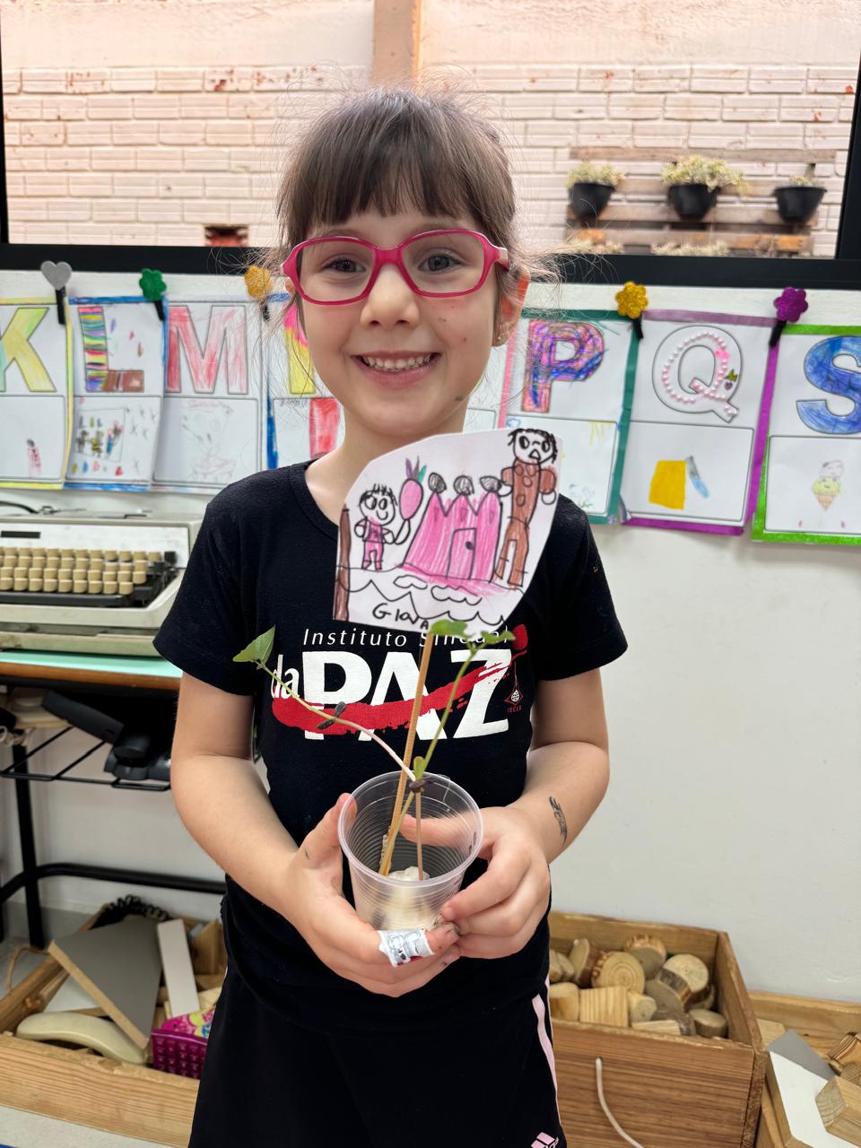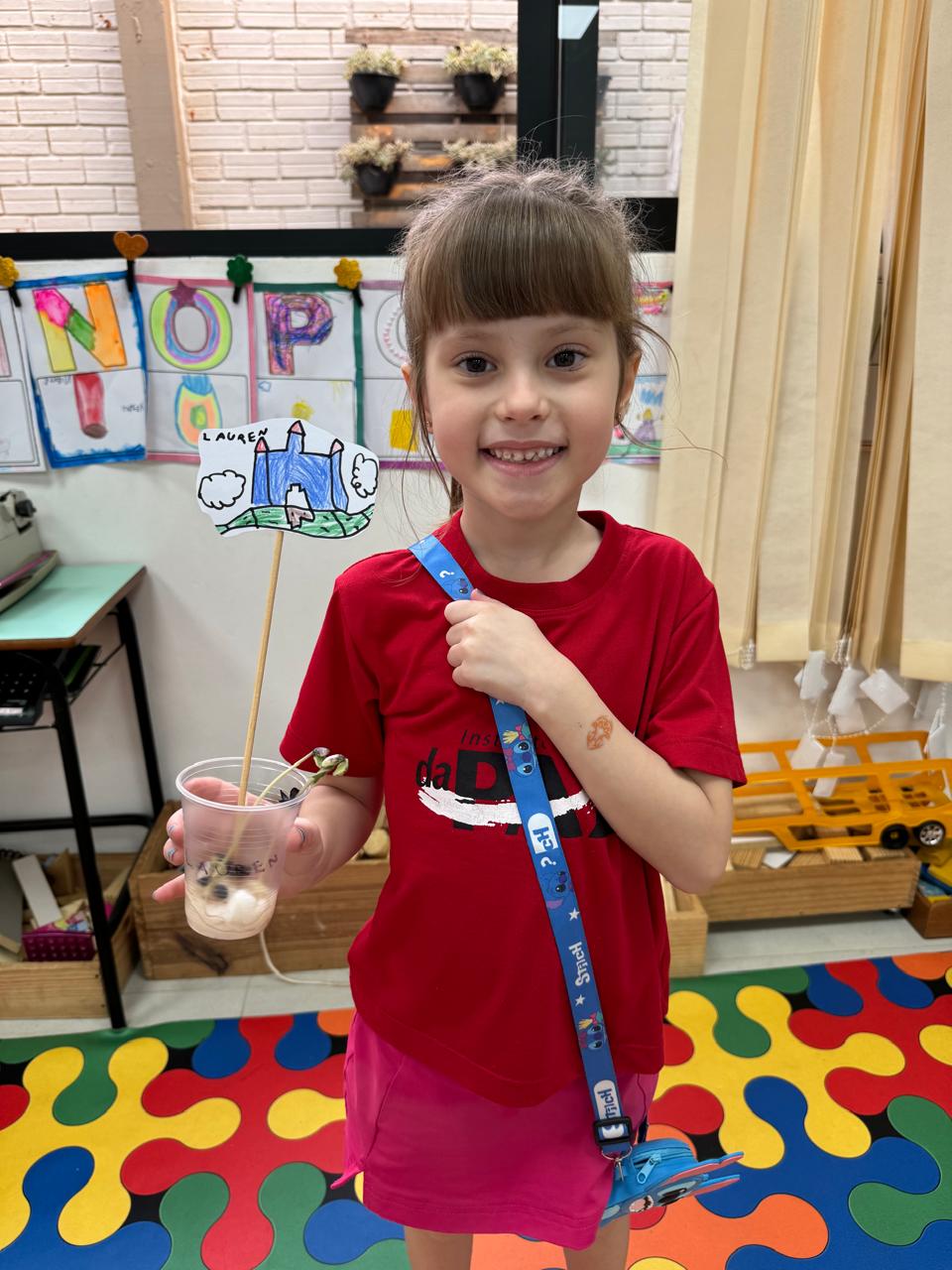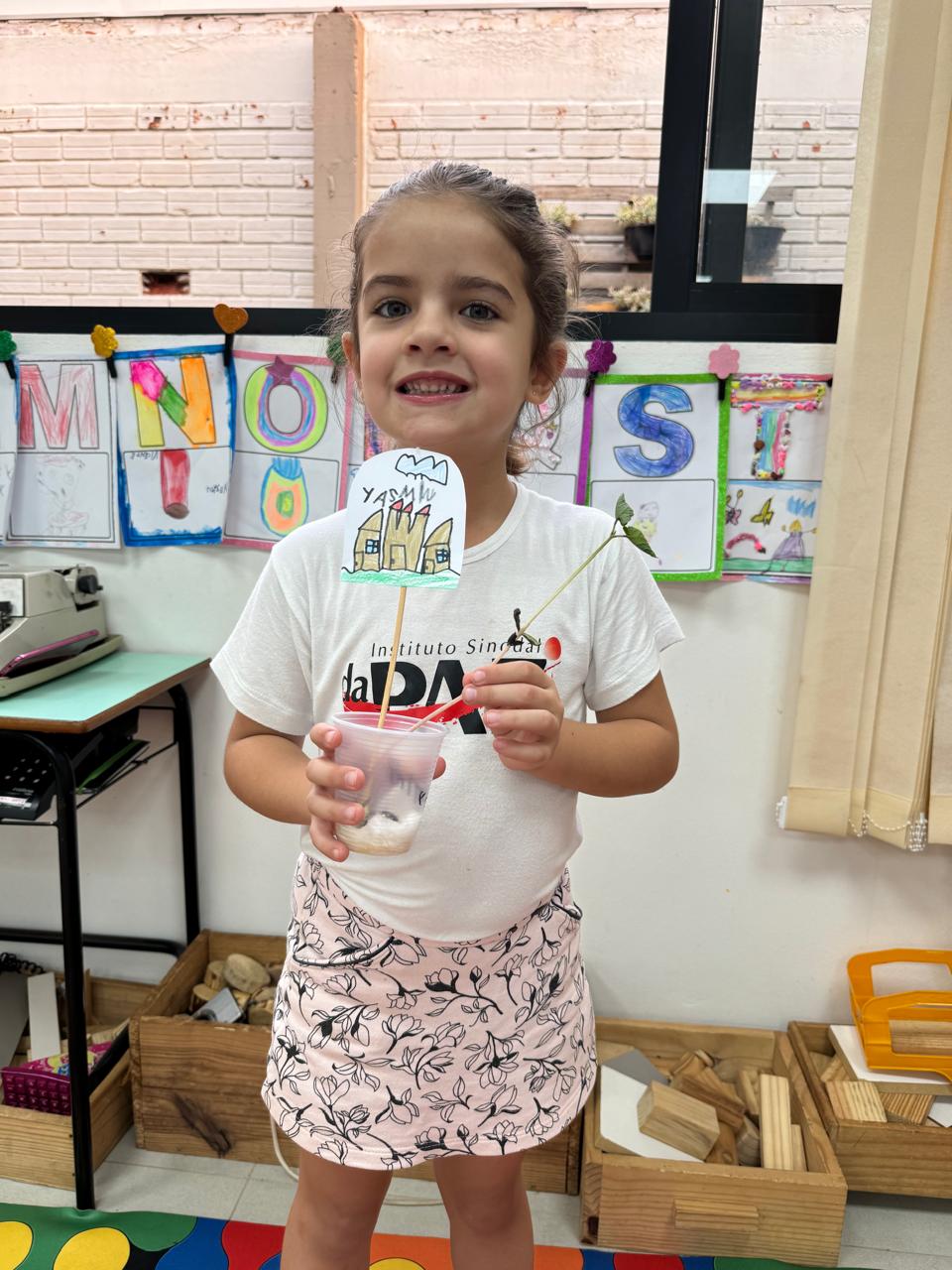Didática "Livro de histórias coletivas do grupo" escutaram a história João e o pé de feijão, em seguida, as crianças realizaram uma experiência plantando grãos de feijão em copinhos com algodão. Confira alguns registros desse momento.