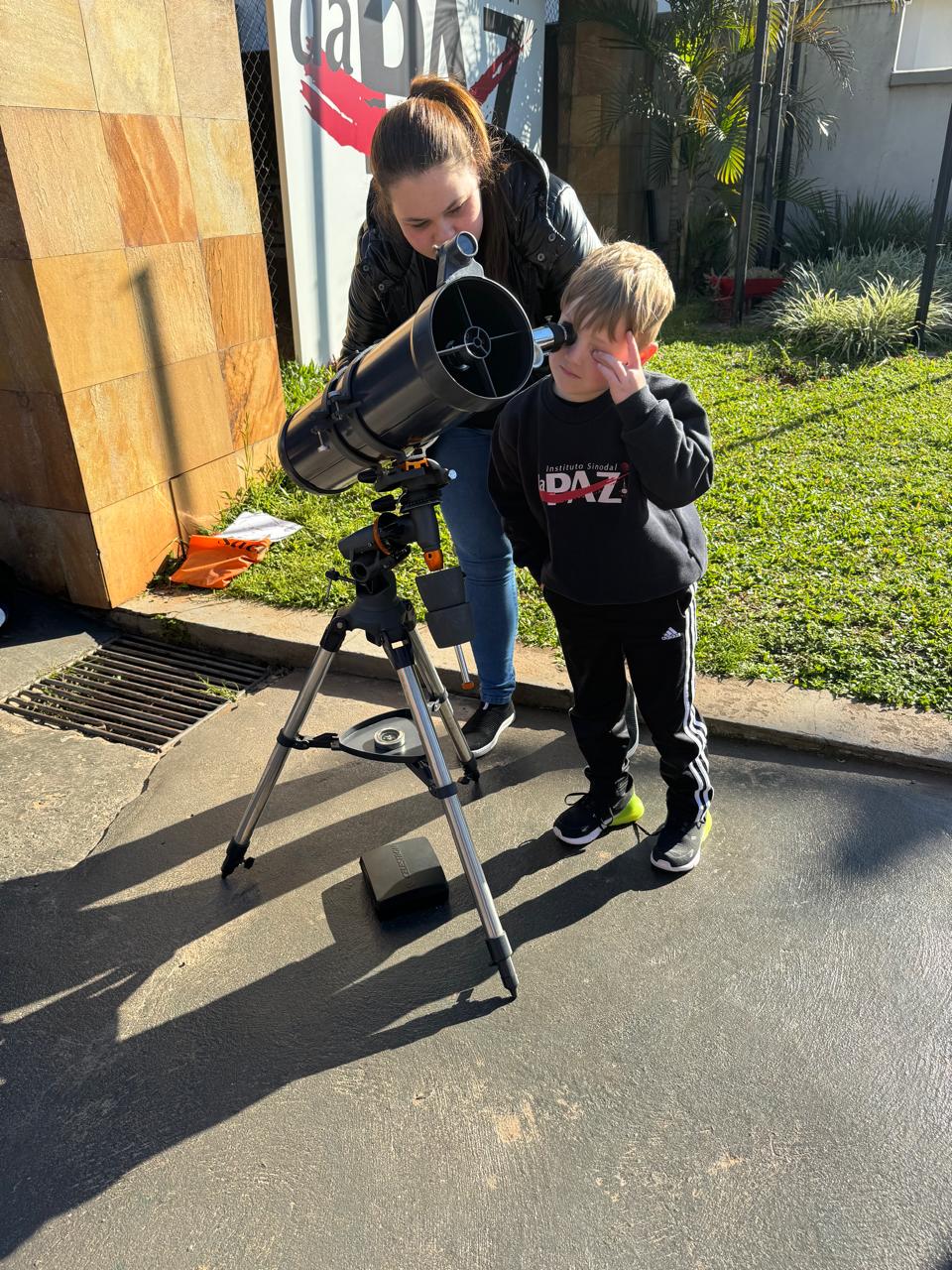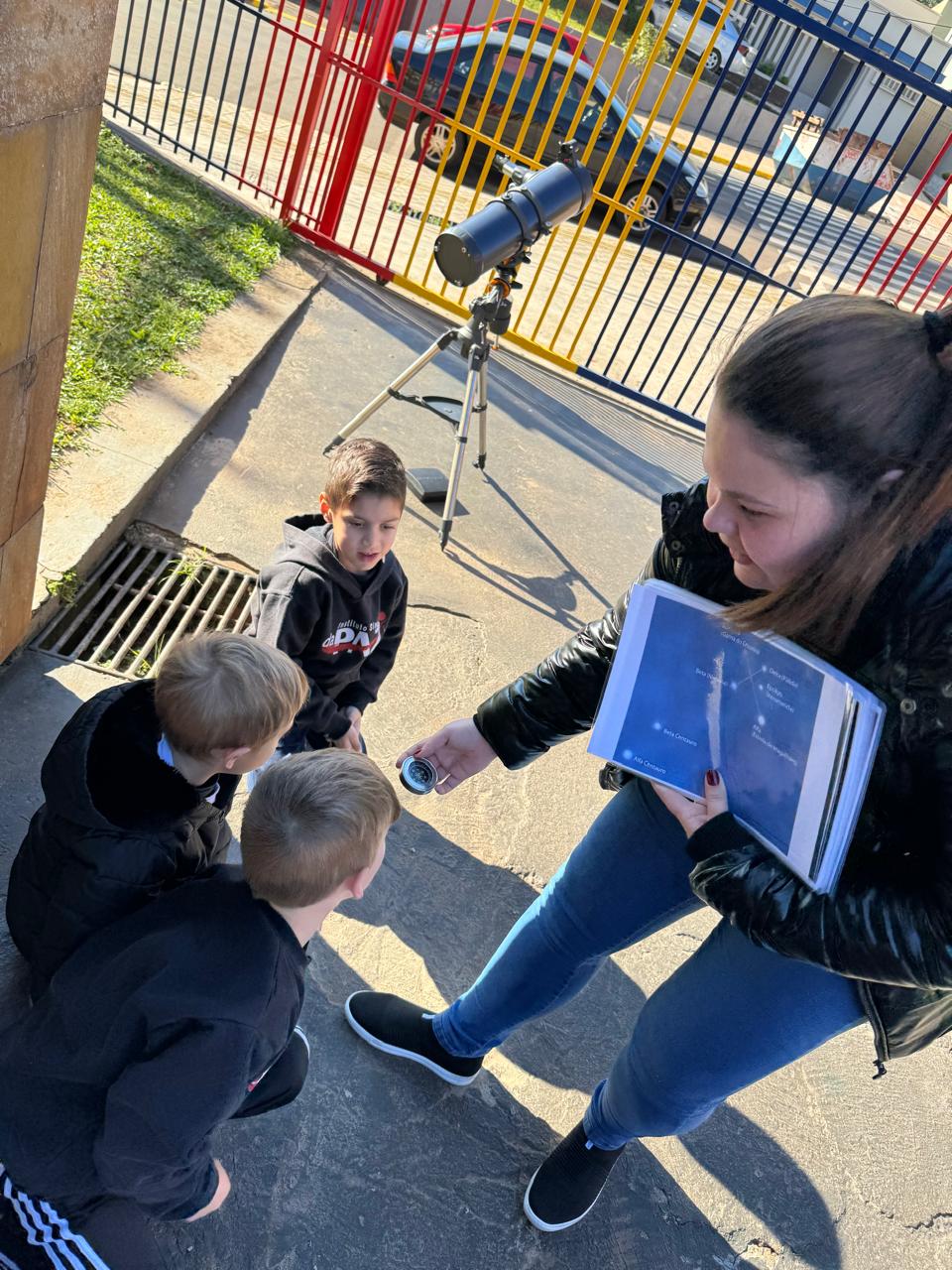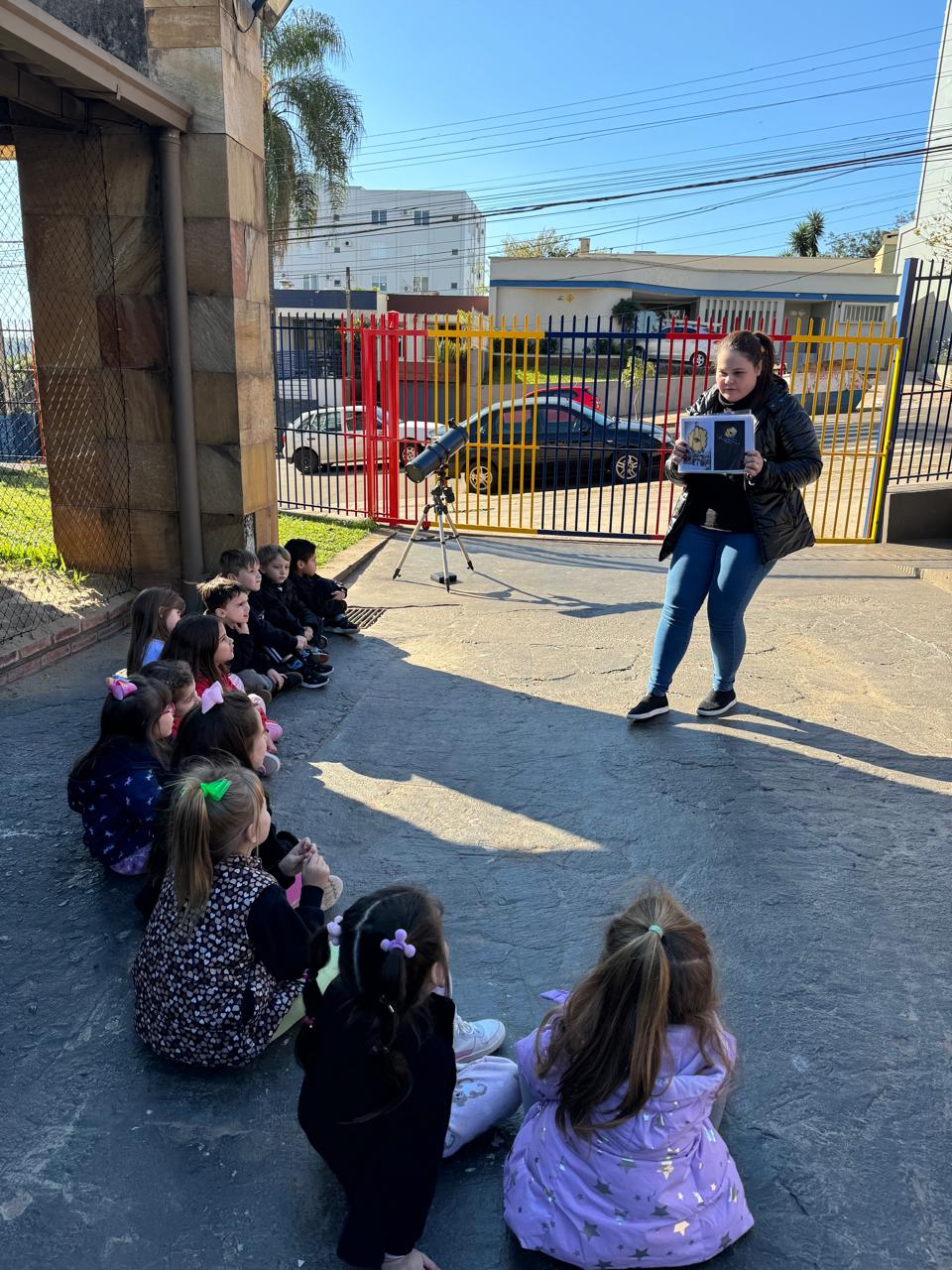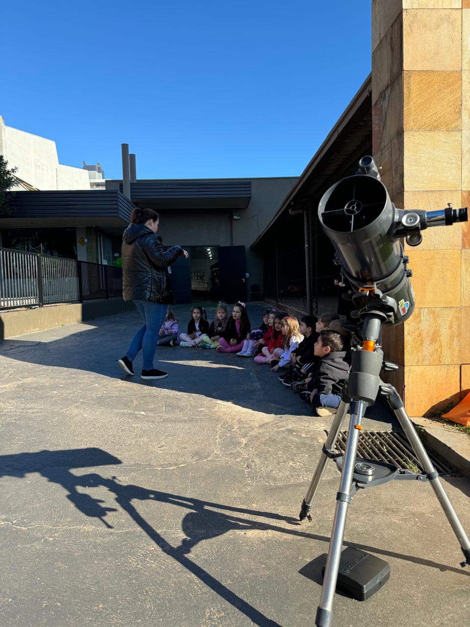 A turma da pré-escola 05 anos da professora Ana Paula durante a Sequência Didática "Viagem ao Universo” foi convidada a observar um telescópio e entender como este equipamento é usado nas pesquisas. Neste momento recebemos a Professora de Física Daniela que demonstrou aos alunos o equipamento, e nos trouxe várias curiosidades sobre o universo. Confira alguns registros desse momento.