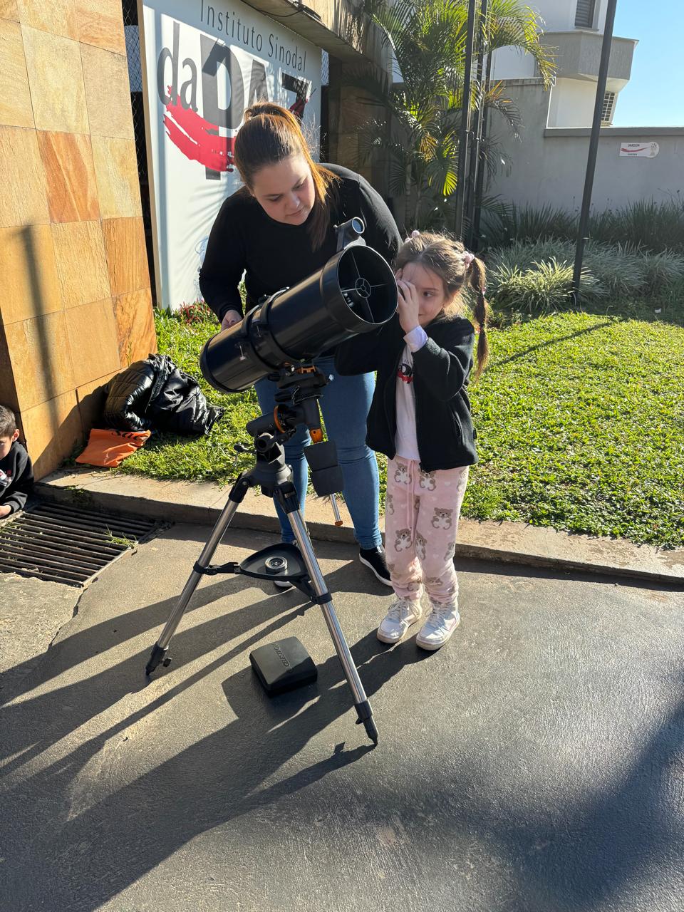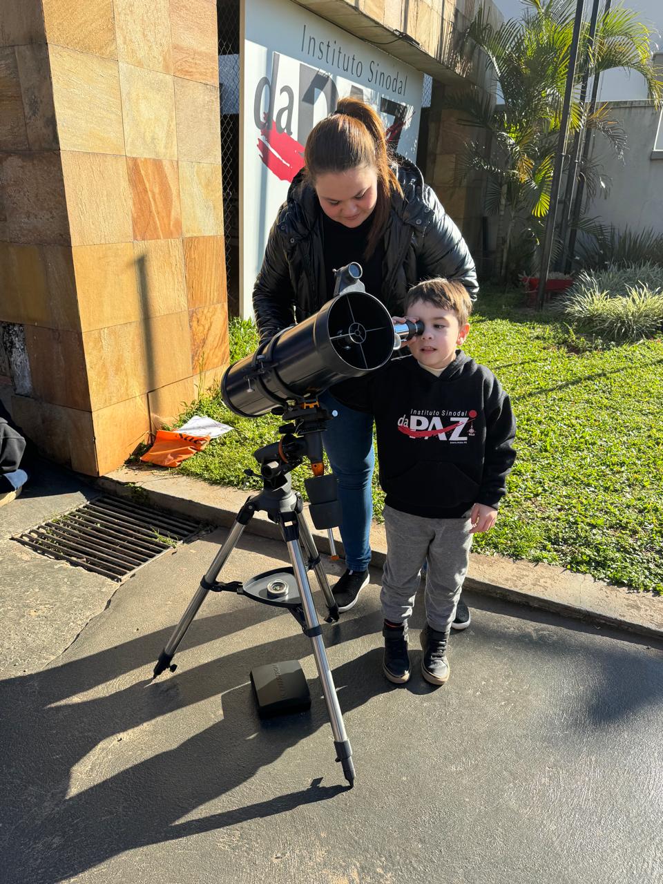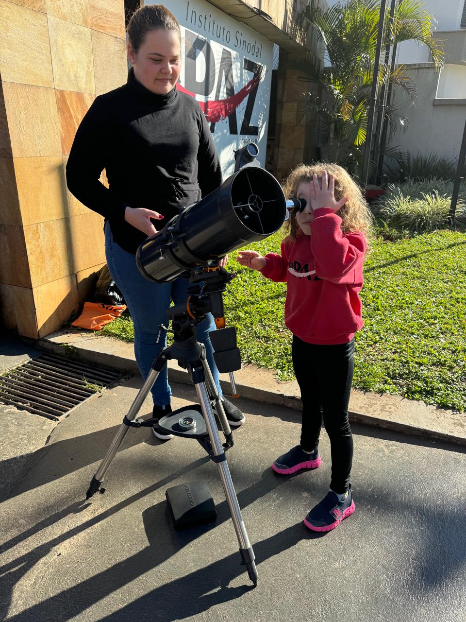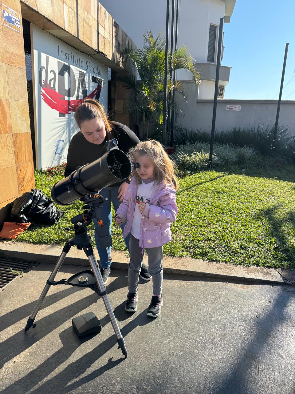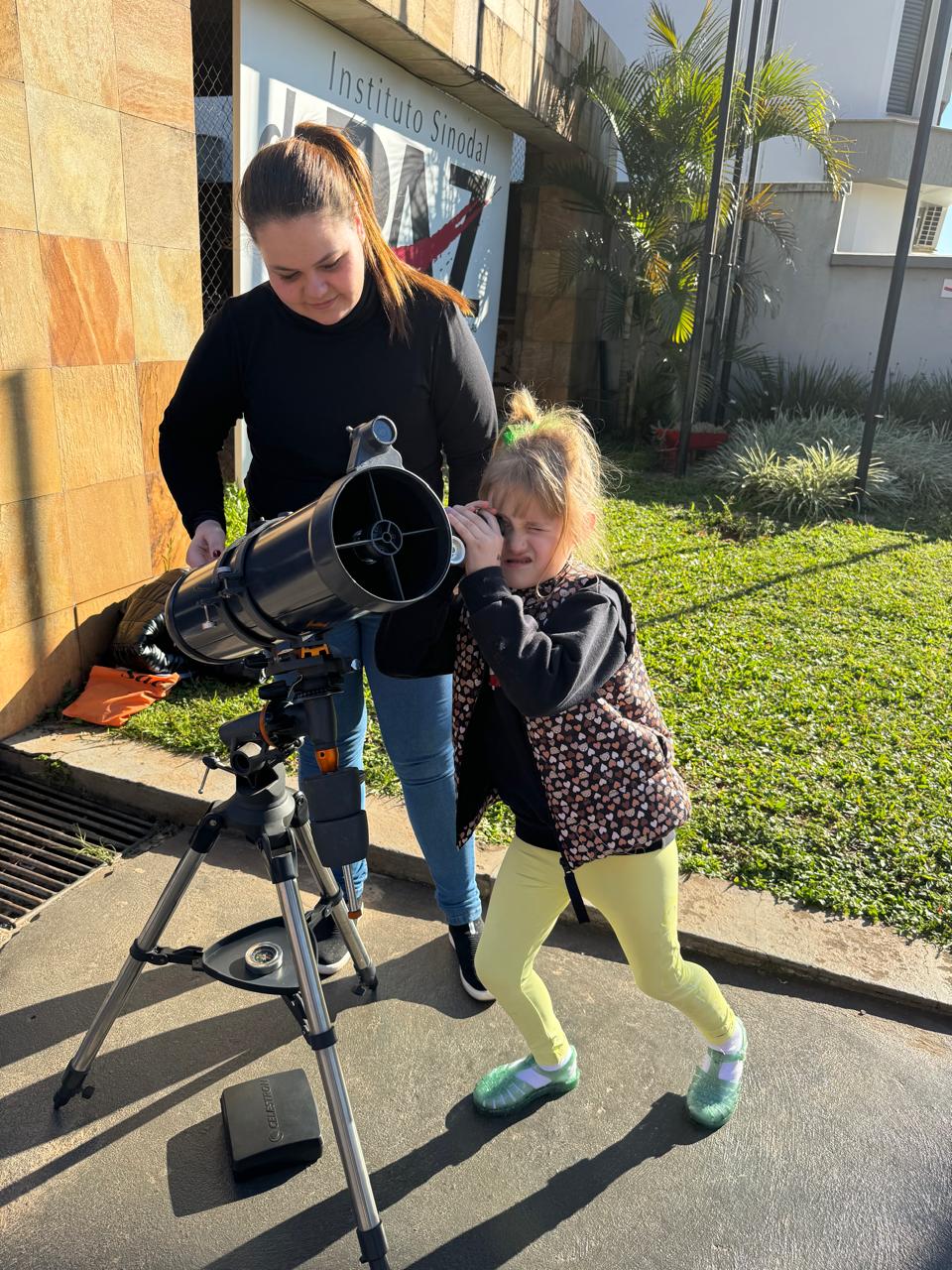 A turma da pré-escola 05 anos da professora Ana Paula durante a Sequência Didática "Viagem ao Universo” foi convidada a observar um telescópio e entender como este equipamento é usado nas pesquisas. Neste momento recebemos a Professora de Física Daniela que demonstrou aos alunos o equipamento, e nos trouxe várias curiosidades sobre o universo. Confira alguns registros desse momento.