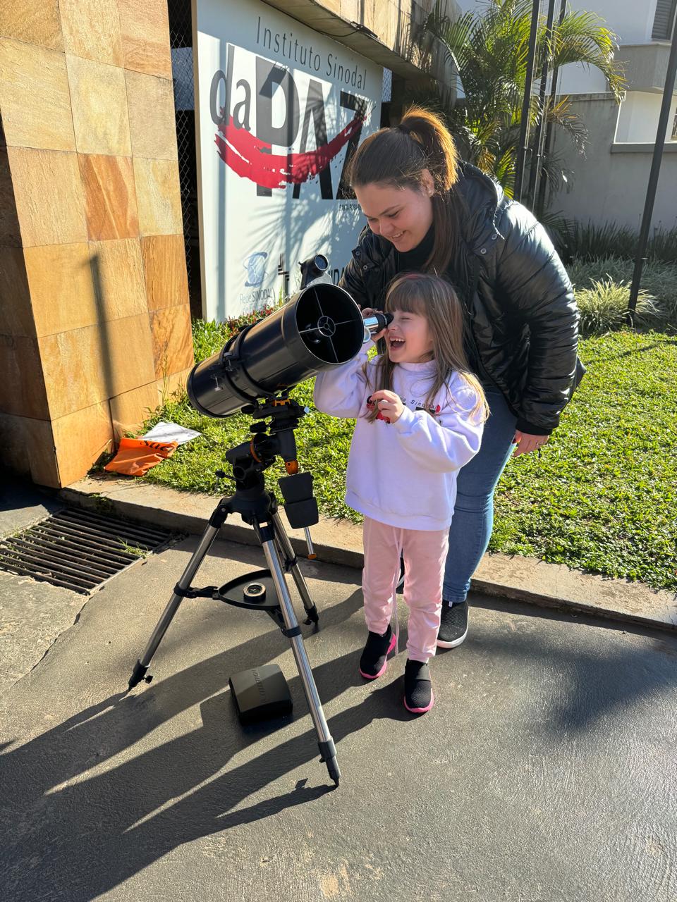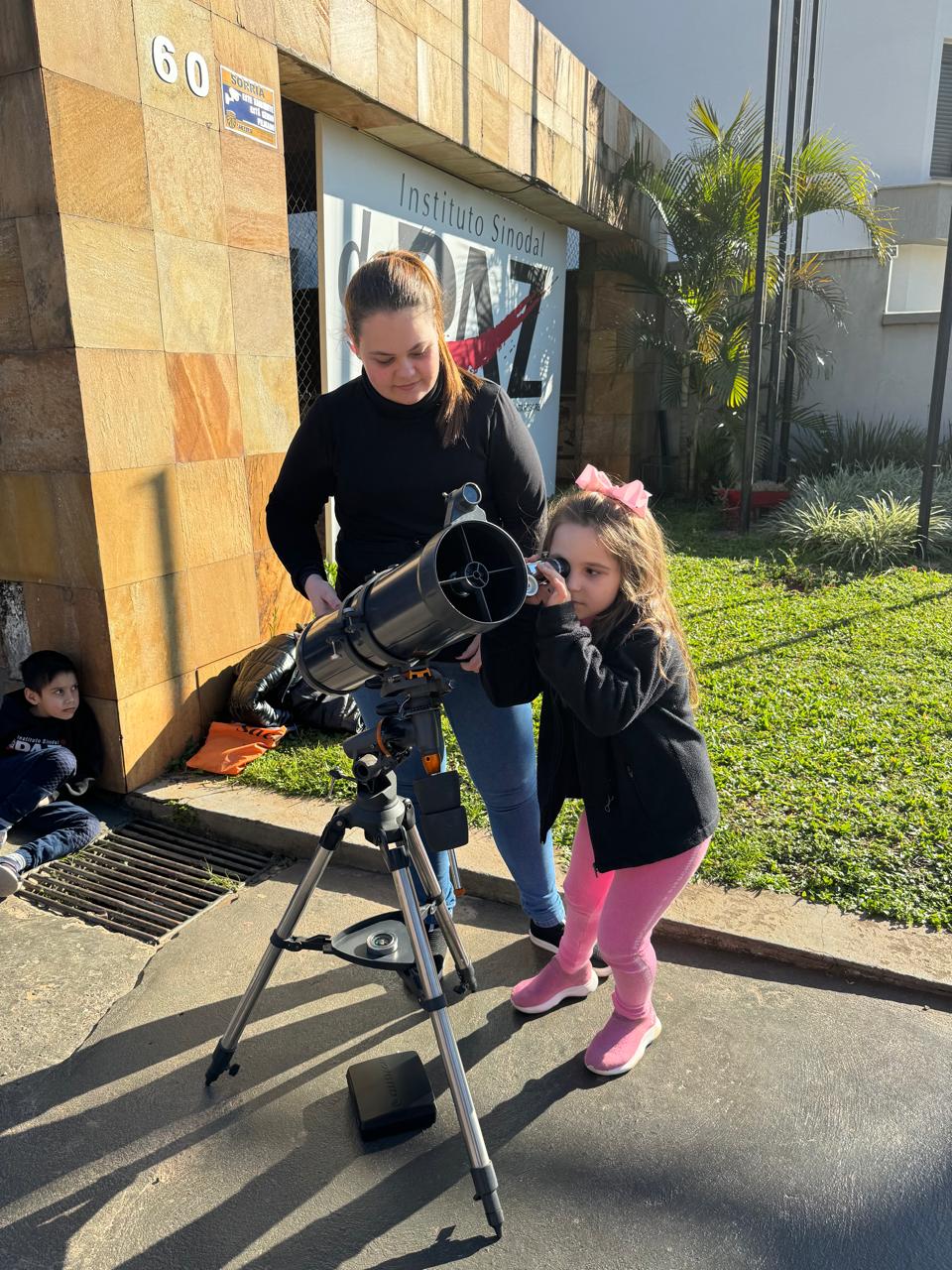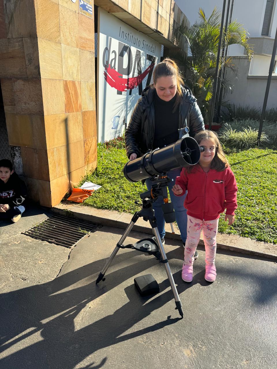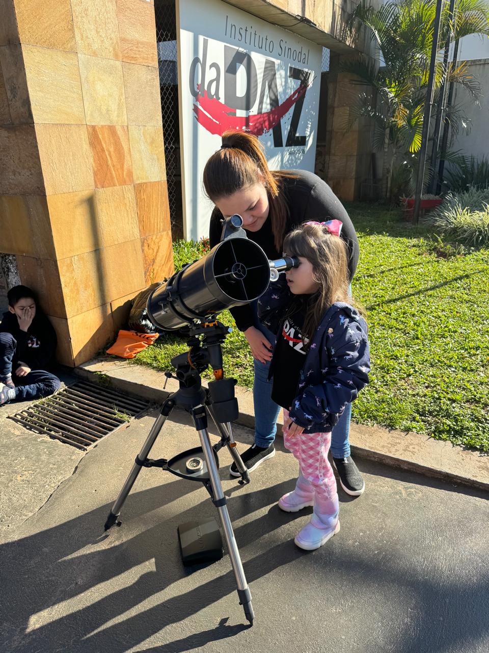 A turma da pré-escola 05 anos da professora Ana Paula durante a Sequência Didática "Viagem ao Universo” foi convidada a observar um telescópio e entender como este equipamento é usado nas pesquisas. Neste momento recebemos a Professora de Física Daniela que demonstrou aos alunos o equipamento, e nos trouxe várias curiosidades sobre o universo. Confira alguns registros desse momento.