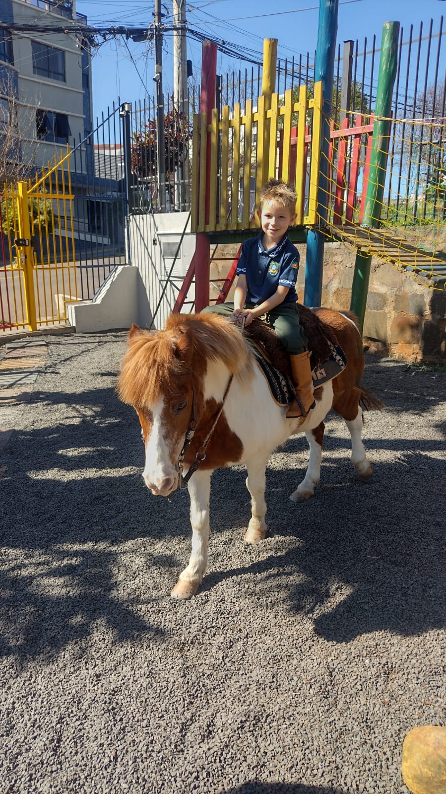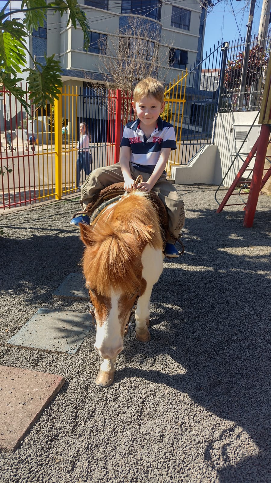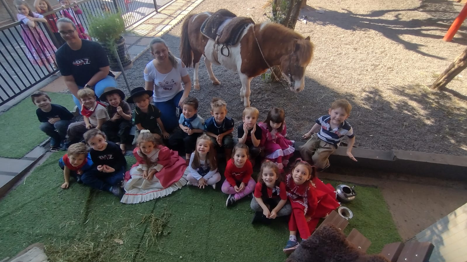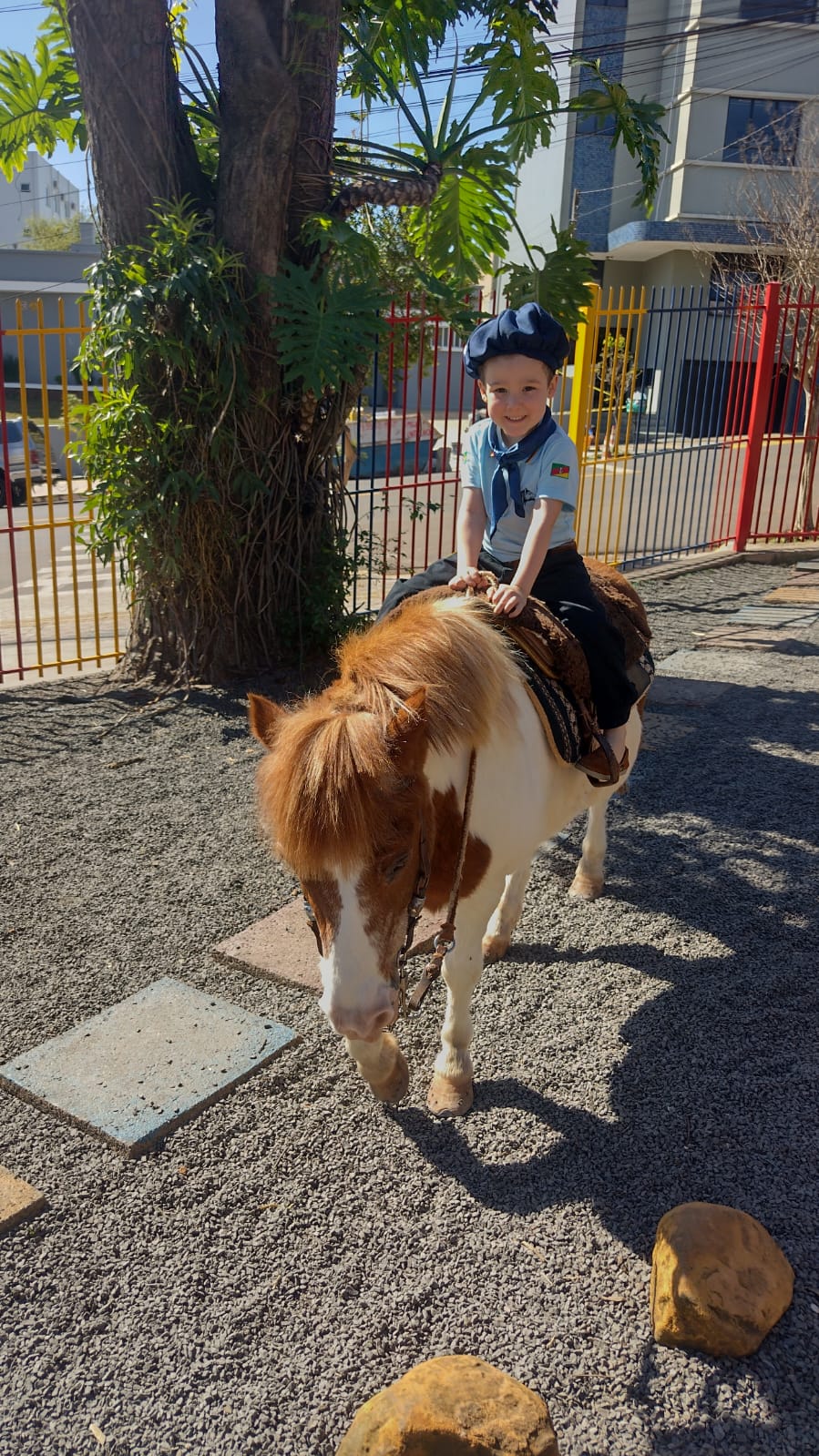 Na Semana Farroupilha, os alunos da Educação Infantil receberam a visita do Cavalo Pipoca, a turma da pré-escola 04 anos T da professora Tamara, se divertiu e aproveitou muito esse momento.