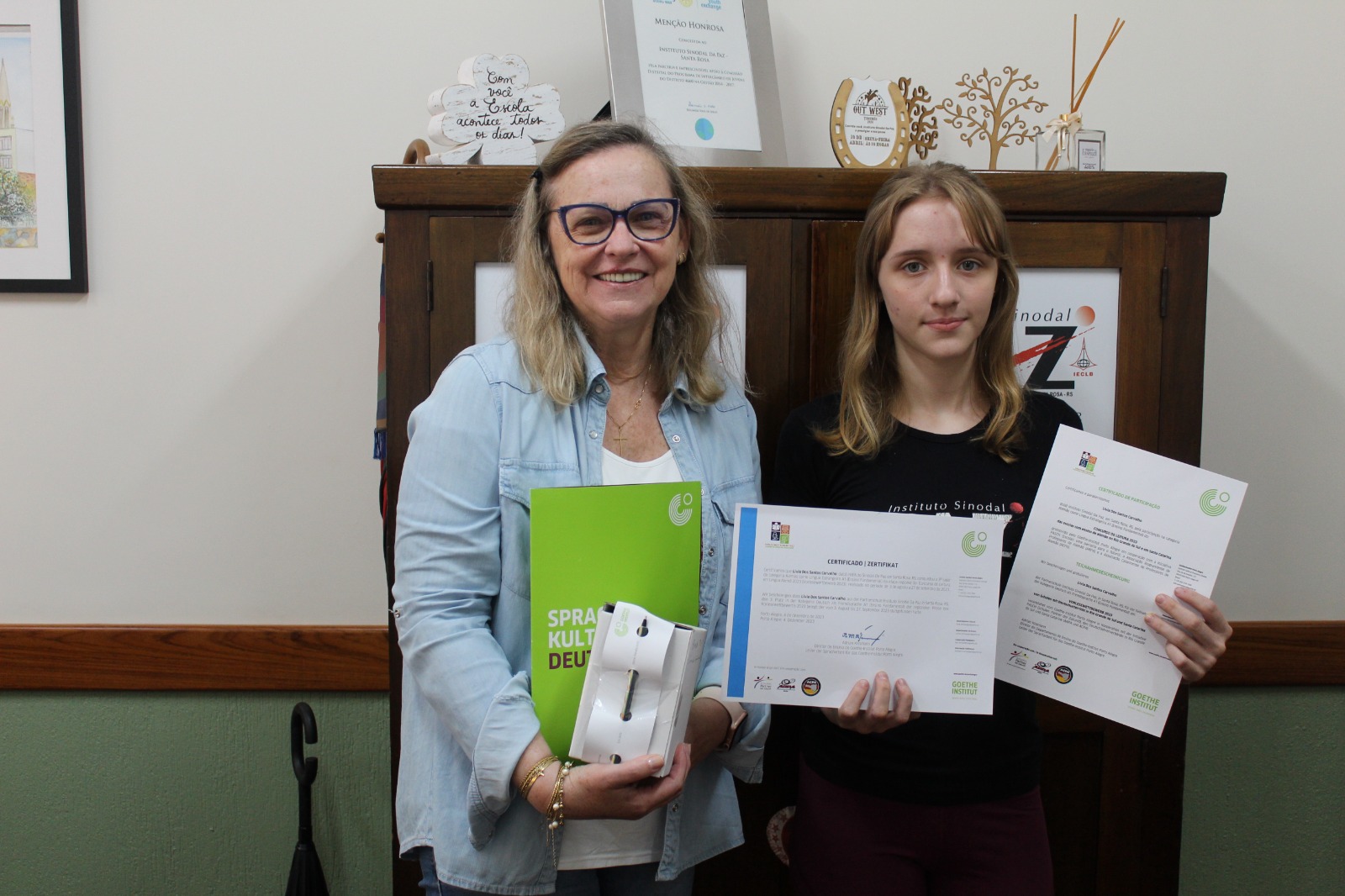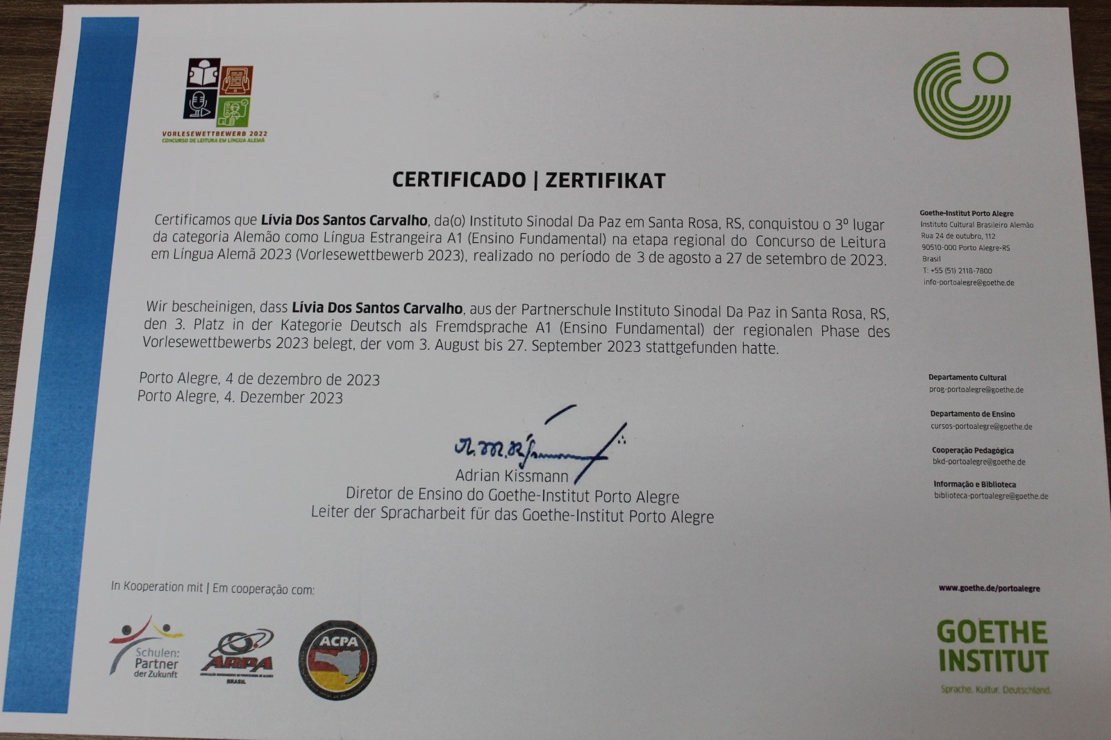 O Instituto Goethe conferiu a aluna do Da Paz, Lívia dos Santos Carvalho, o certificado de 3º lugar da categoria Alemão como Língua Estrangeira, categoria Ensino Fundamental. A conquista foi na etapa regional do Concurso de Leitura de Língua Alemã de 2023.