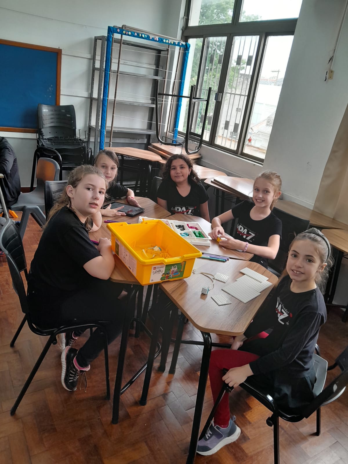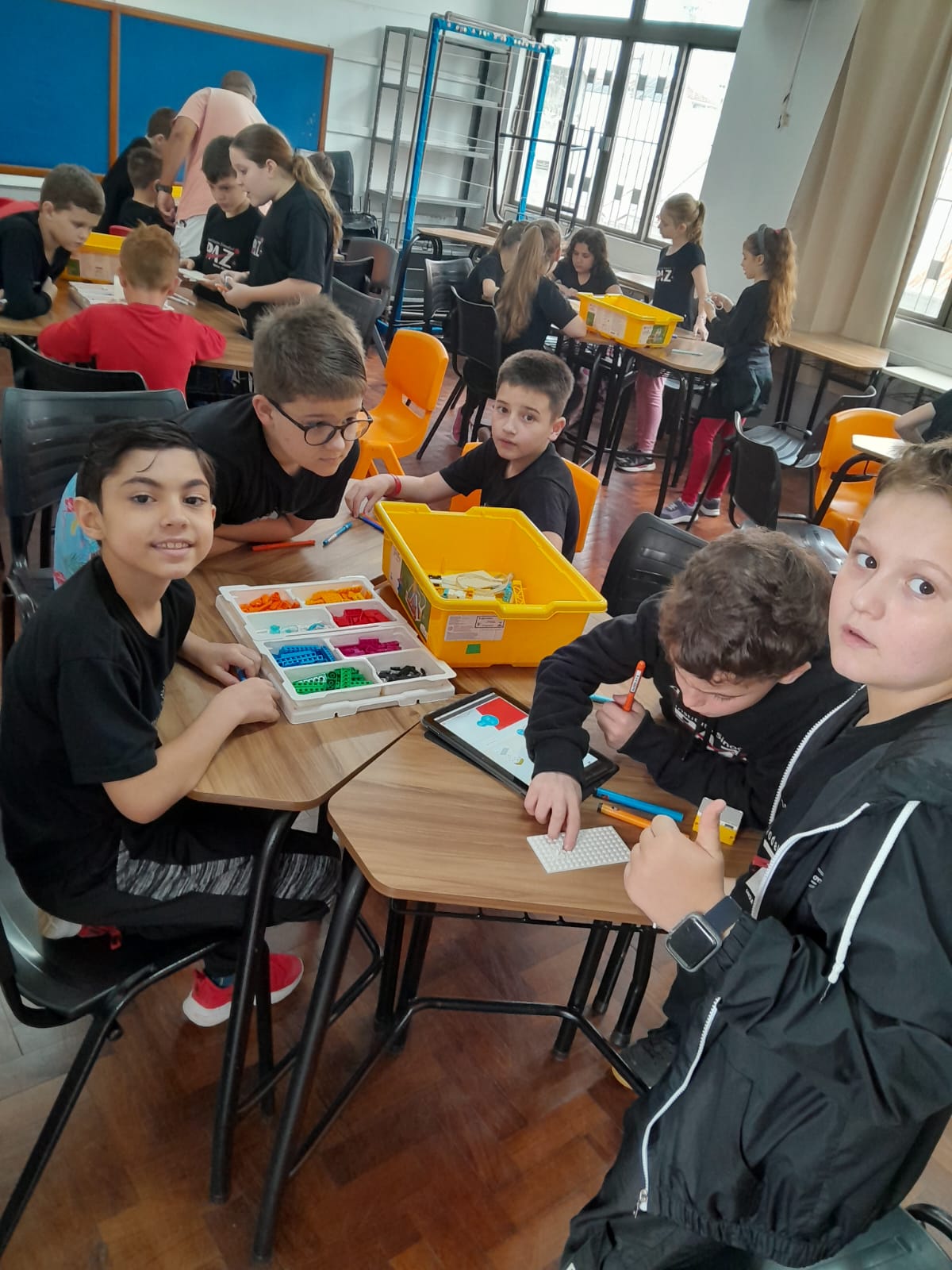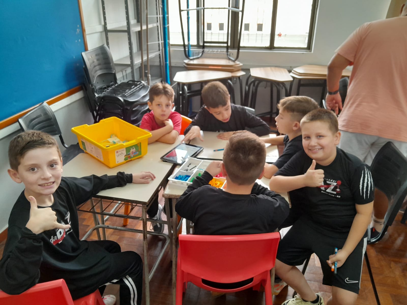 Turma do 3⁰ ano R se desafiando, em grupos, na Oficina de Robótica - ROBOMIND.
