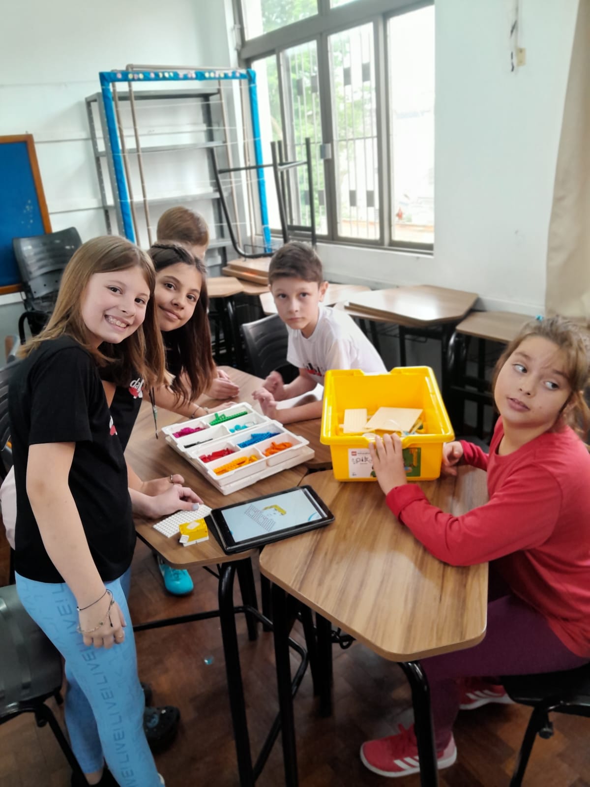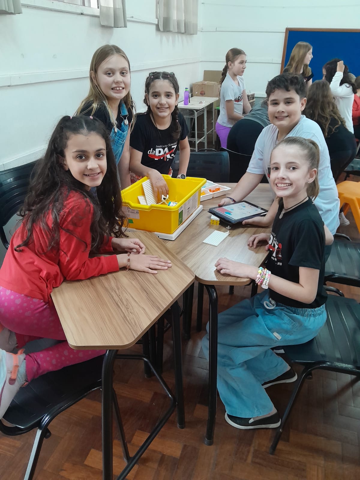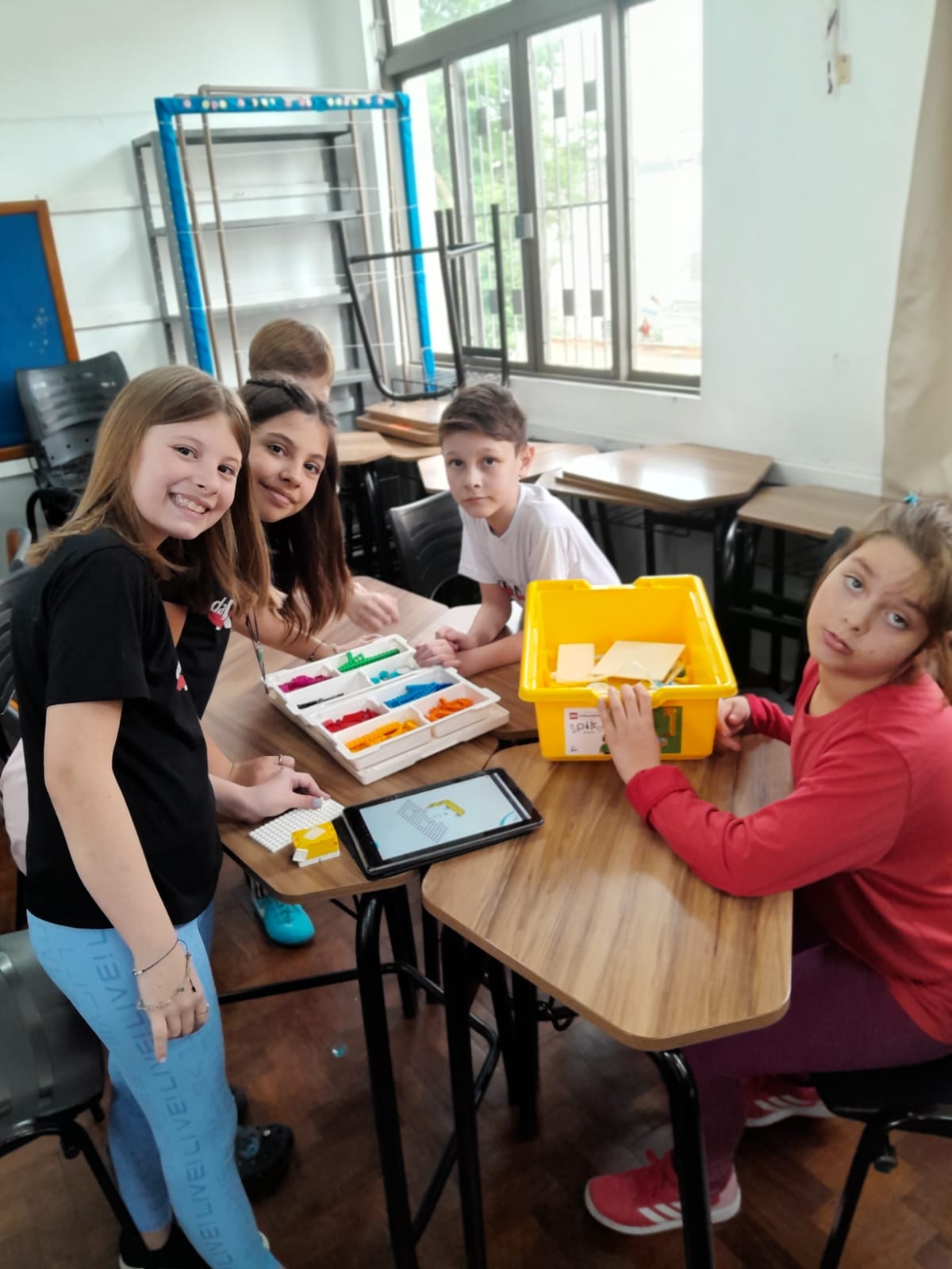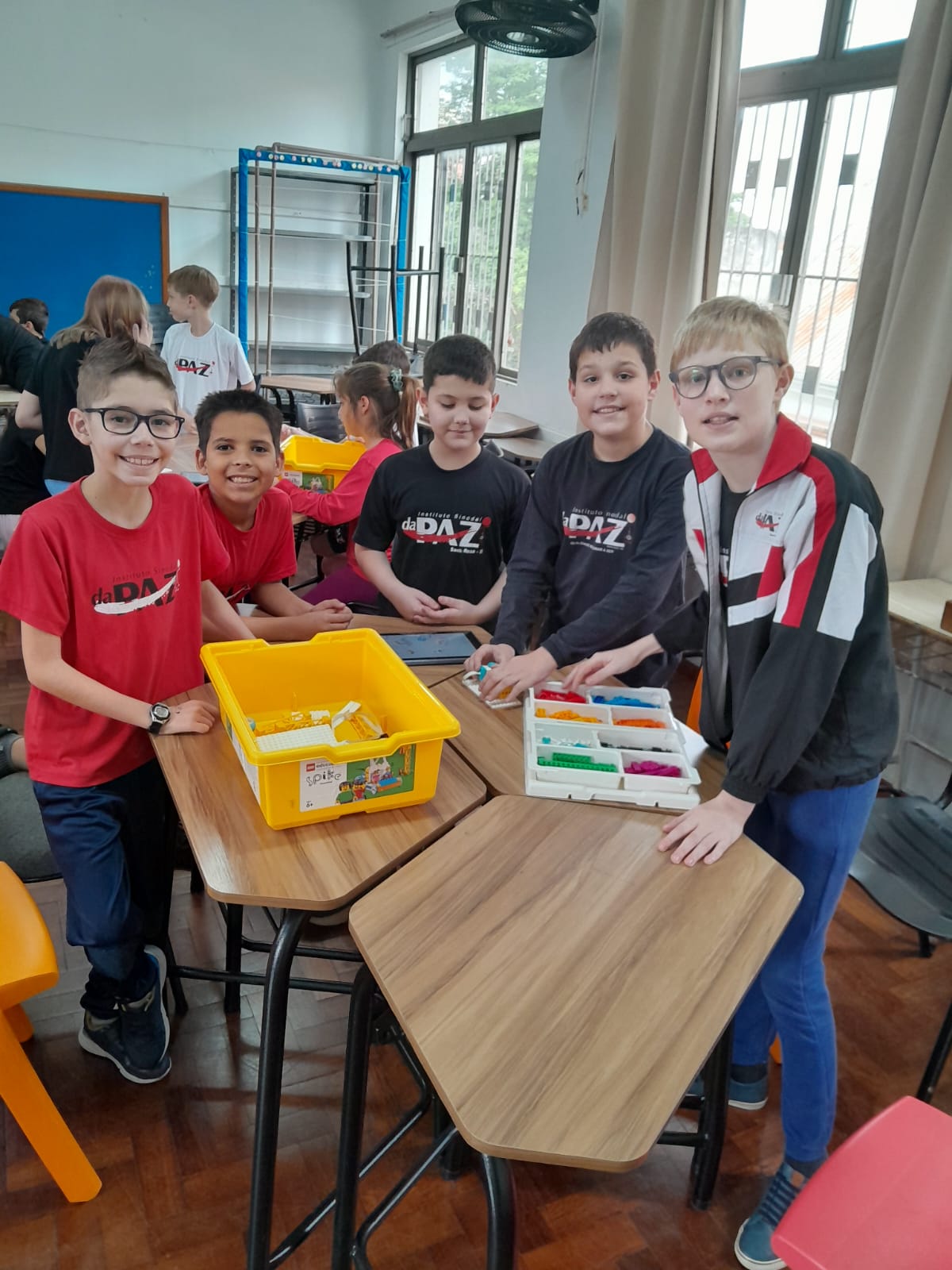 Turma do 4⁰ ano M se desafiando, em grupos, na Oficina de Robótica - ROBOMIND.