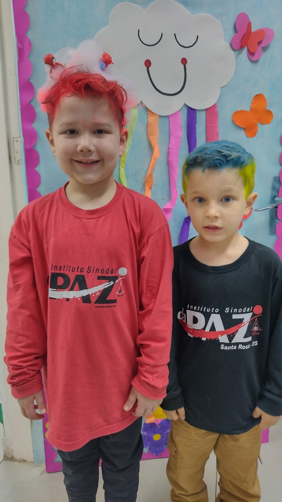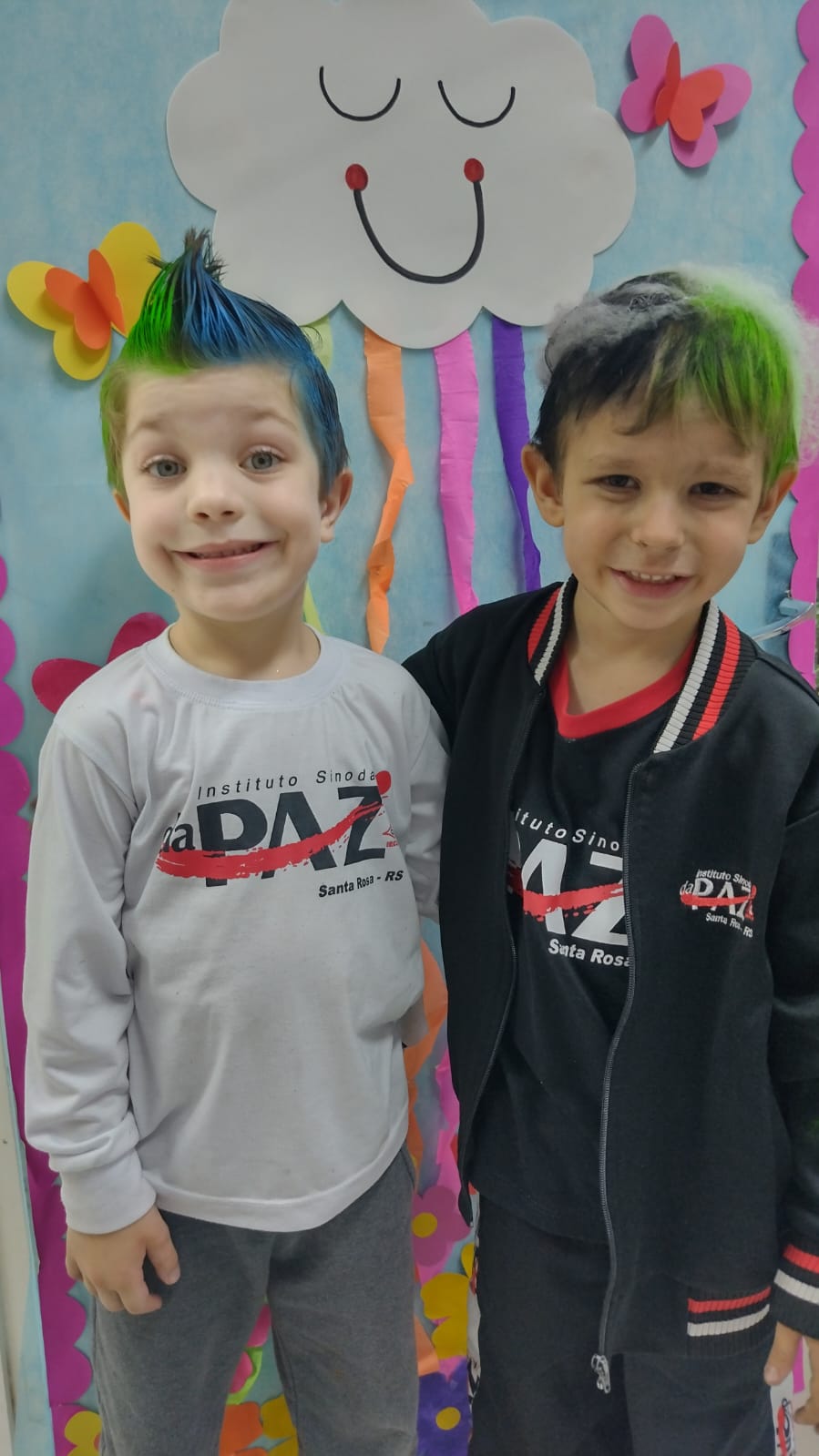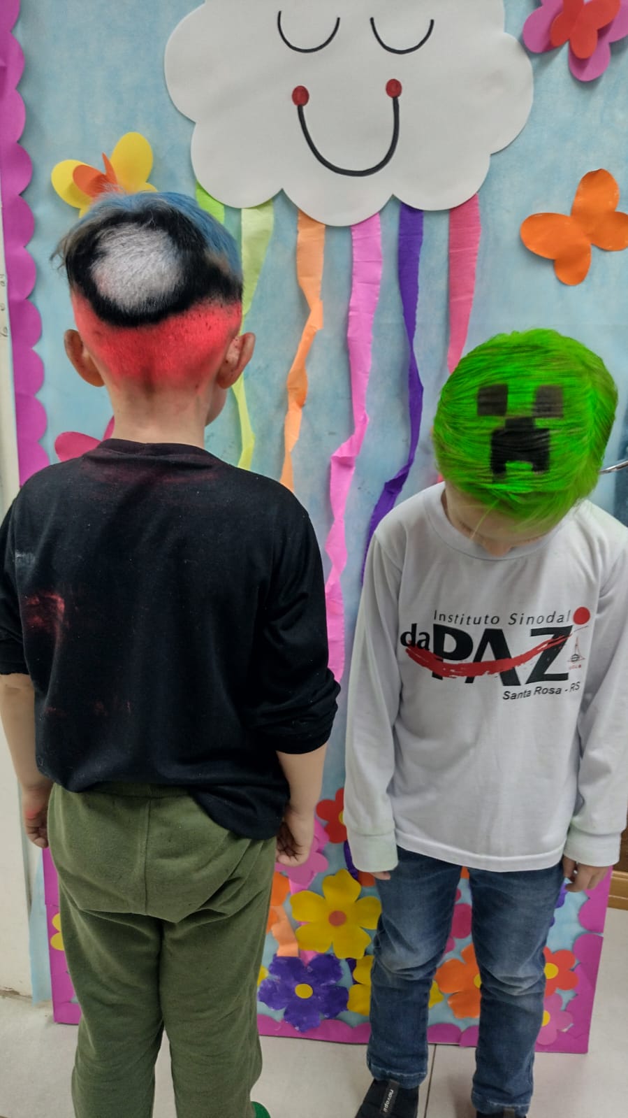 Os alunos da turma 04 anos T, da professora Tamara, puderam inventar junto com sua família, um cabelo com acessórios, spray e muita diversão no "Dia do cabelo maluco" da Educação infantil.