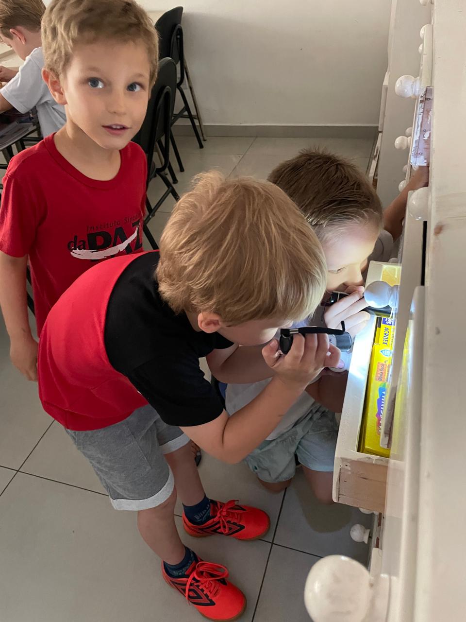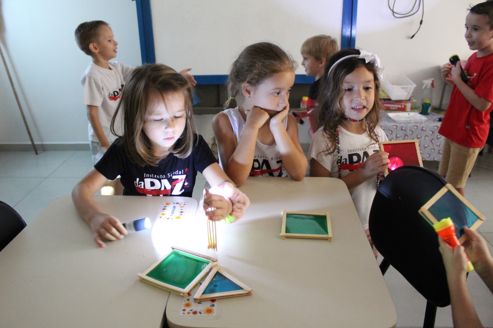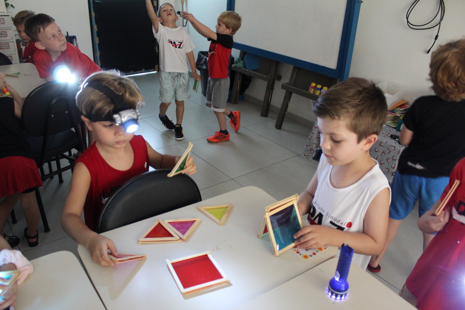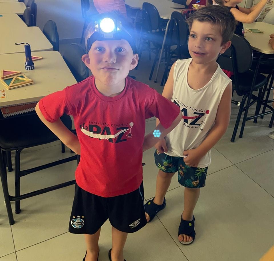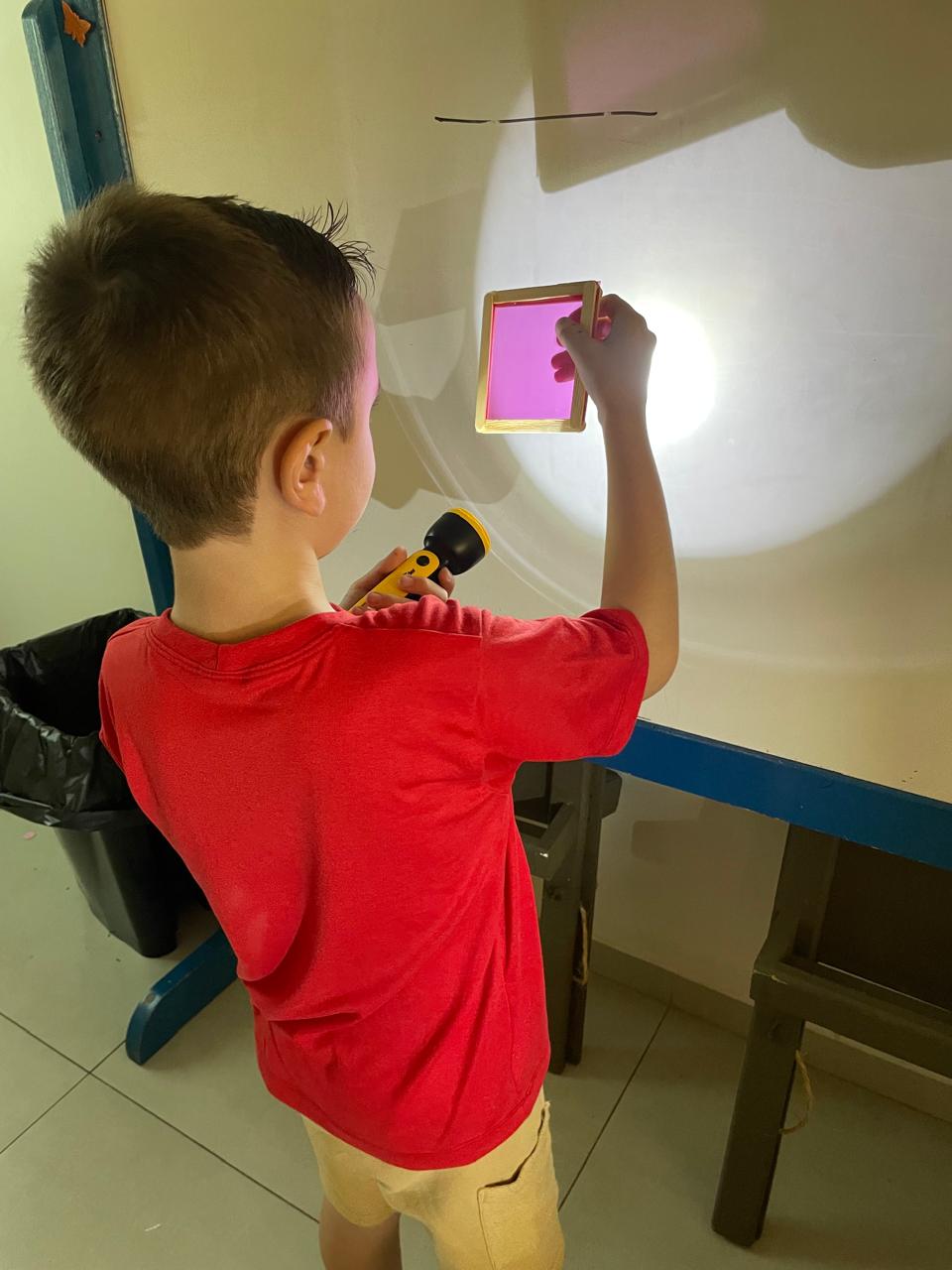Durante a Sequência Didática, exploraram os efeitos da luz e da sombra usando lanternas e papel celofane plastificado. As cores se misturaram, criando um verdadeiro espetáculo visual!