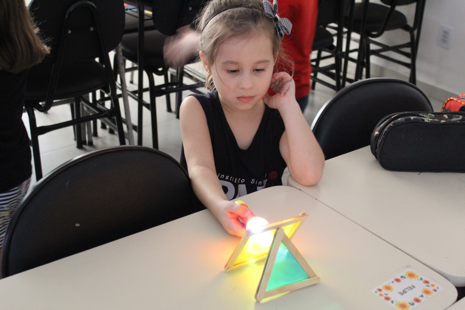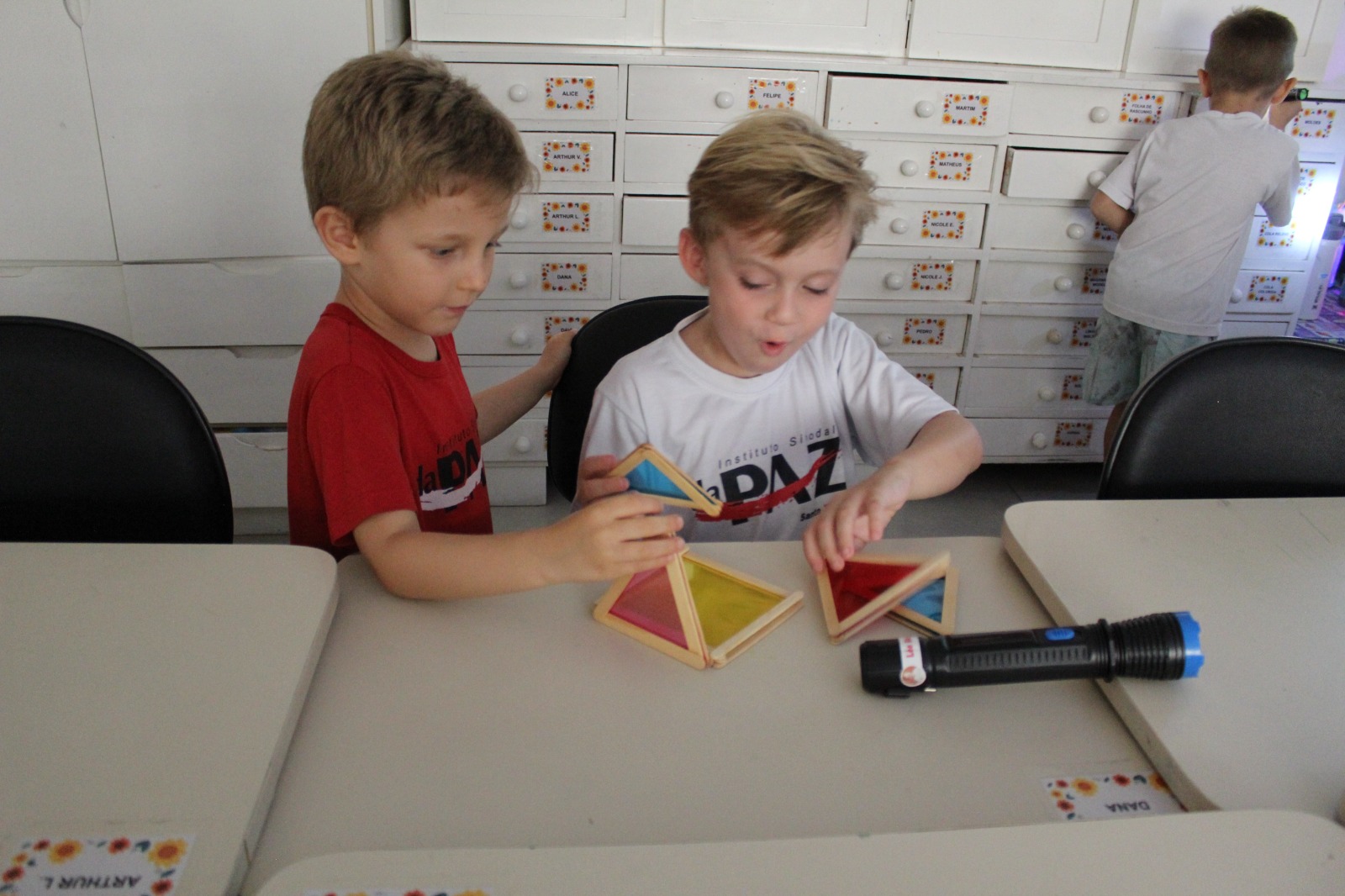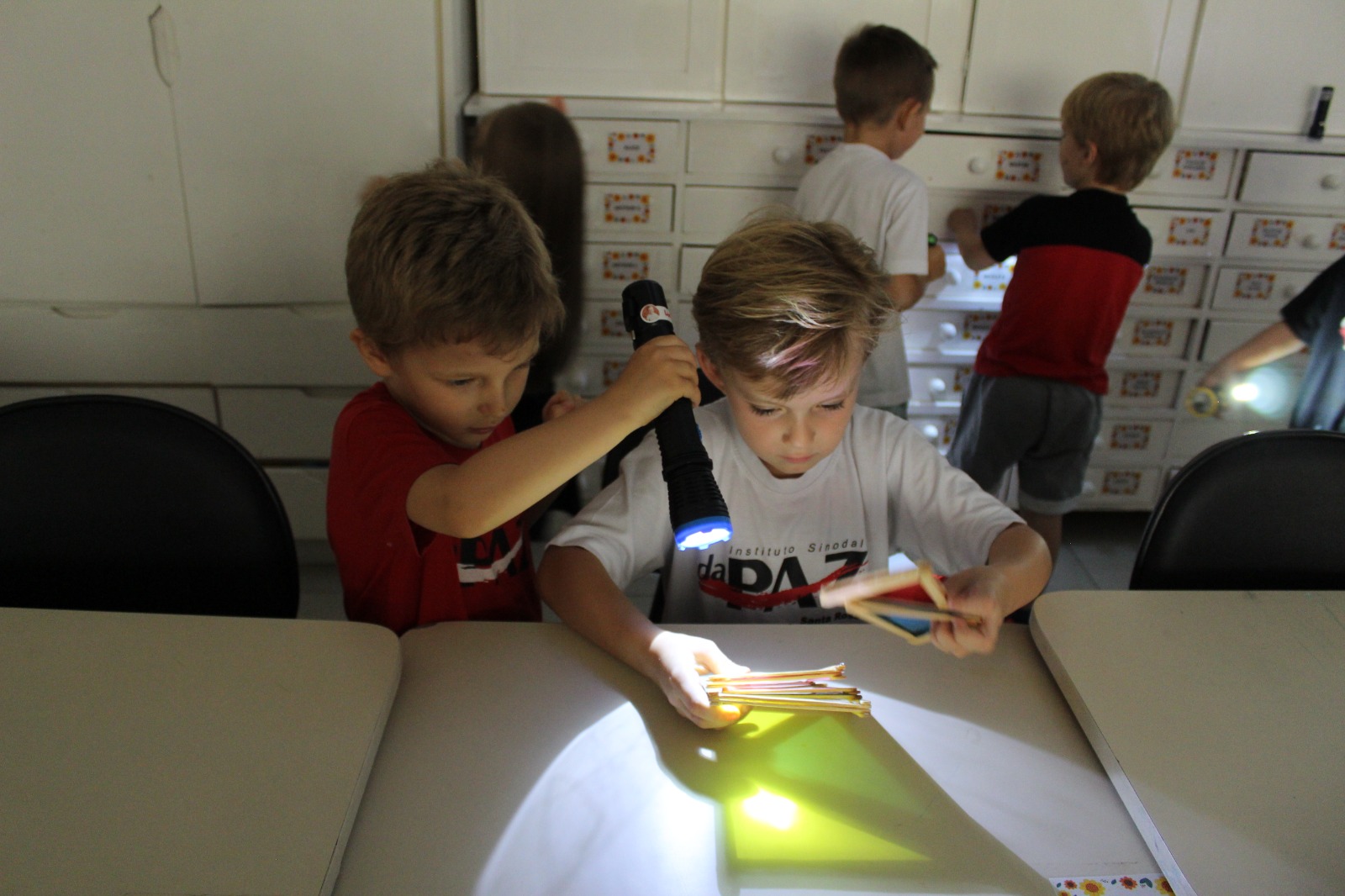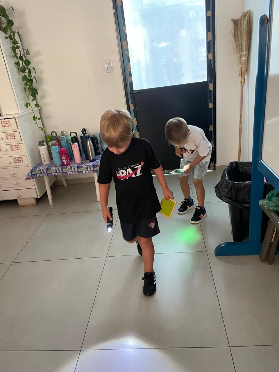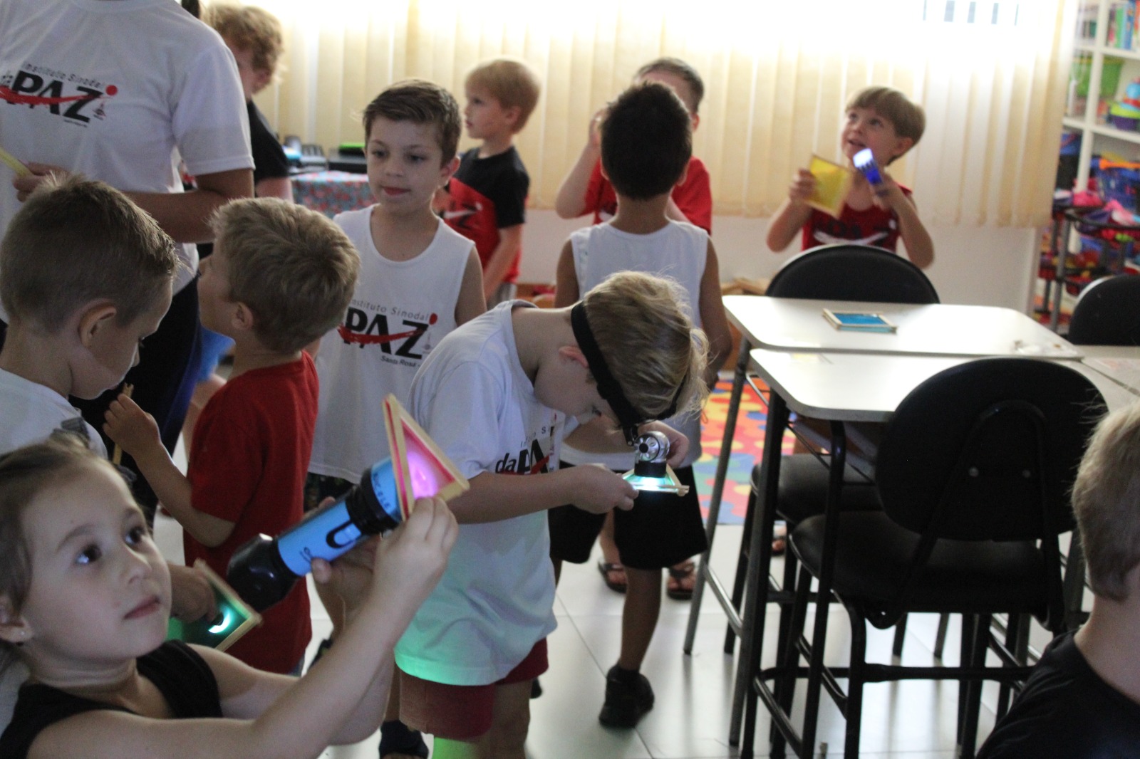 Durante a Sequência Didática, exploraram os efeitos da luz e da sombra usando lanternas e papel celofane plastificado. As cores se misturaram, criando um verdadeiro espetáculo visual!