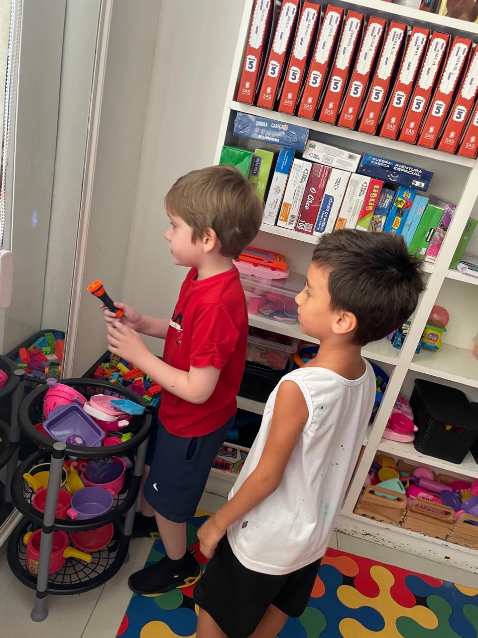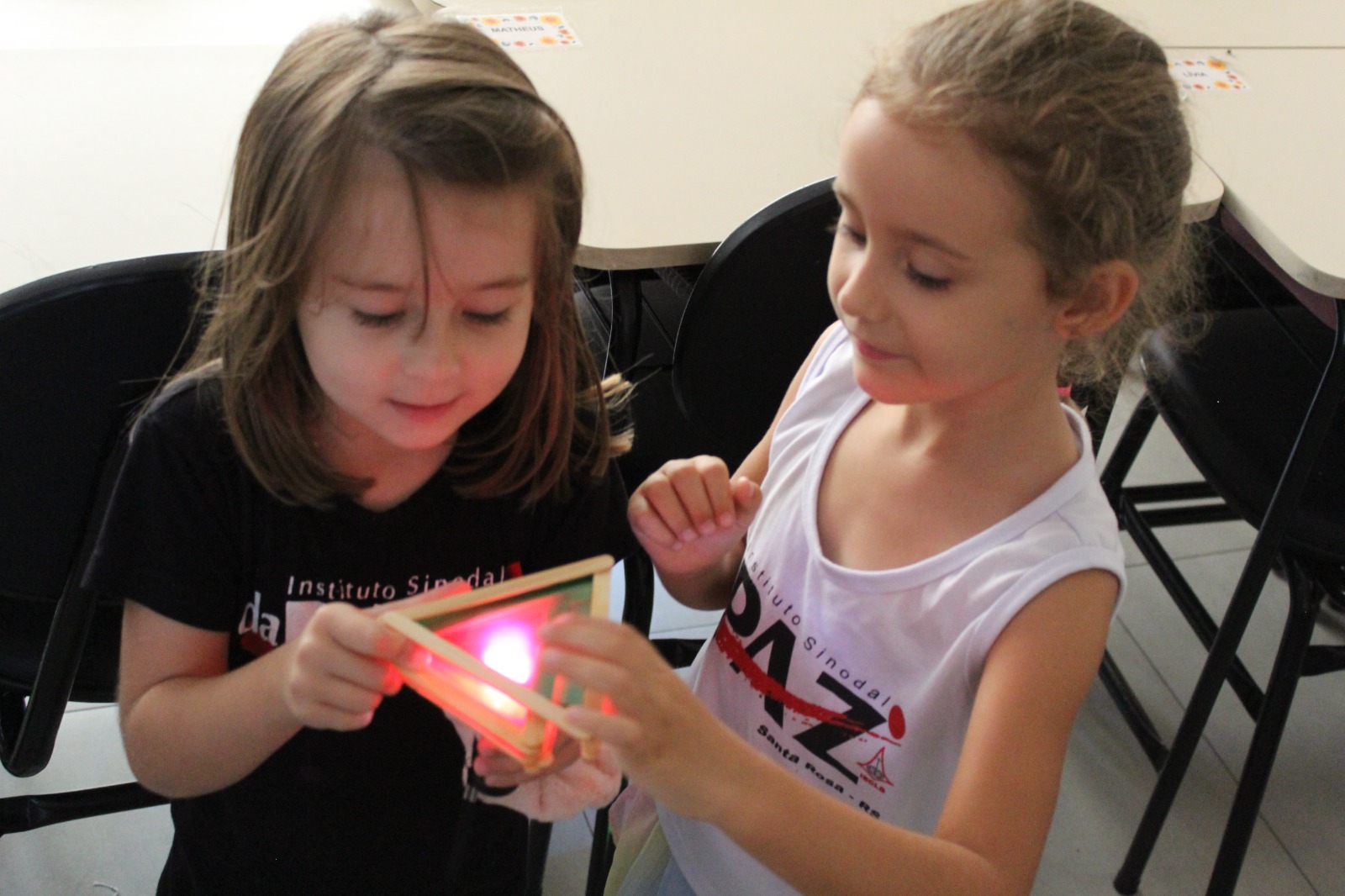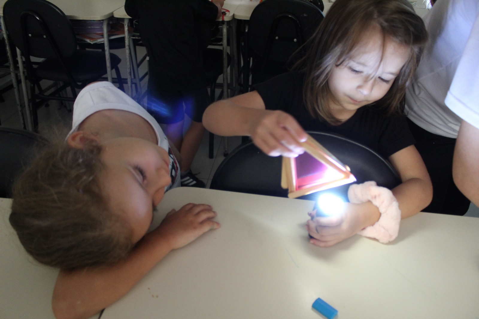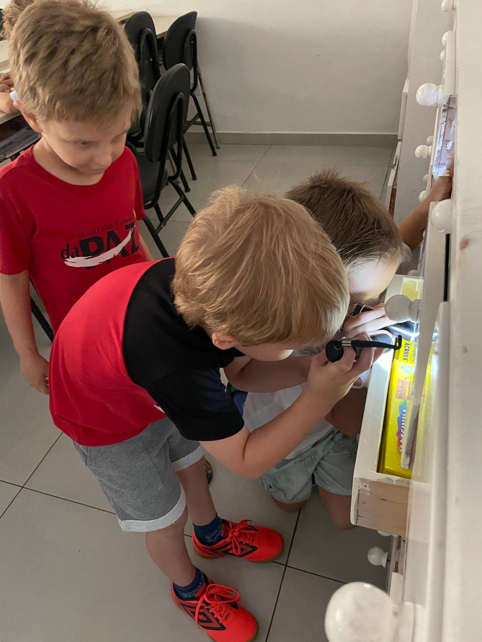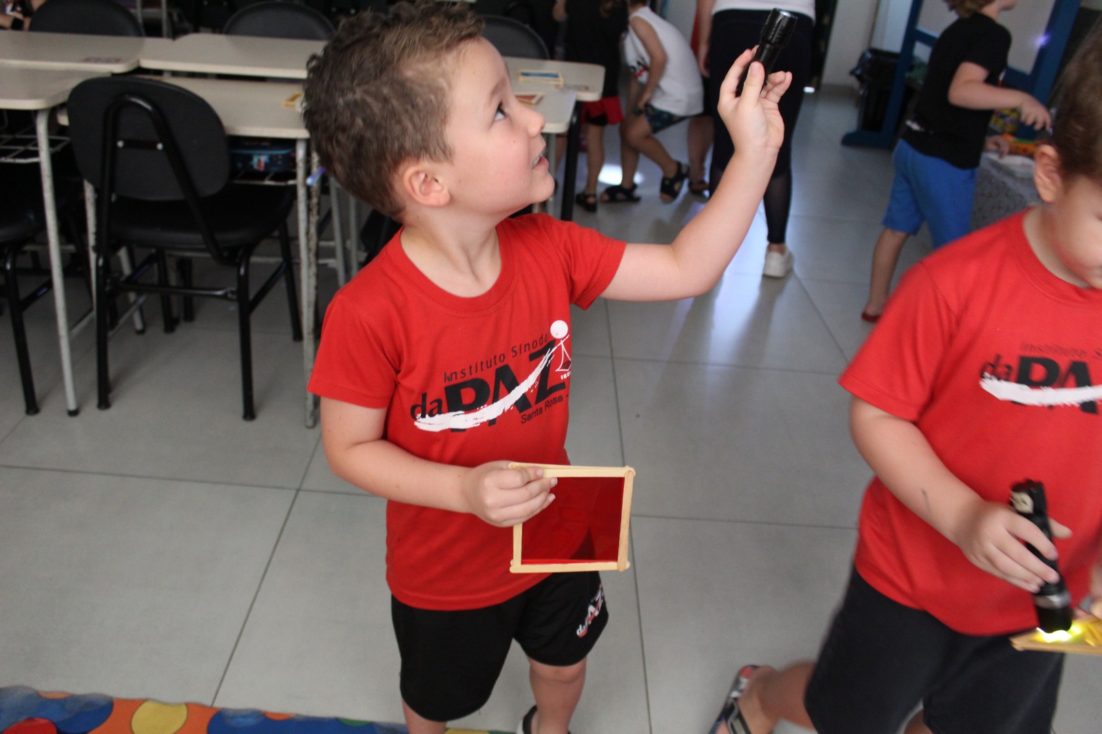 Durante a Sequência Didática, exploraram os efeitos da luz e da sombra usando lanternas e papel celofane plastificado. As cores se misturaram, criando um verdadeiro espetáculo visual!