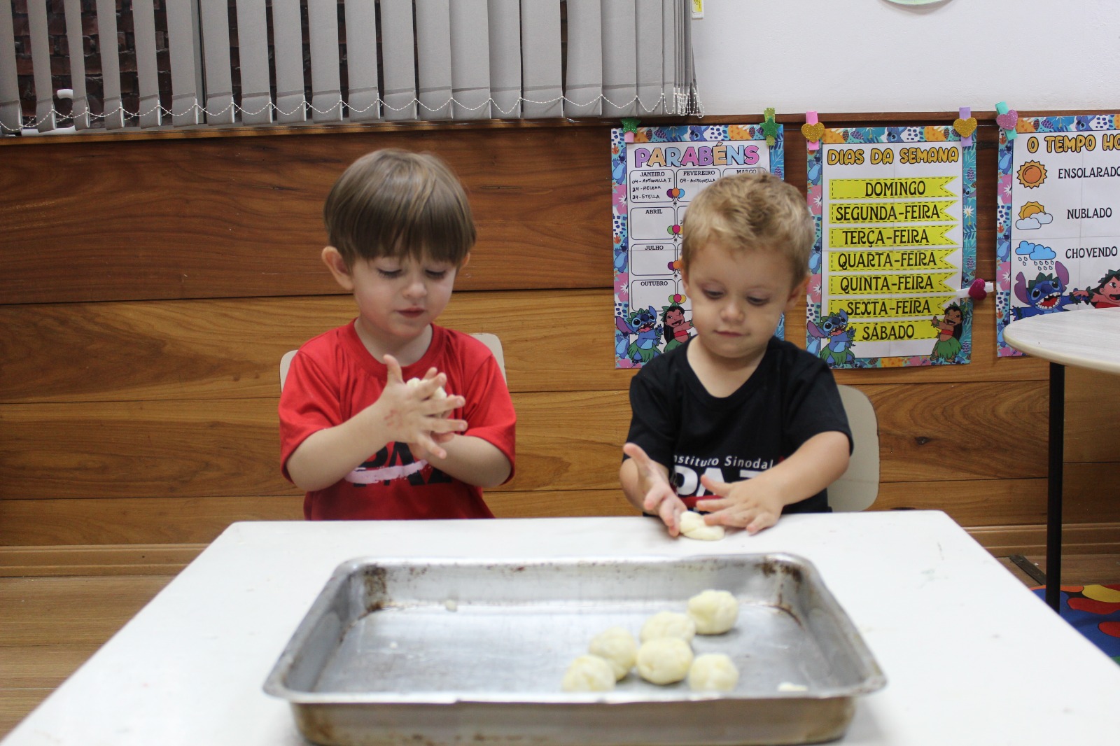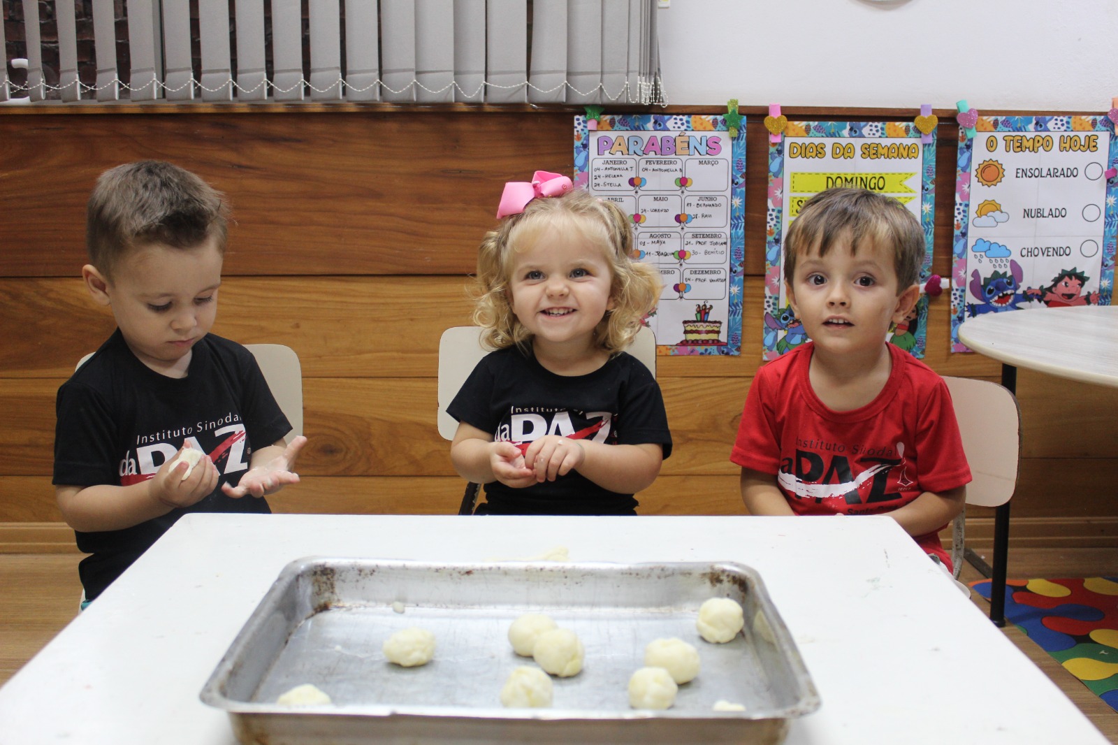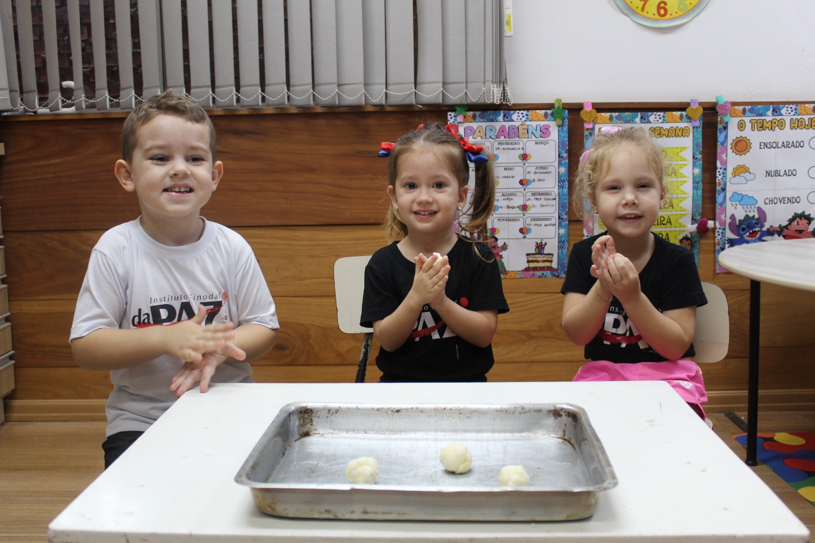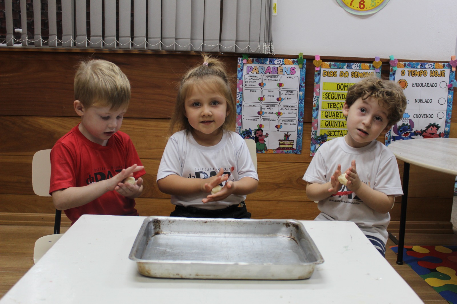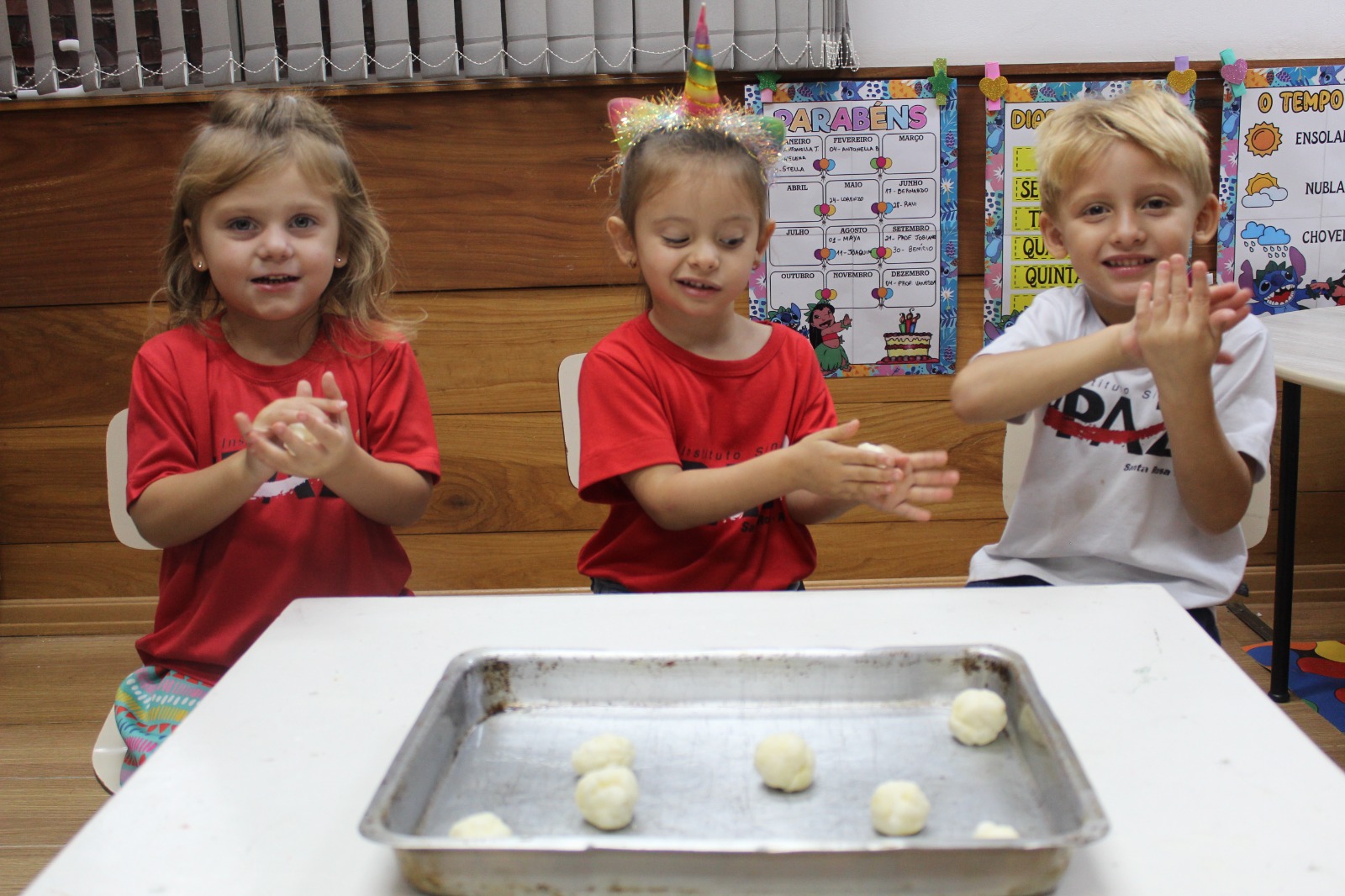 Nossas turminhas de 03 anos das professoras Camila e Vanessa tiveram uma experiência deliciosa e cheia de aprendizado: a confecção de pão de queijo!