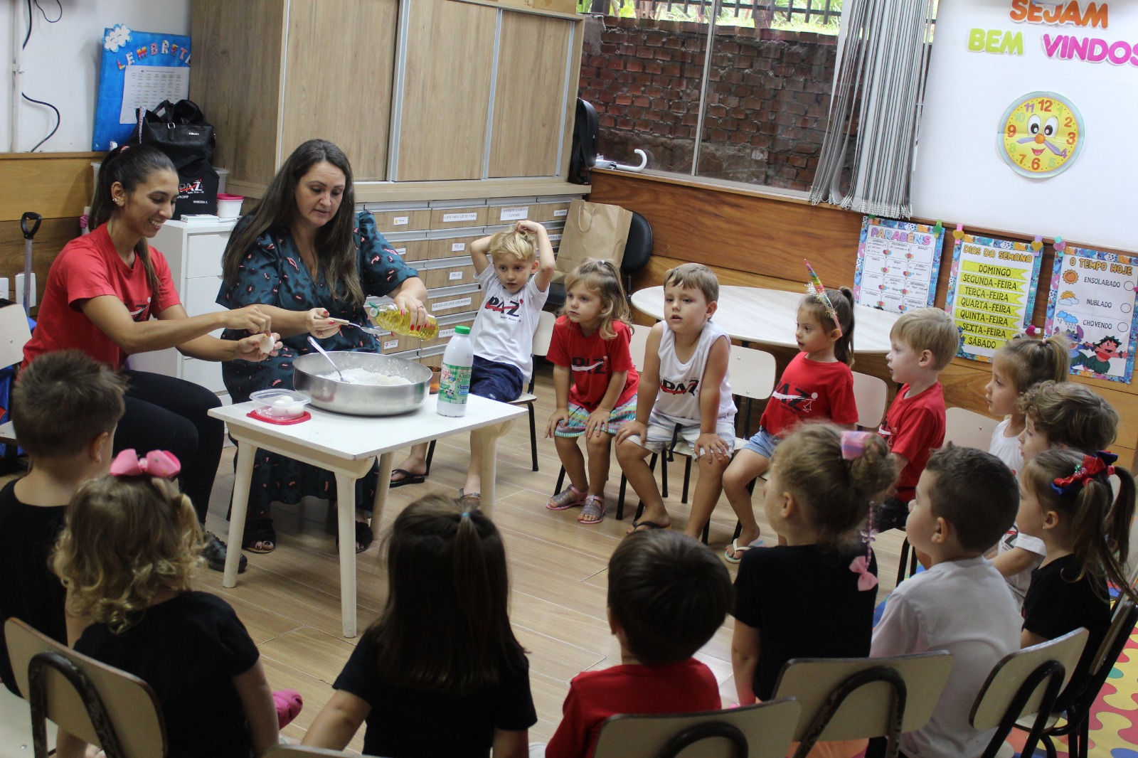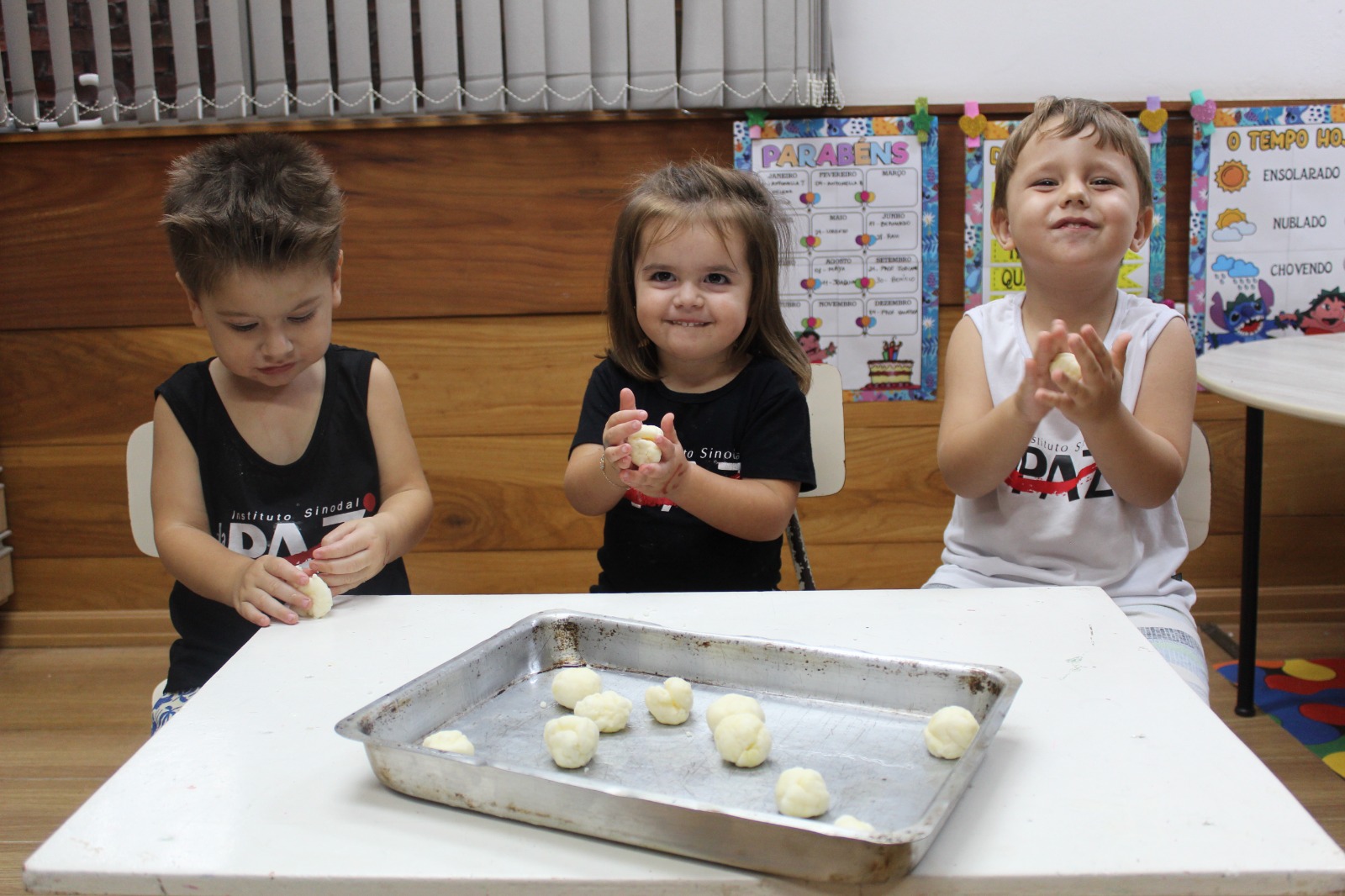 Entre risadas, curiosidade e mãozinhas cheias de polvilho, os pequenos aprenderam sobre os ingredientes, estimularam a coordenação motora e vivenciaram, na prática, a magia de transformar ingredientes em sabor!