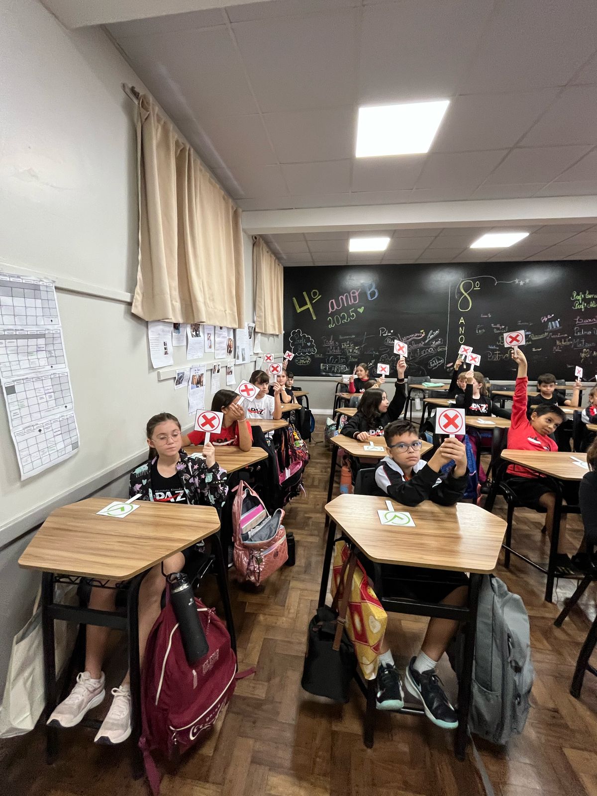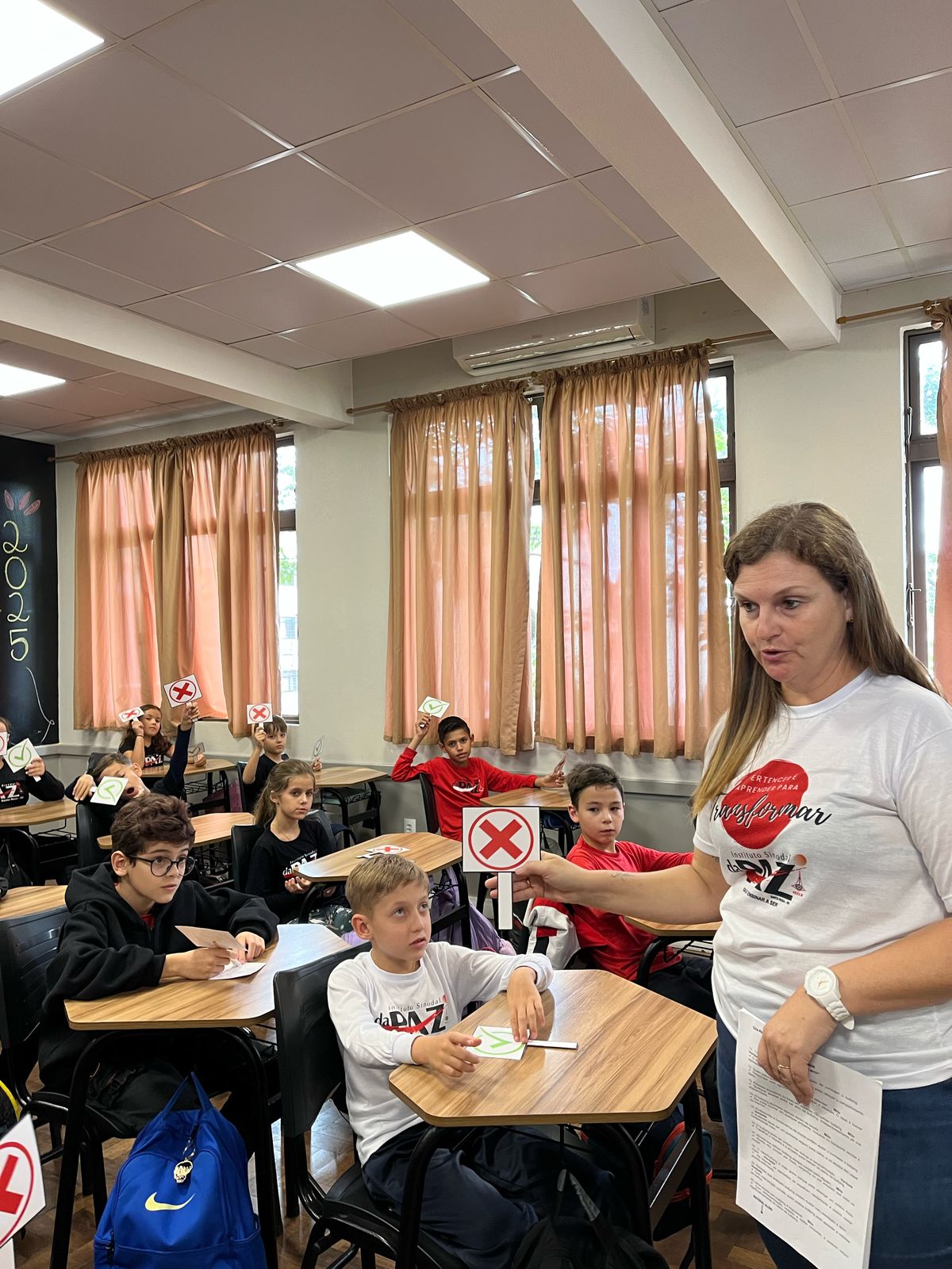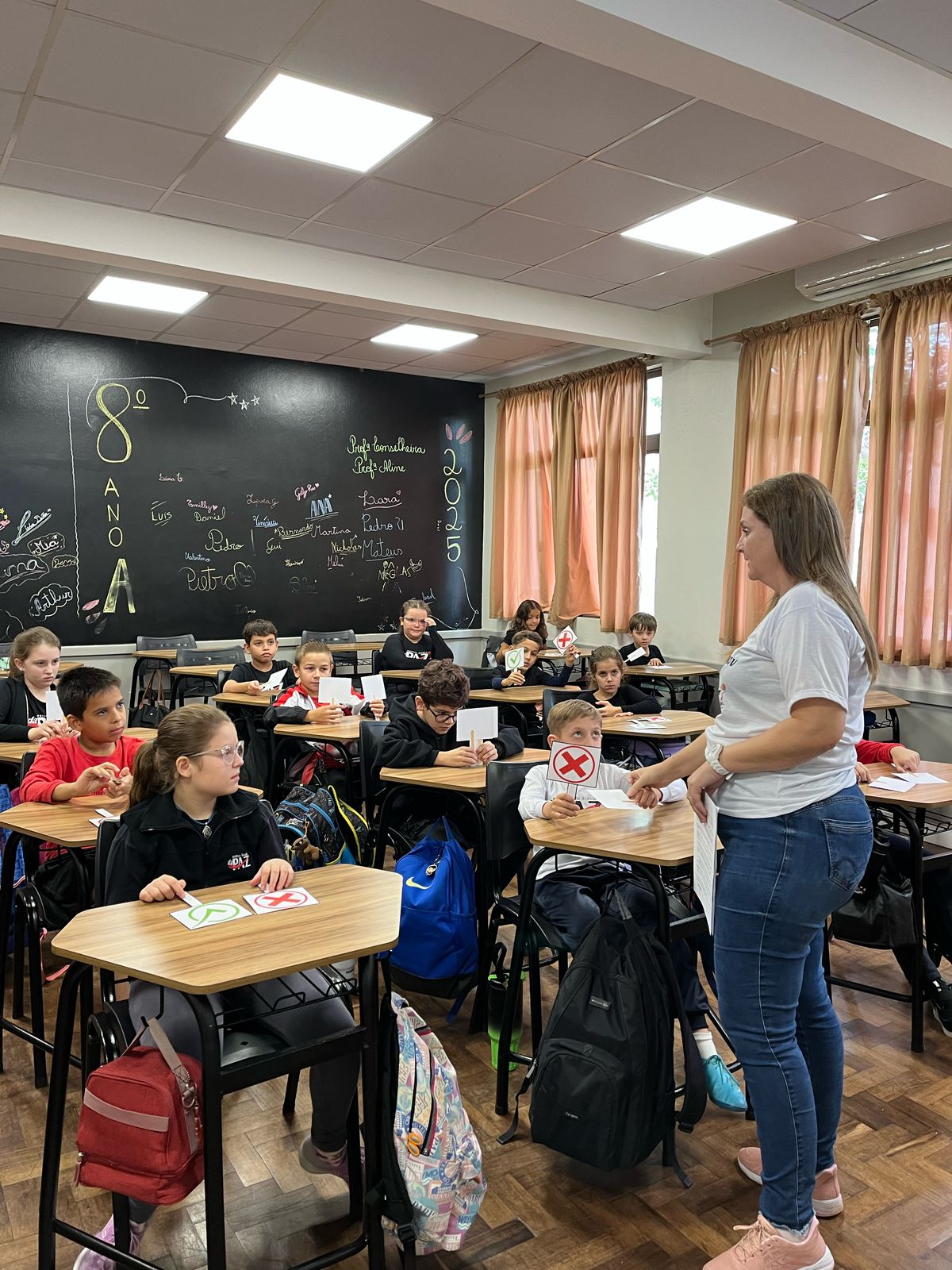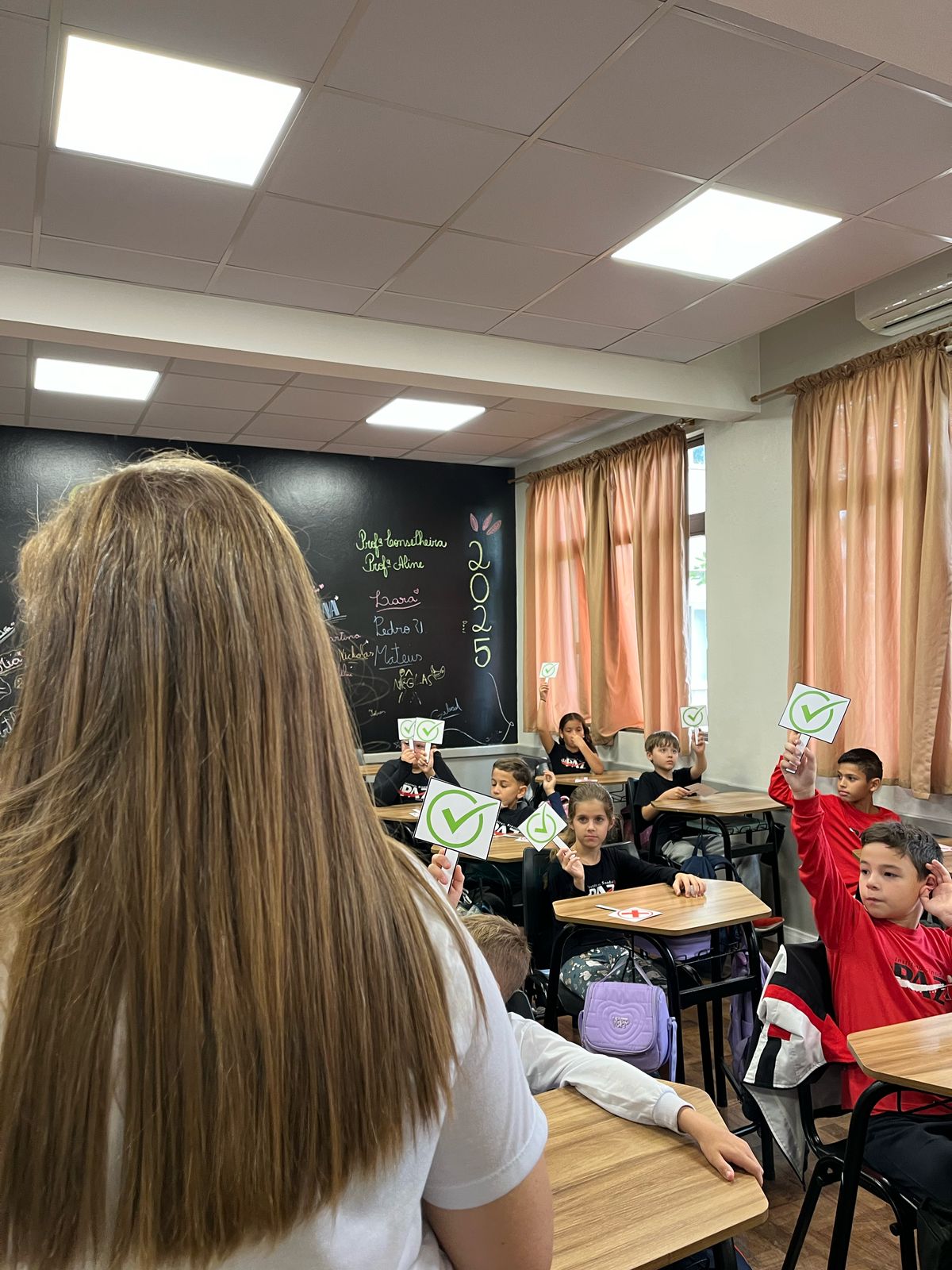 Utilizando placas de Certo e Errado, a dinâmica propôs perguntas que despertaram discussões importantes sobre respeito, convivência e empatia. As crianças foram incentivadas a identificar comportamentos inadequados e pensar em formas de tornar o ambiente escolar mais acolhedor e seguro para todos.