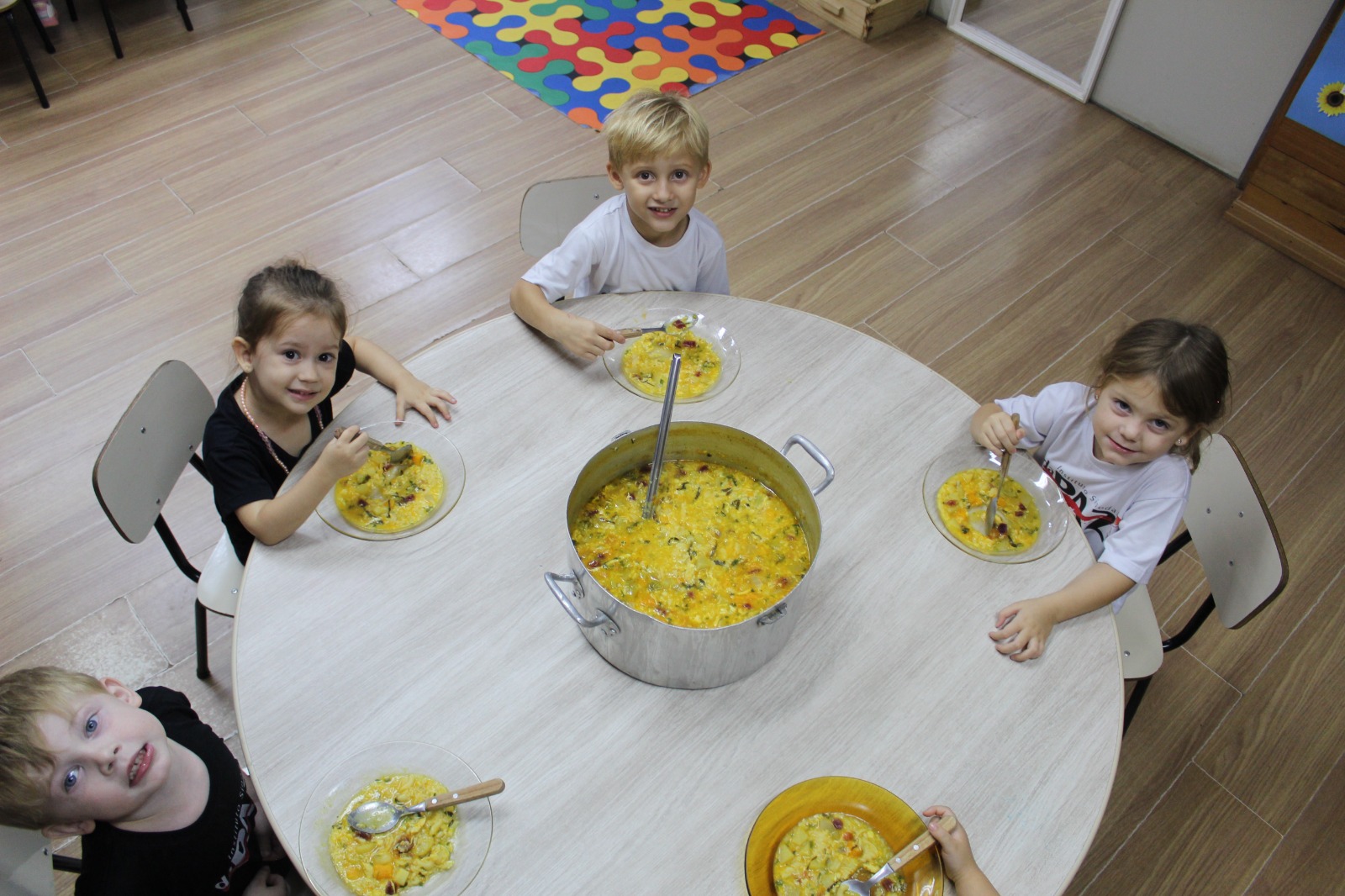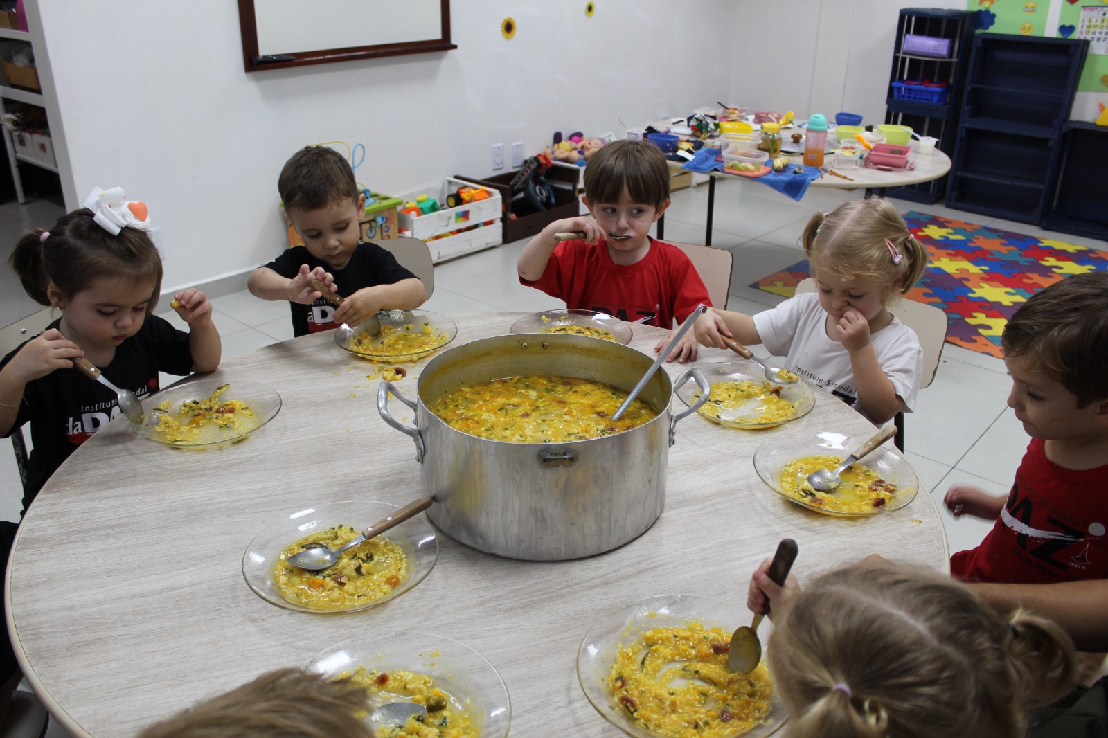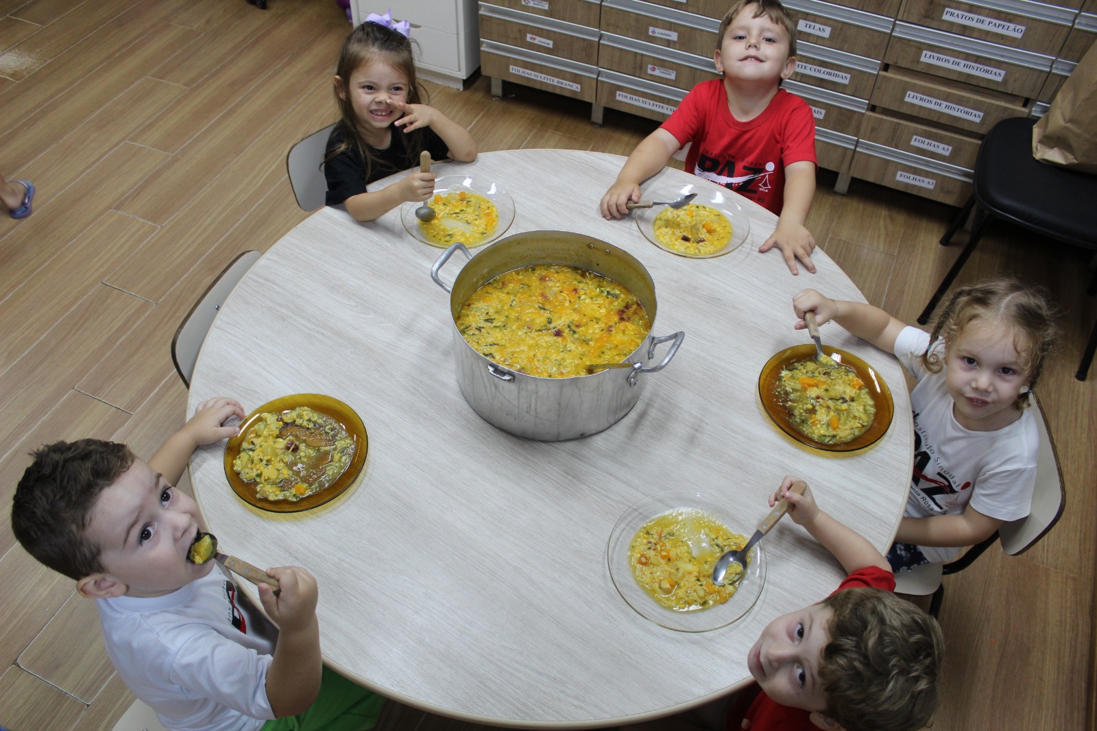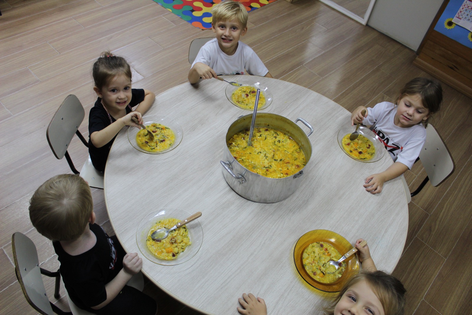 Eles participaram do preparo de uma saborosa sopa de legumes, explorando os alimentos, conhecendo novos sabores e aprendendo a importância de uma alimentação equilibrada desde cedo.