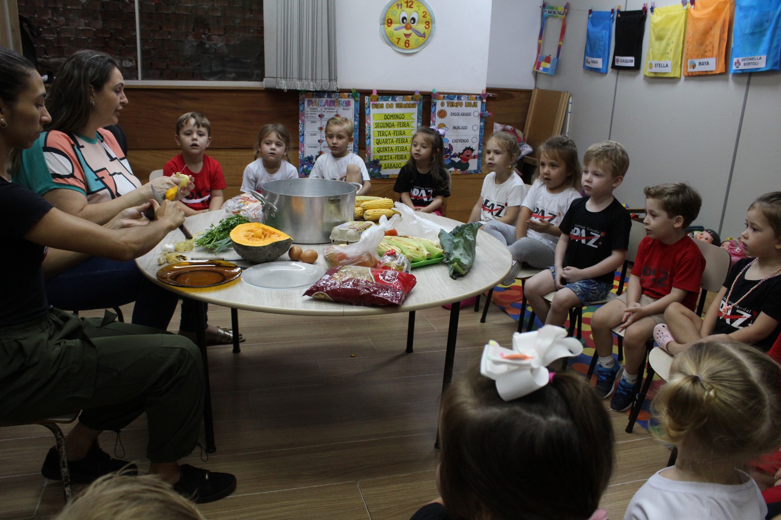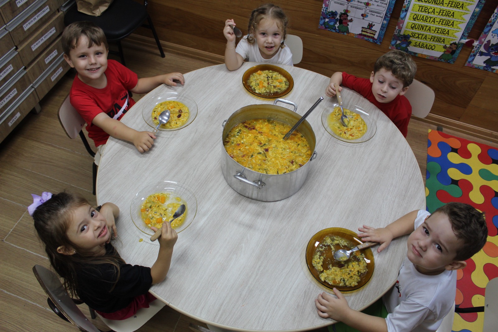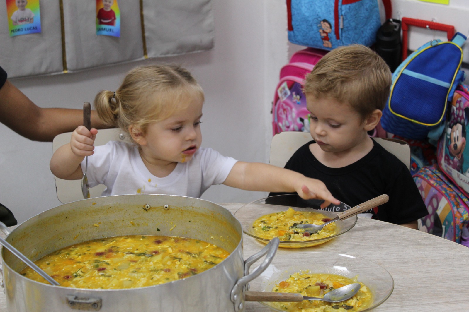 Eles participaram do preparo de uma saborosa sopa de legumes, explorando os alimentos, conhecendo novos sabores e aprendendo a importância de uma alimentação equilibrada desde cedo.