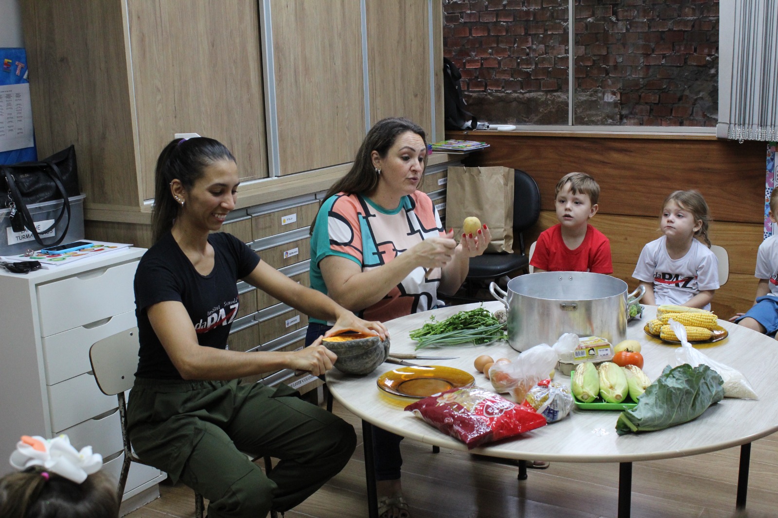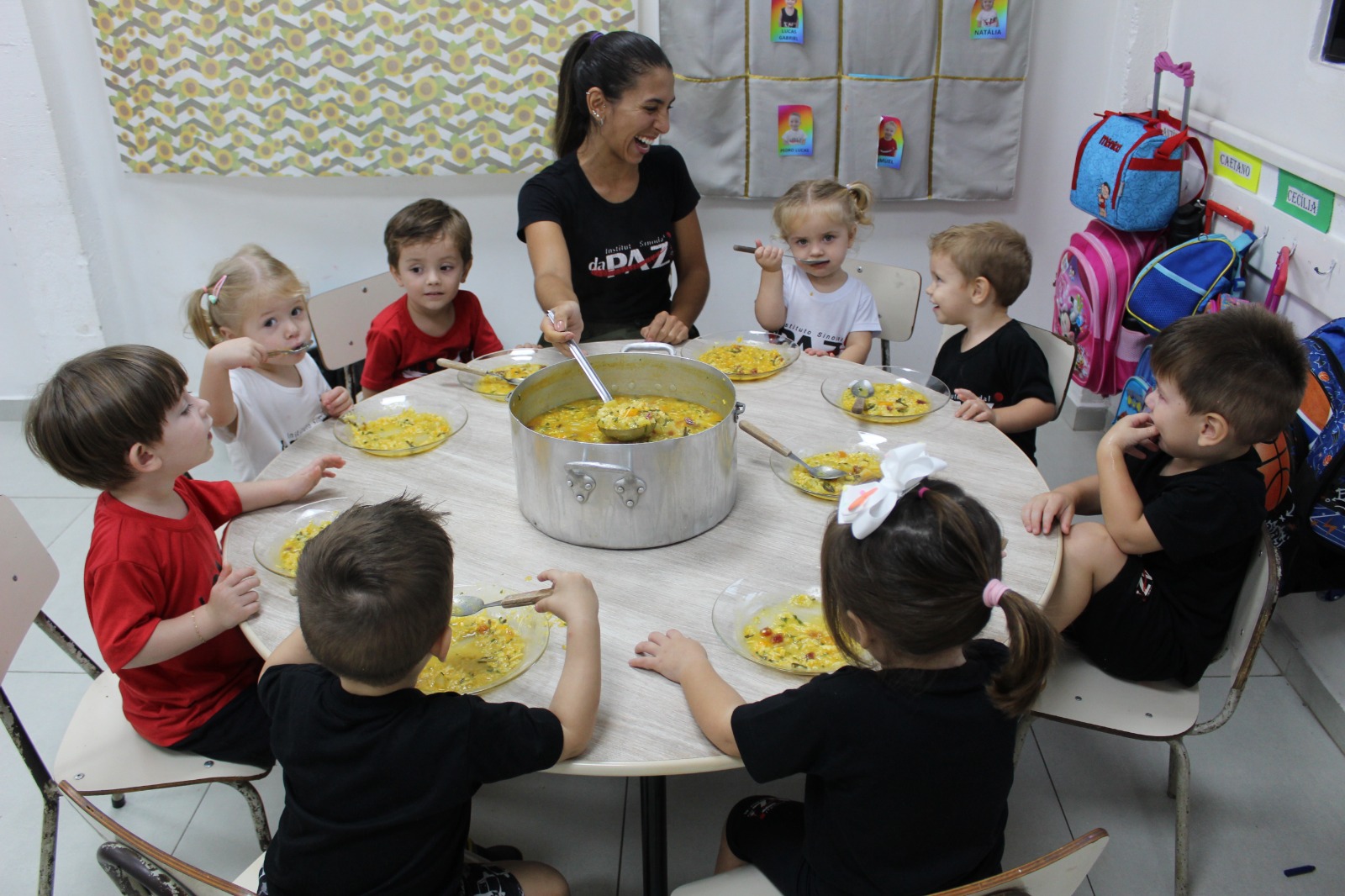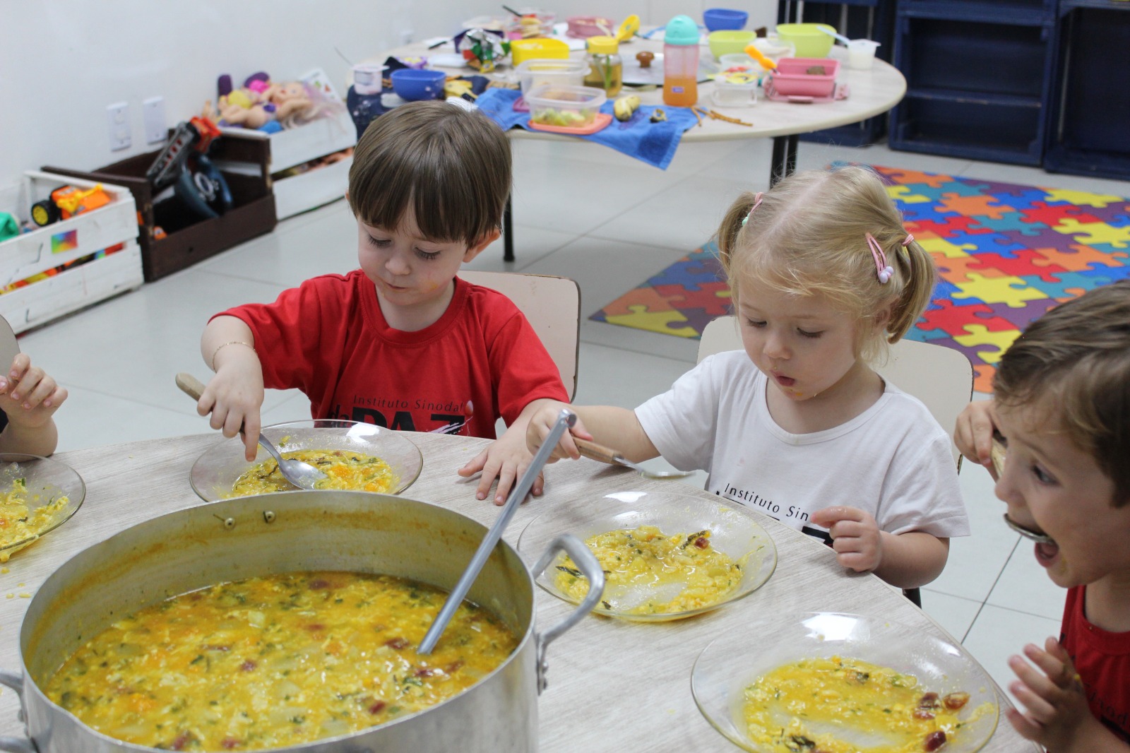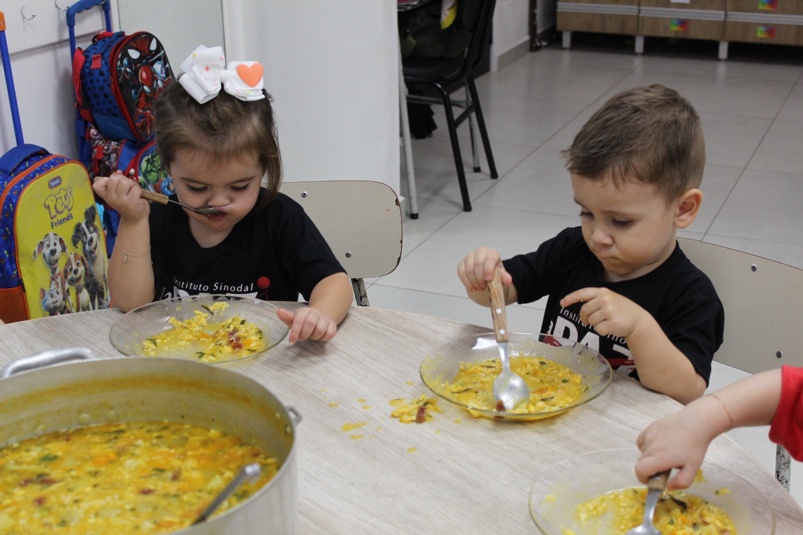 Eles participaram do preparo de uma saborosa sopa de legumes, explorando os alimentos, conhecendo novos sabores e aprendendo a importância de uma alimentação equilibrada desde cedo.