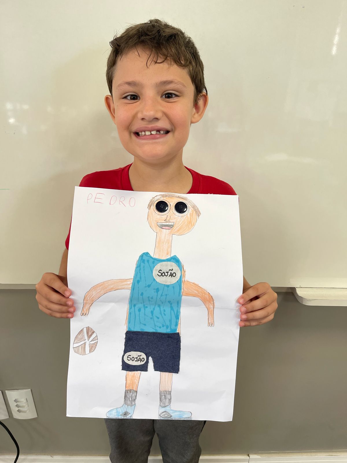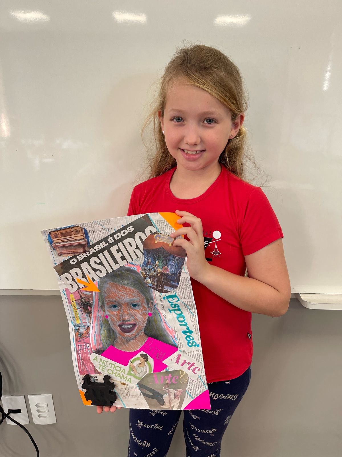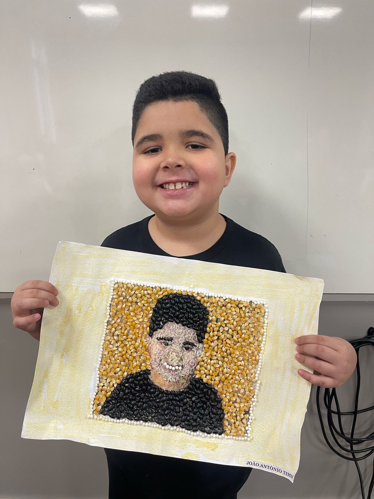 A partir de uma foto de seu próprio rosto, cada aluno pôde usar toda a sua criatividade, combinando diferentes objetos e materiais para compor sua arte.