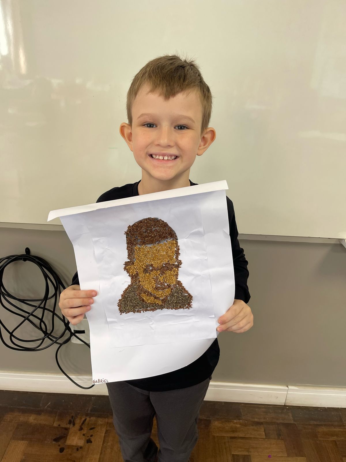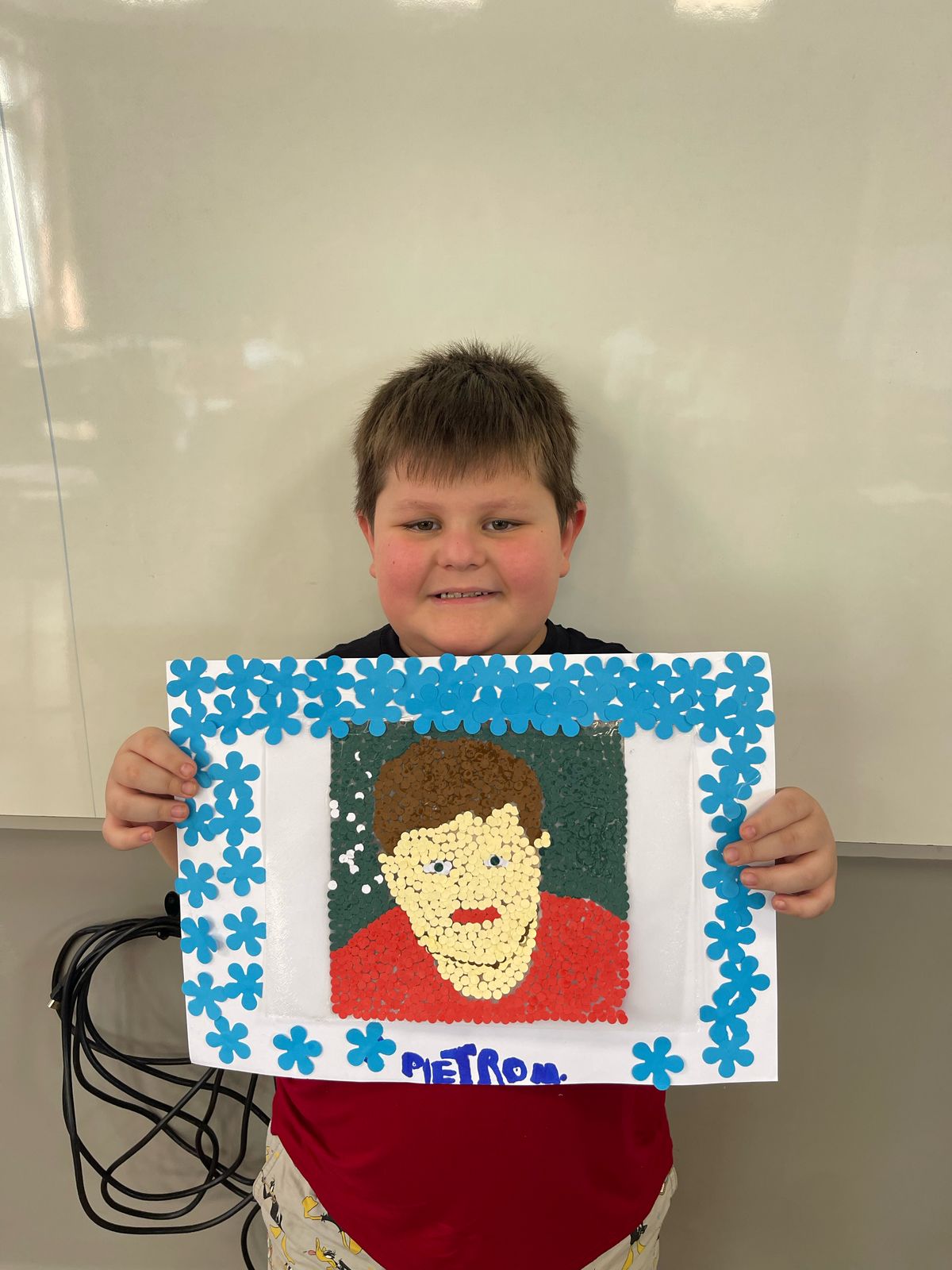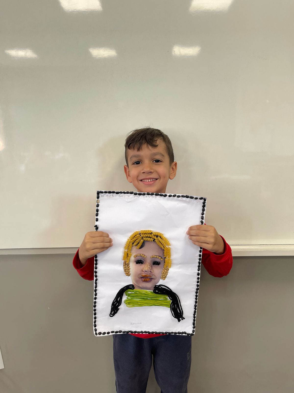 A partir de uma foto de seu próprio rosto, cada aluno pôde usar toda a sua criatividade, combinando diferentes objetos e materiais para compor sua arte.