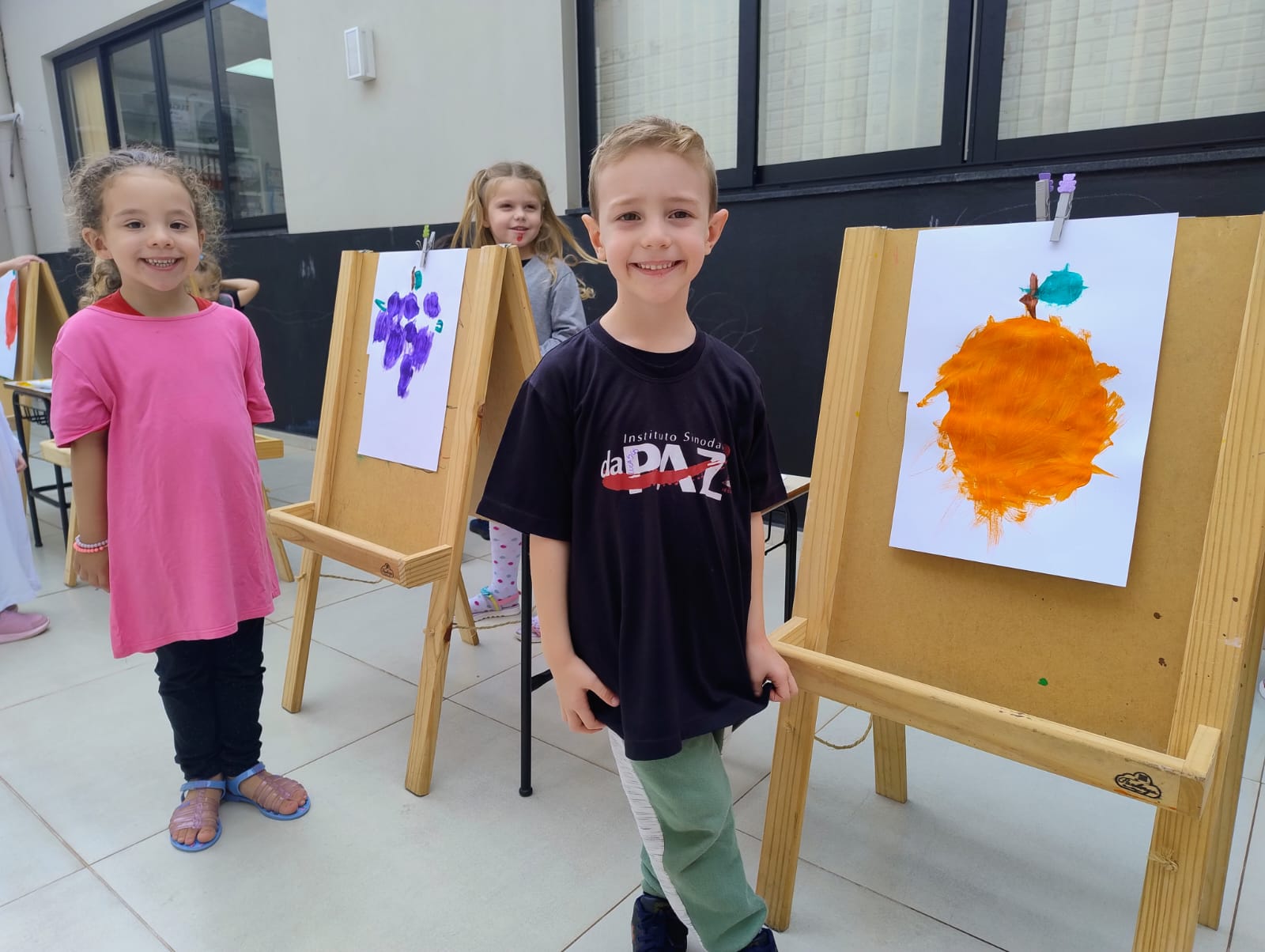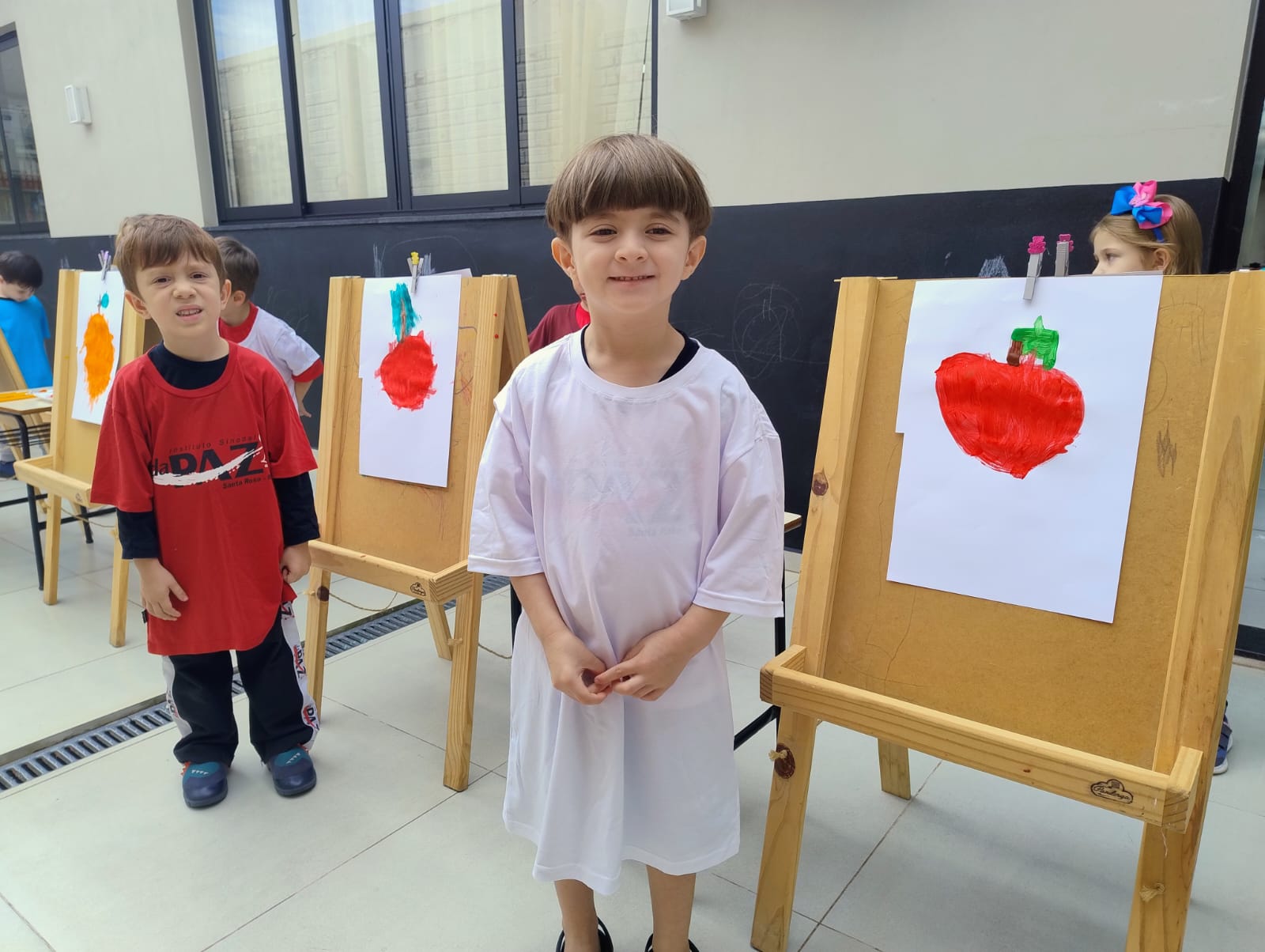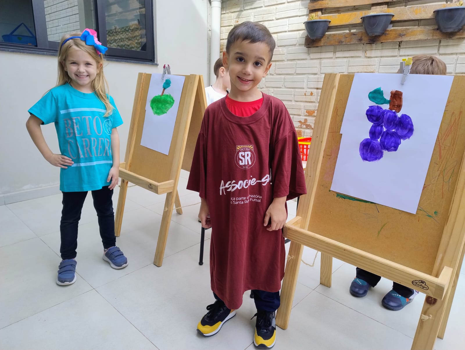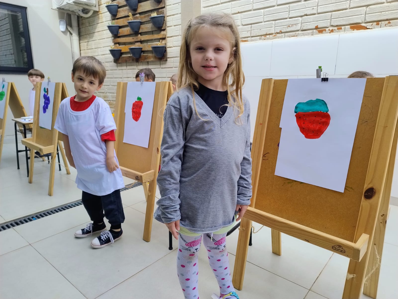 Eles observaram imagens de diversas frutas e, depois, colocaram a criatividade em ação: cada criança escolheu sua fruta preferida e a representou com tinta guache! Uma explosão de cores e imaginação!