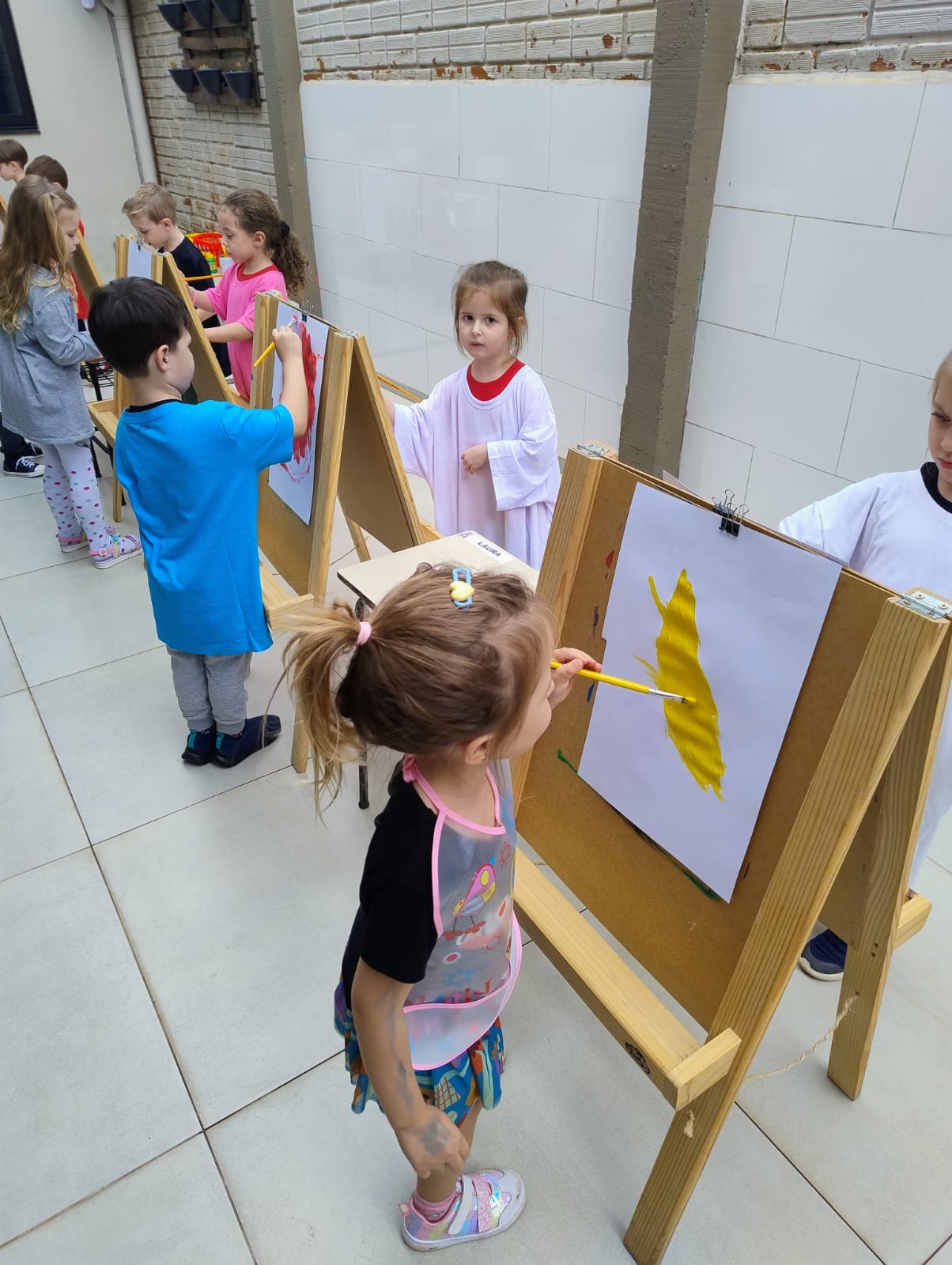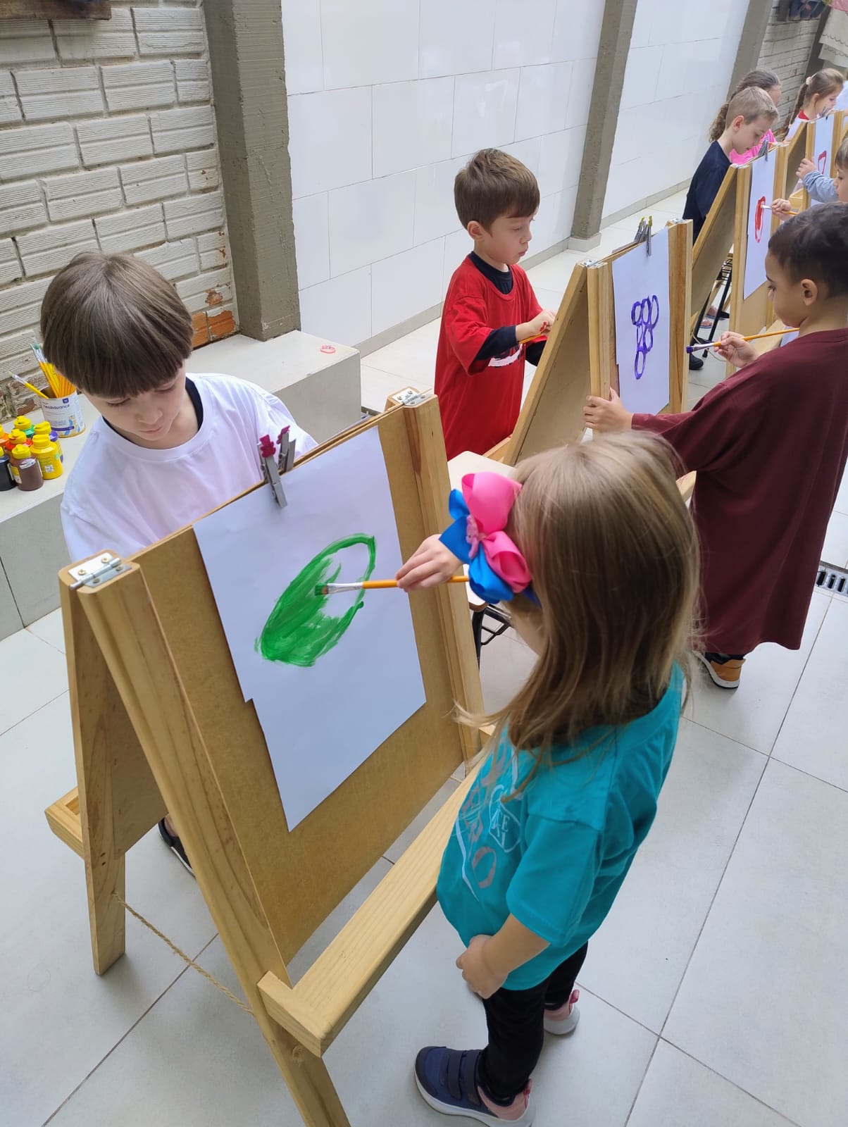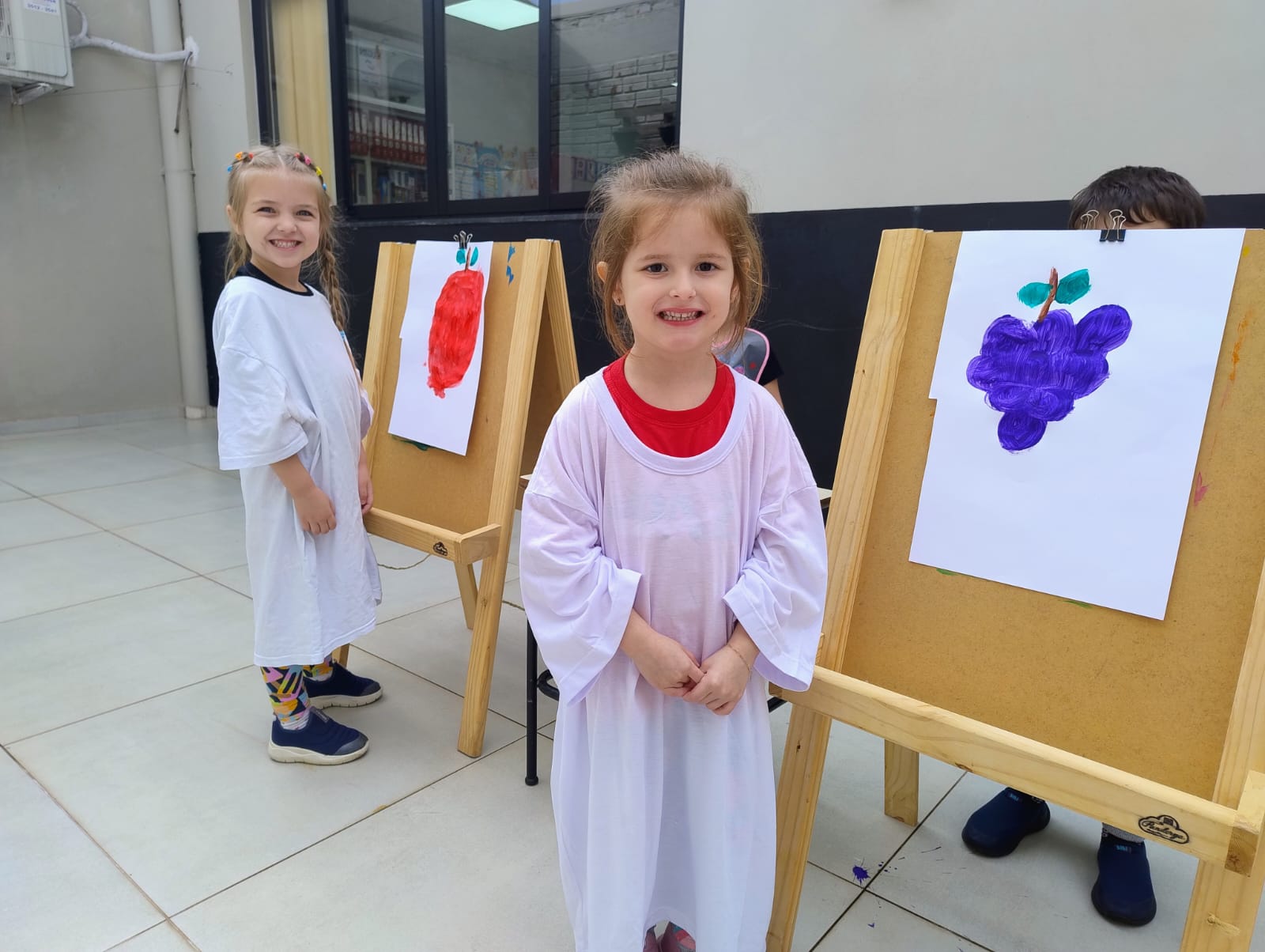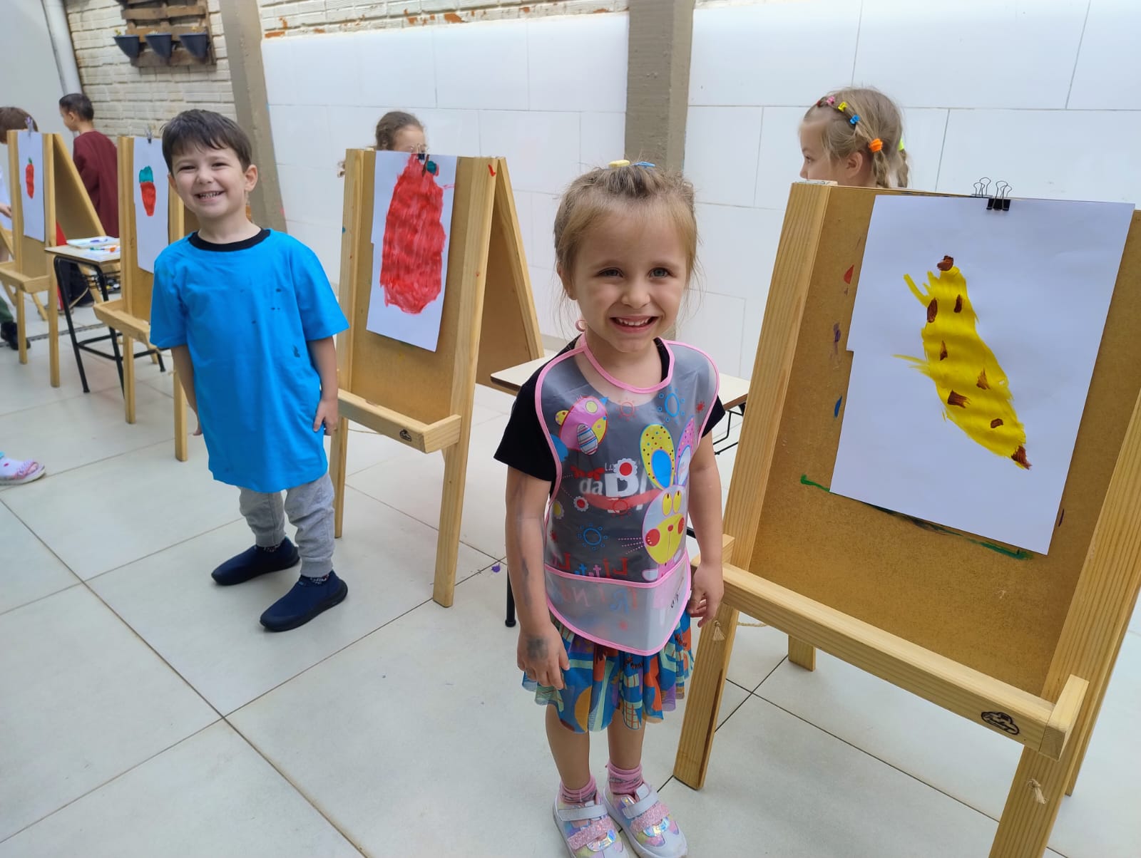 Eles observaram imagens de diversas frutas e, depois, colocaram a criatividade em ação: cada criança escolheu sua fruta preferida e a representou com tinta guache! Uma explosão de cores e imaginação!