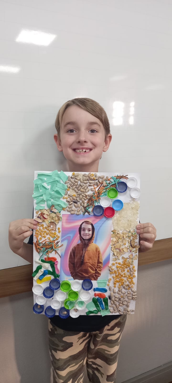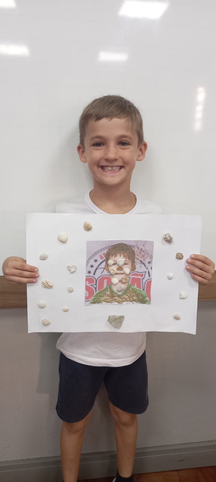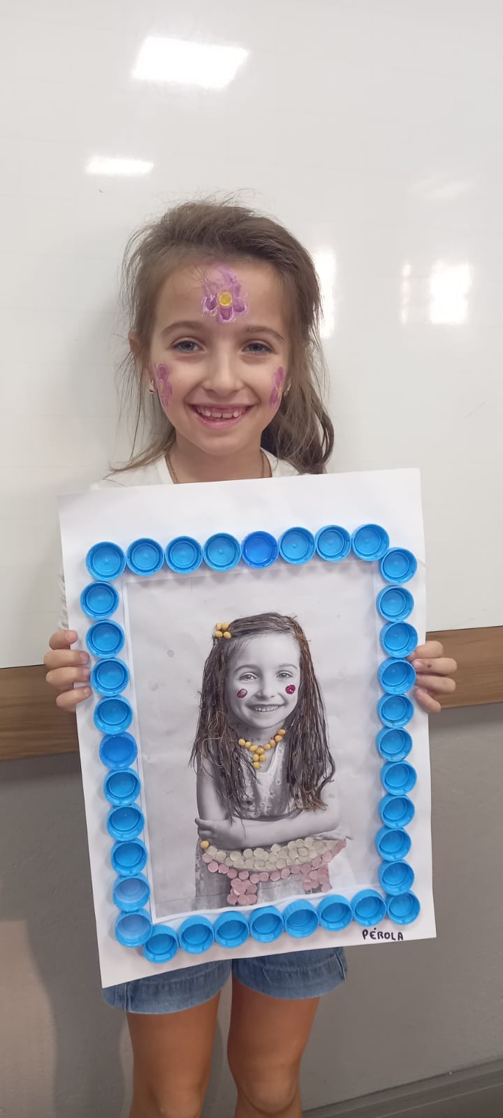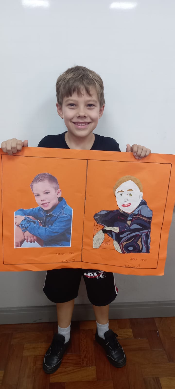 A partir de uma foto de seu próprio rosto, cada aluno pôde usar toda a sua criatividade, combinando diferentes objetos e materiais para compor sua arte.