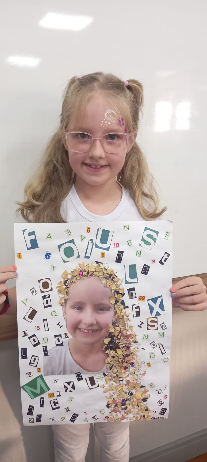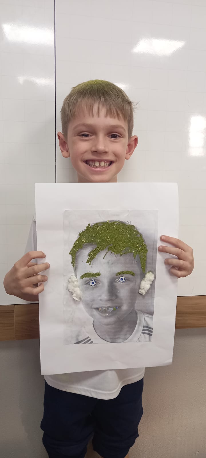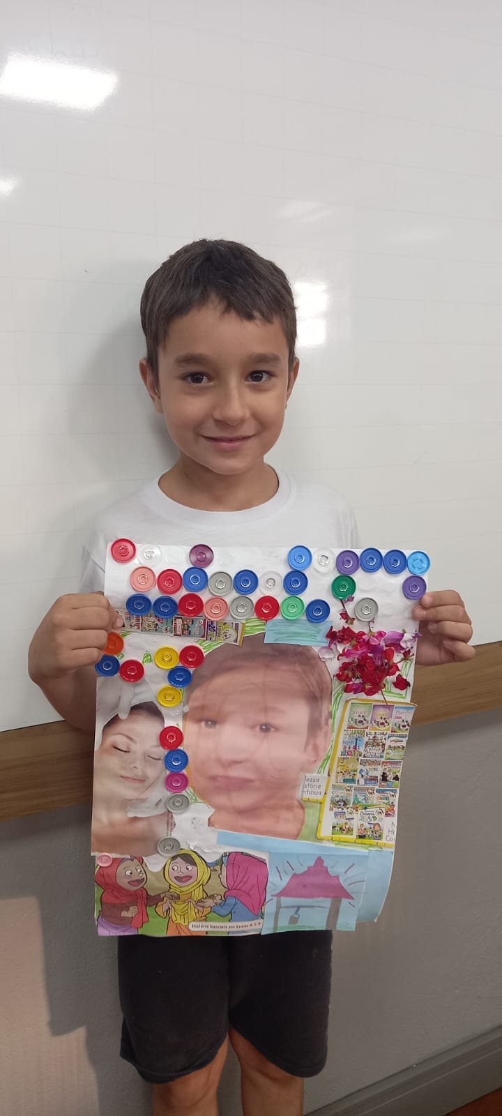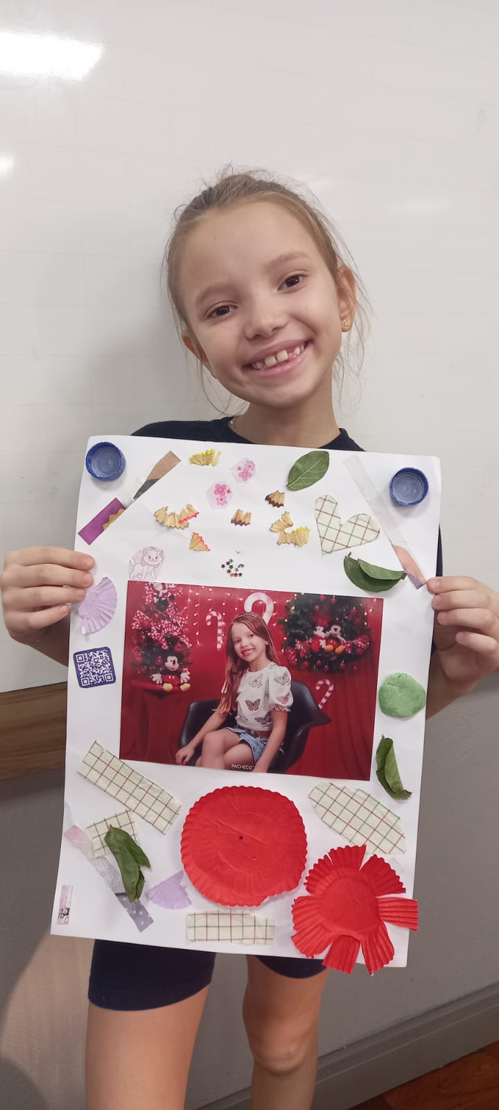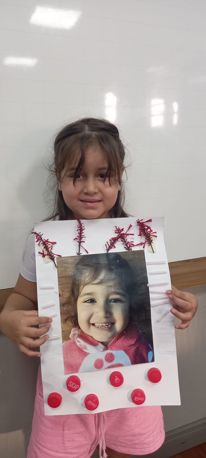 A partir de uma foto de seu próprio rosto, cada aluno pôde usar toda a sua criatividade, combinando diferentes objetos e materiais para compor sua arte.