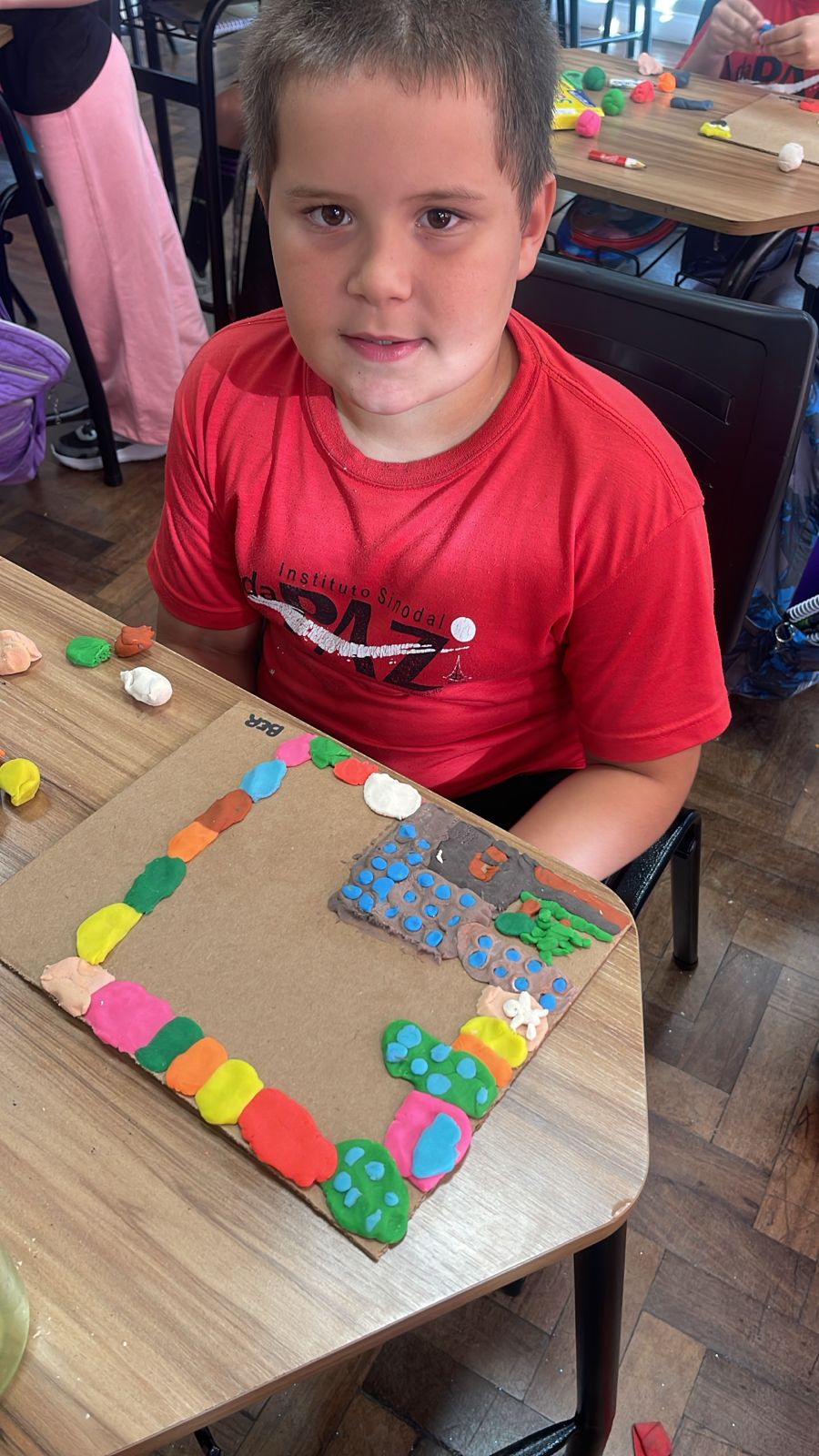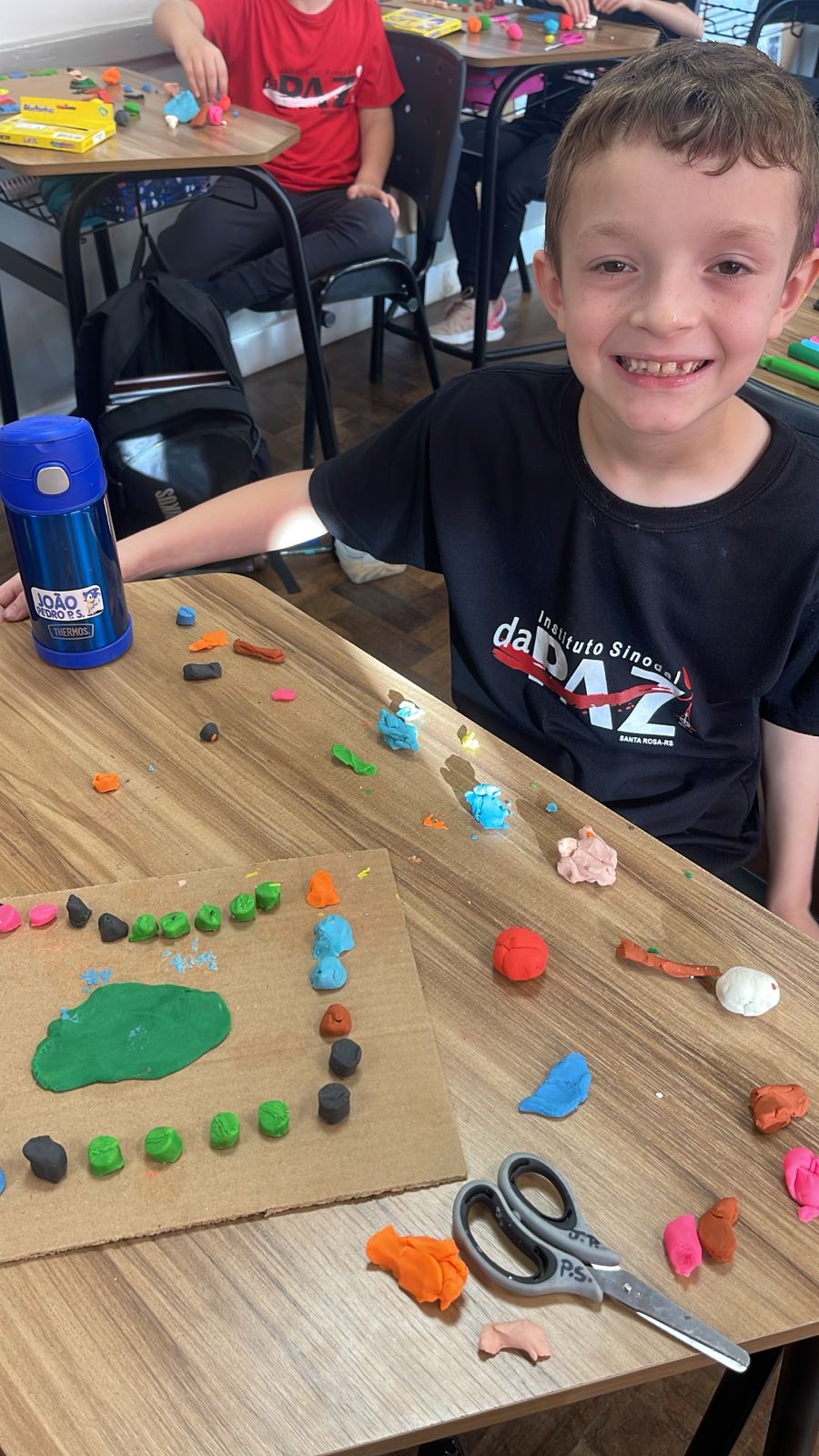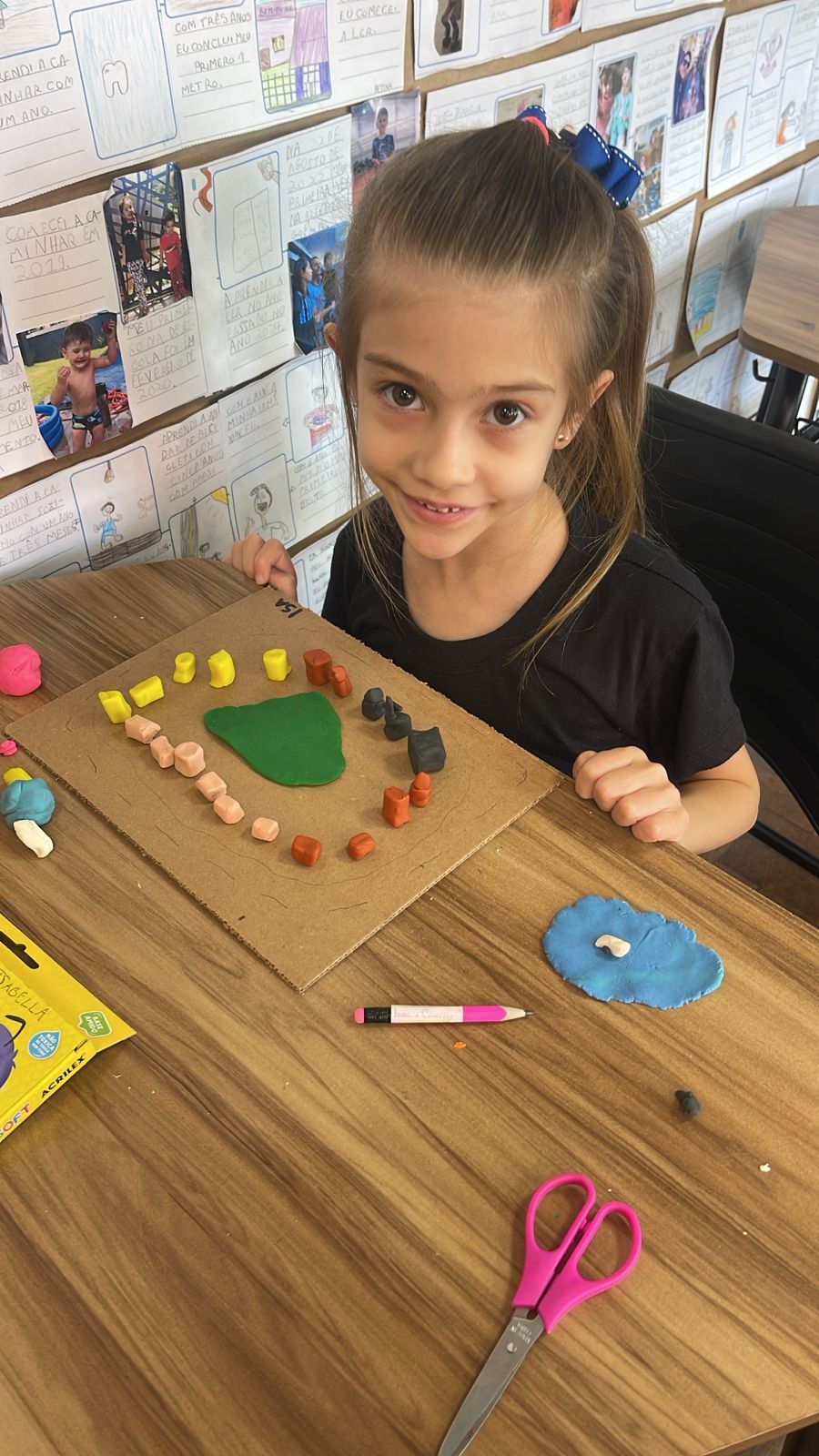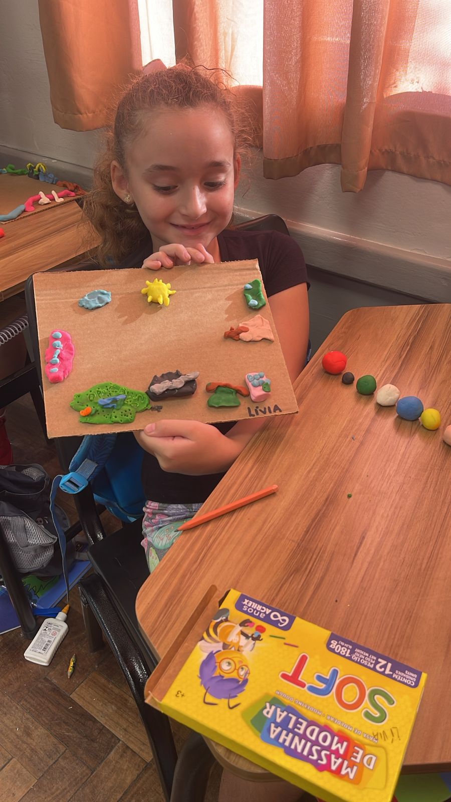 Com o uso de massinha de modelar, foram desafiados a criar uma maquete tátil representando o entorno da escola, aplicando na prática o que observaram durante a caminhada.
