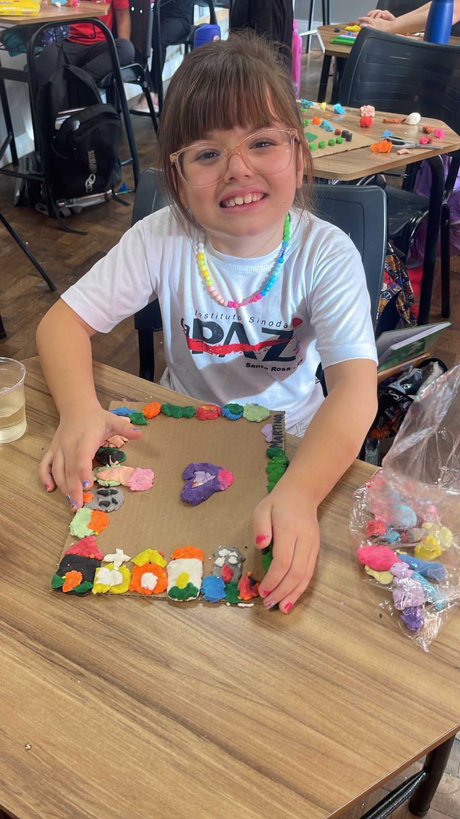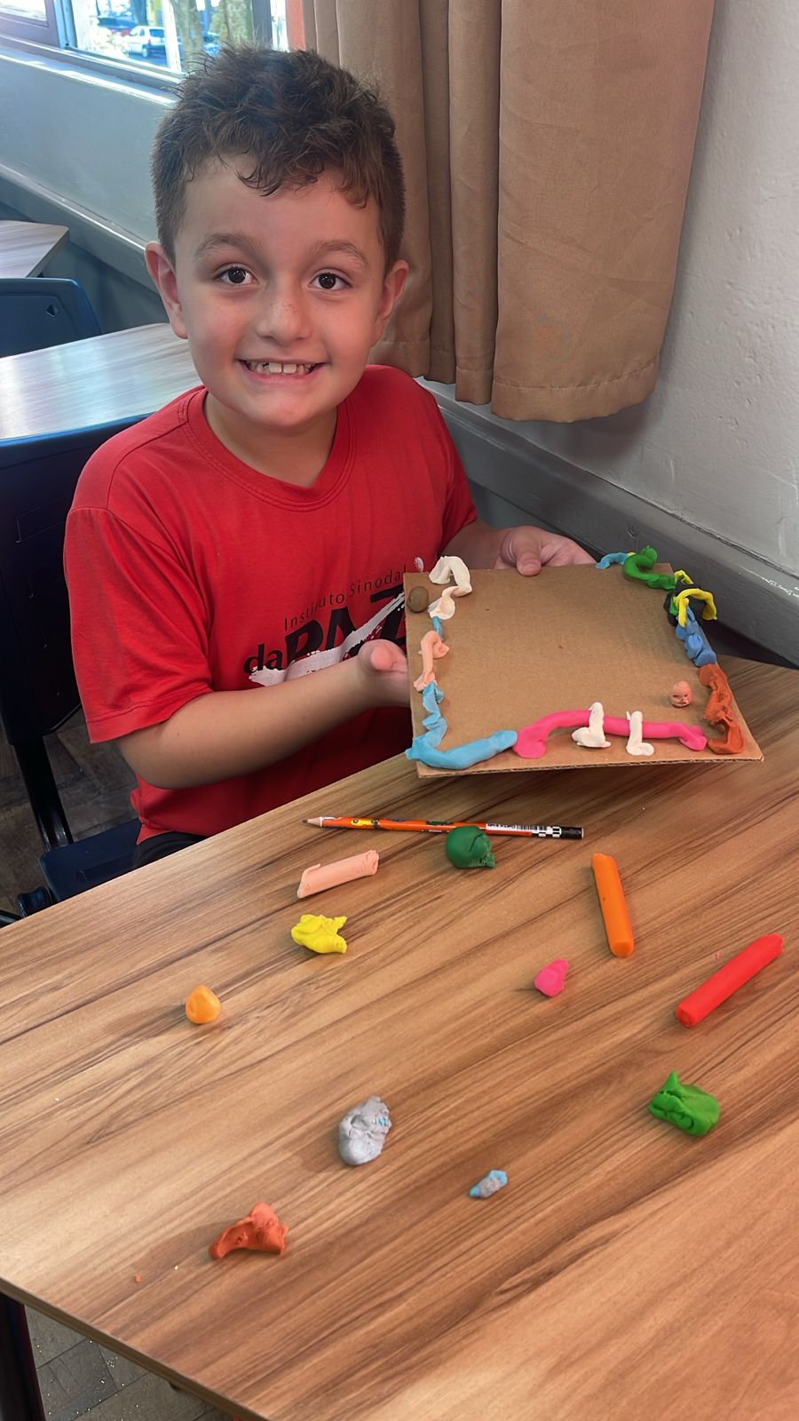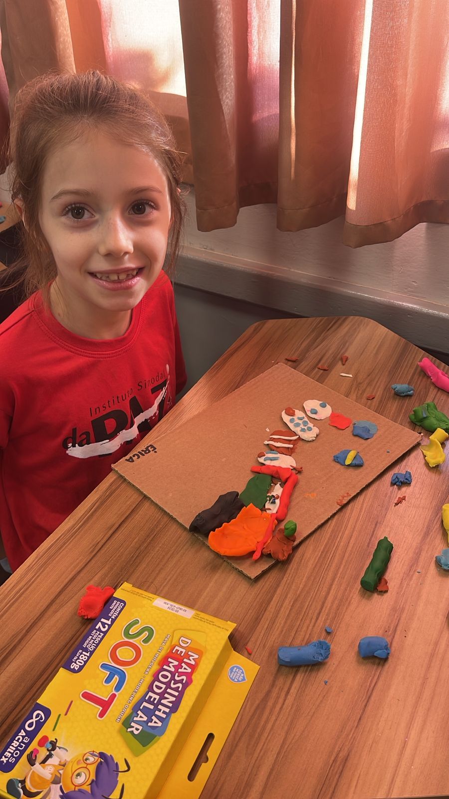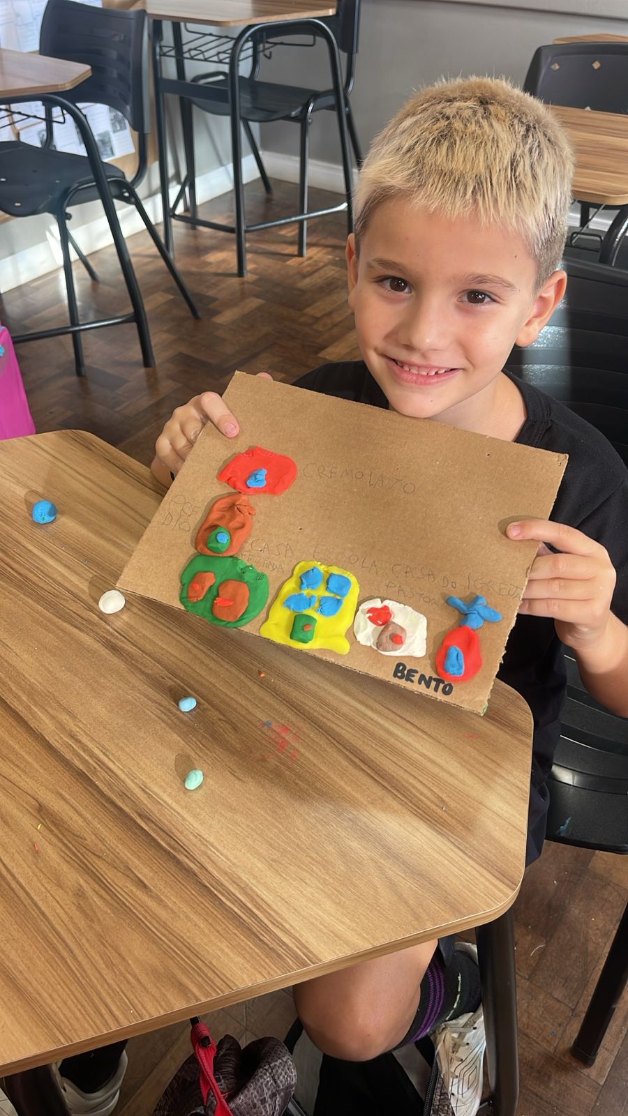 Com o uso de massinha de modelar, foram desafiados a criar uma maquete tátil representando o entorno da escola, aplicando na prática o que observaram durante a caminhada.