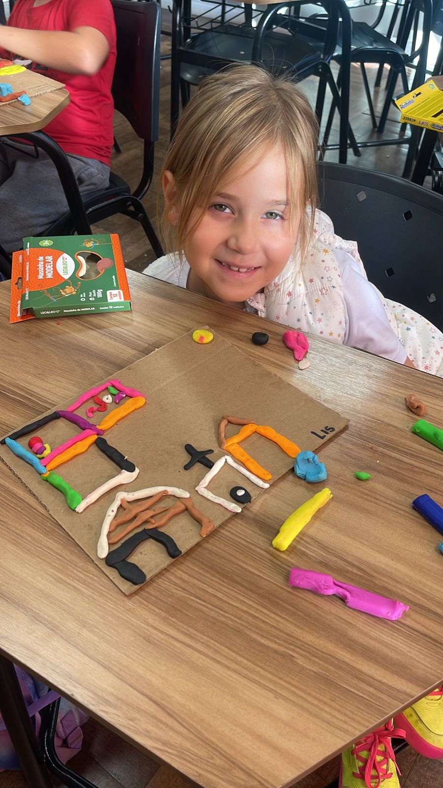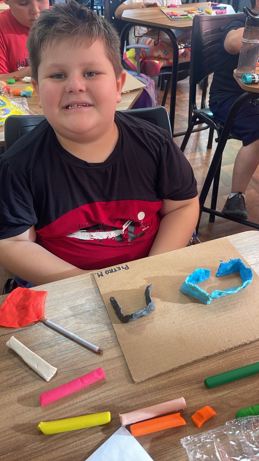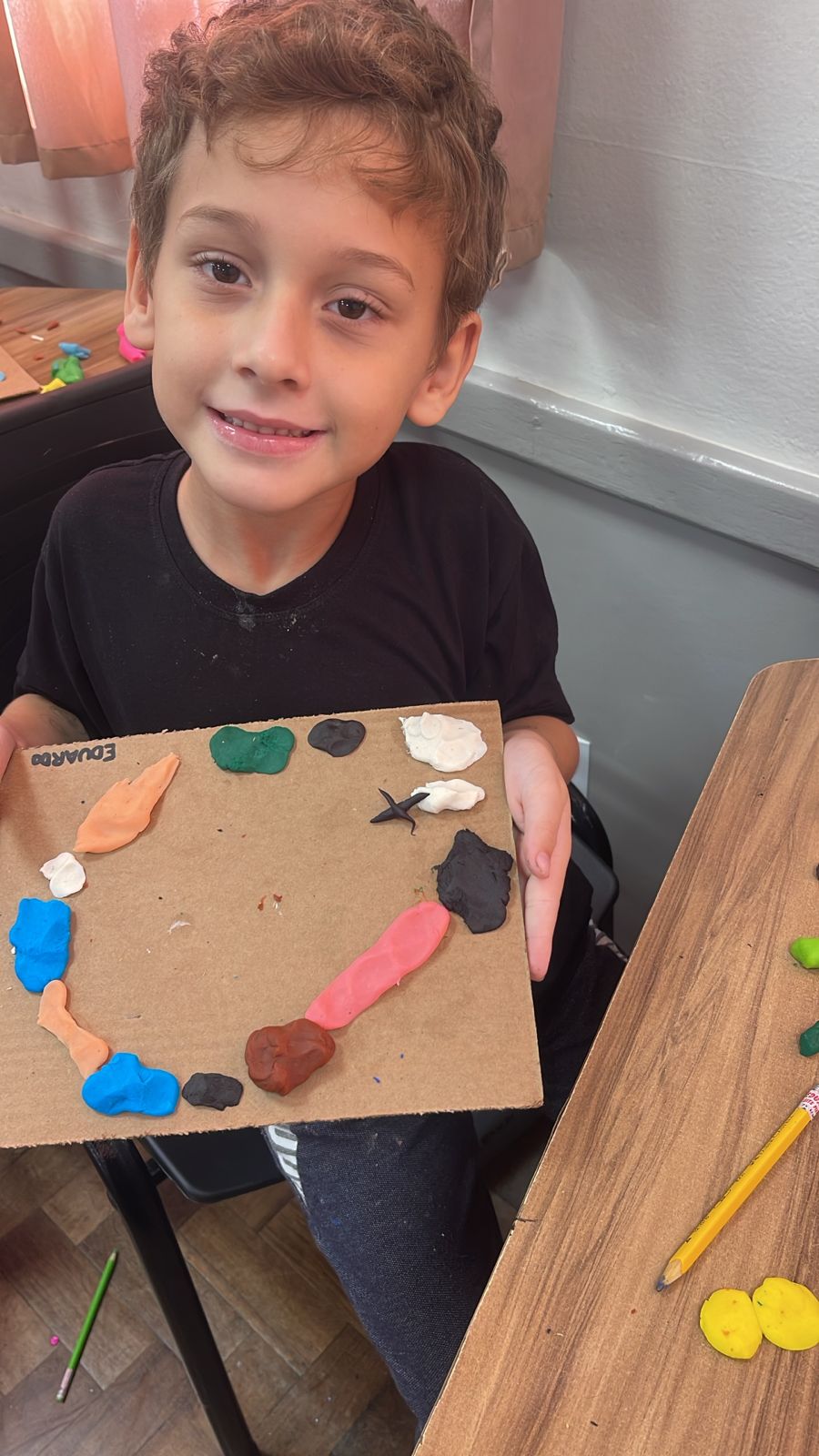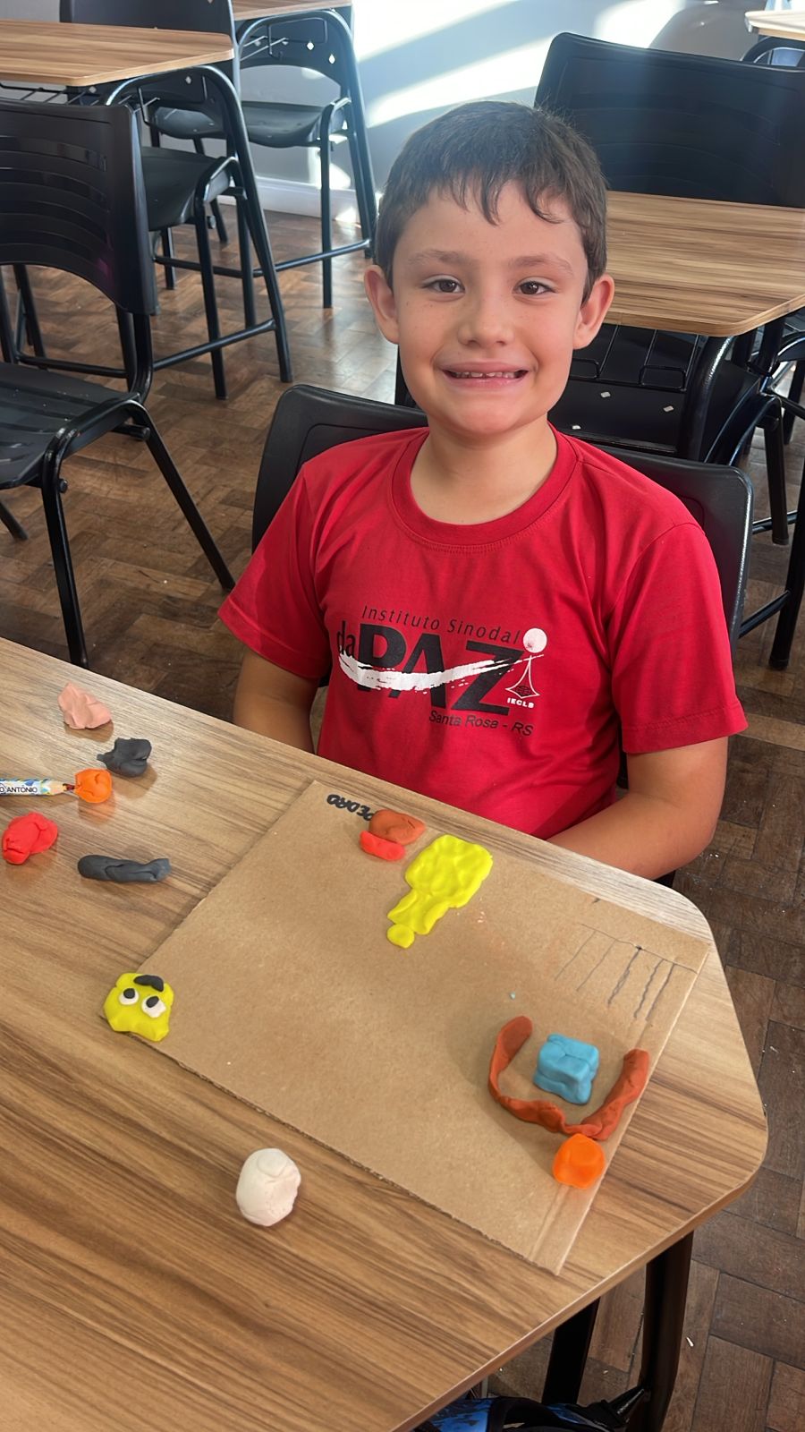 Com o uso de massinha de modelar, foram desafiados a criar uma maquete tátil representando o entorno da escola, aplicando na prática o que observaram durante a caminhada.