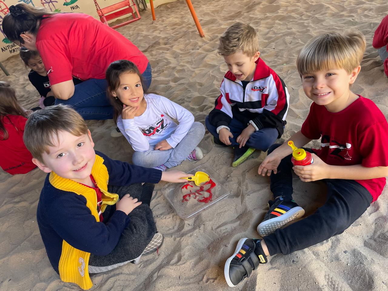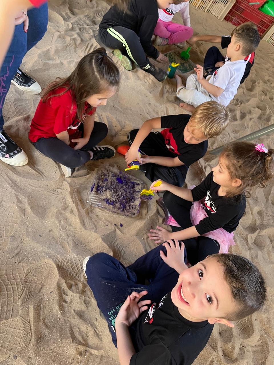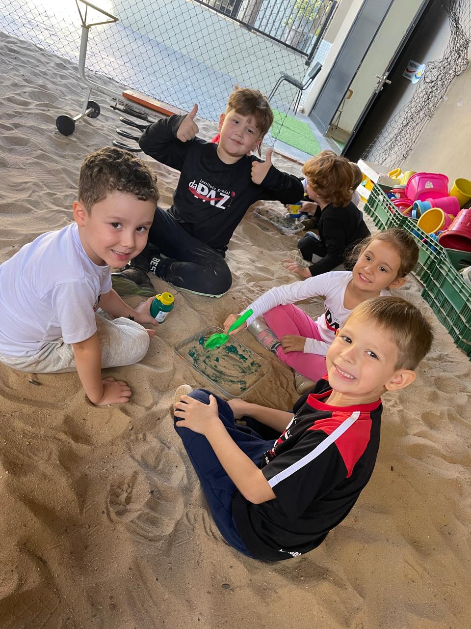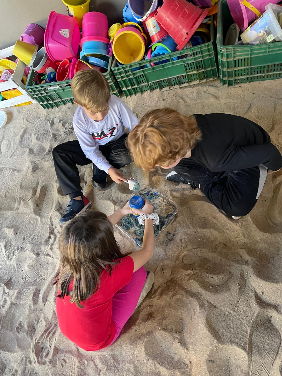 Utilizando a criatividade e o trabalho em equipe, as crianças tingiram areia com diferentes cores, explorando texturas, misturas e muita curiosidade!