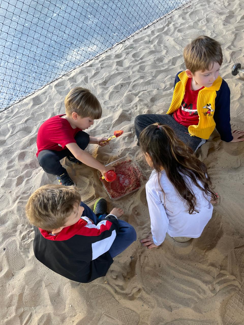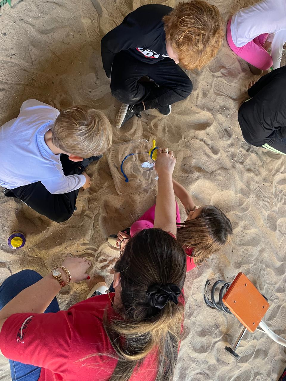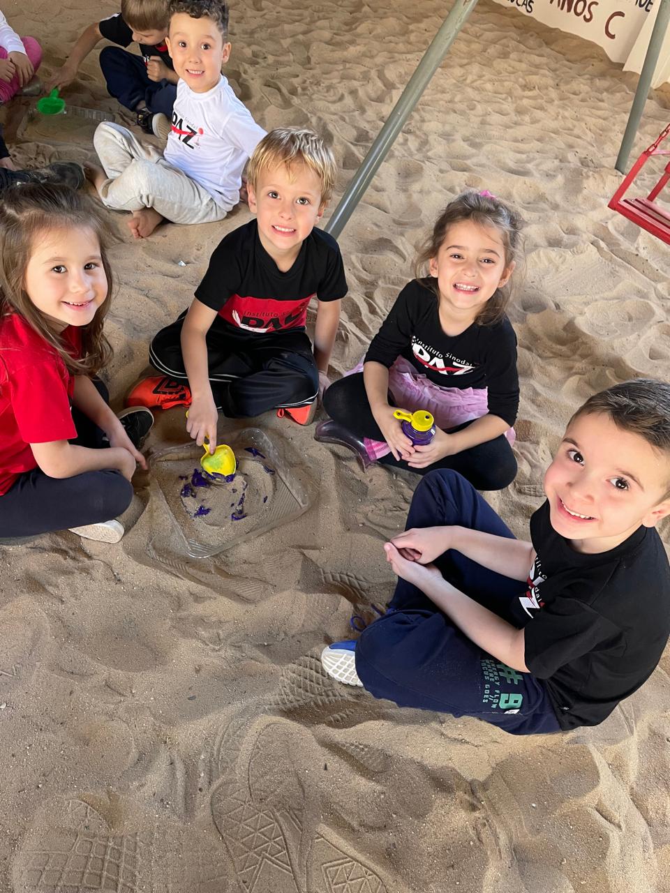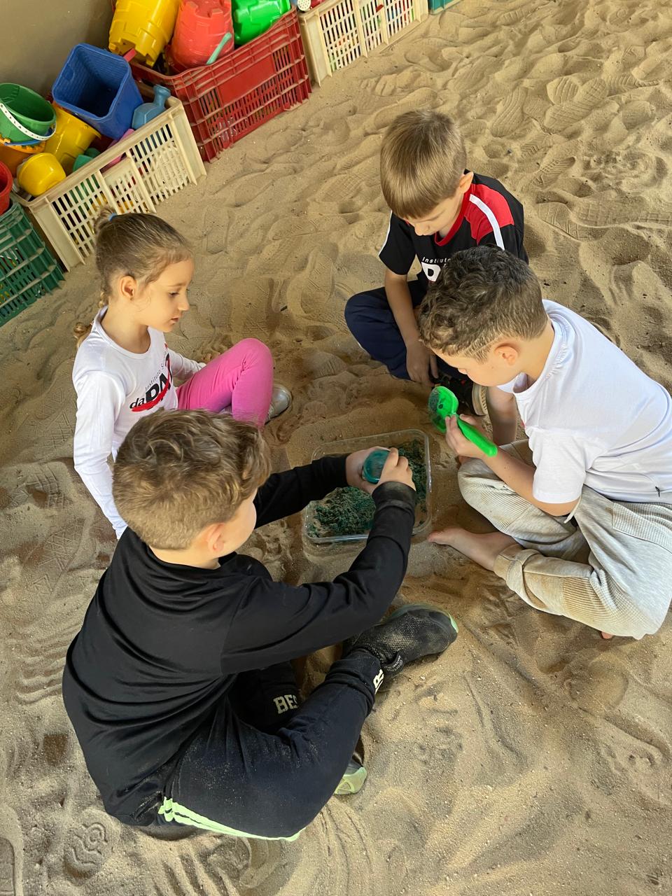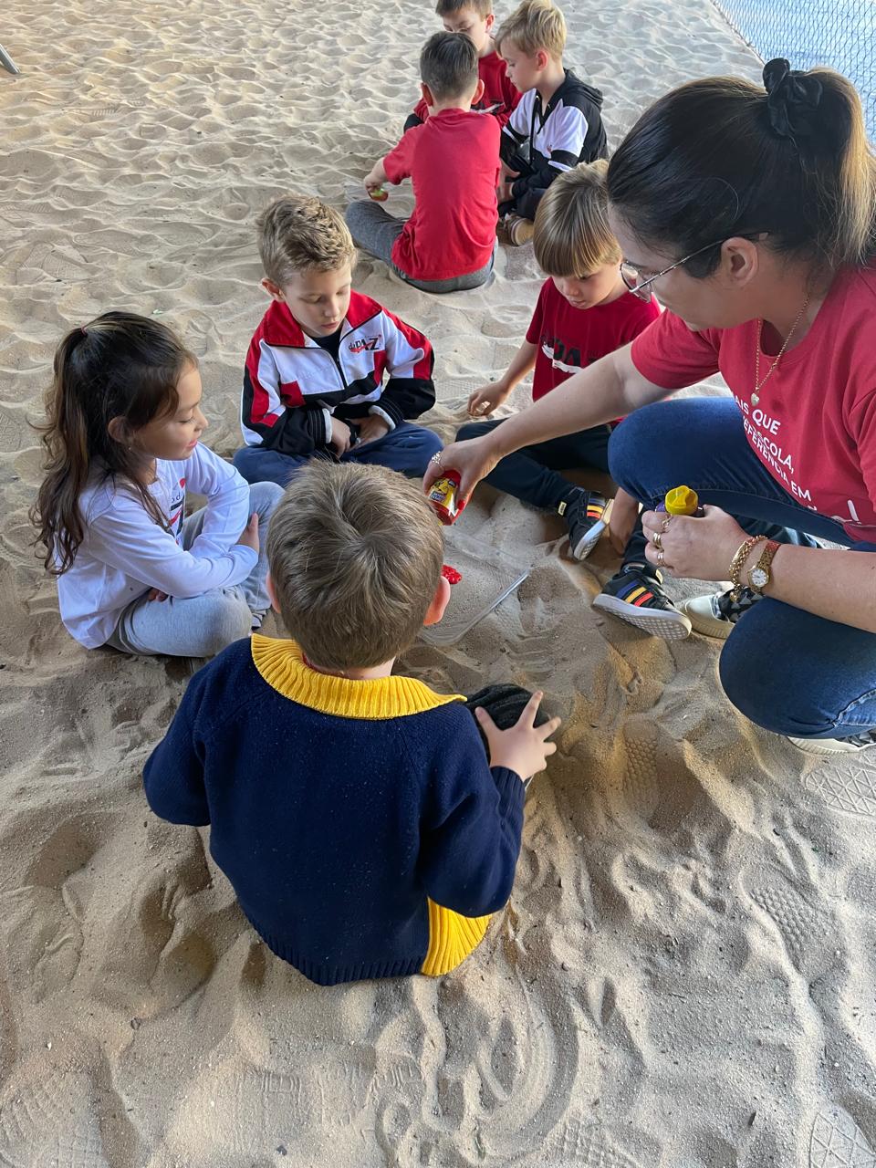 Utilizando a criatividade e o trabalho em equipe, as crianças tingiram areia com diferentes cores, explorando texturas, misturas e muita curiosidade!