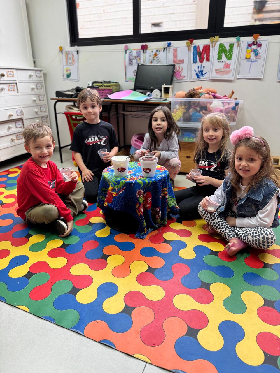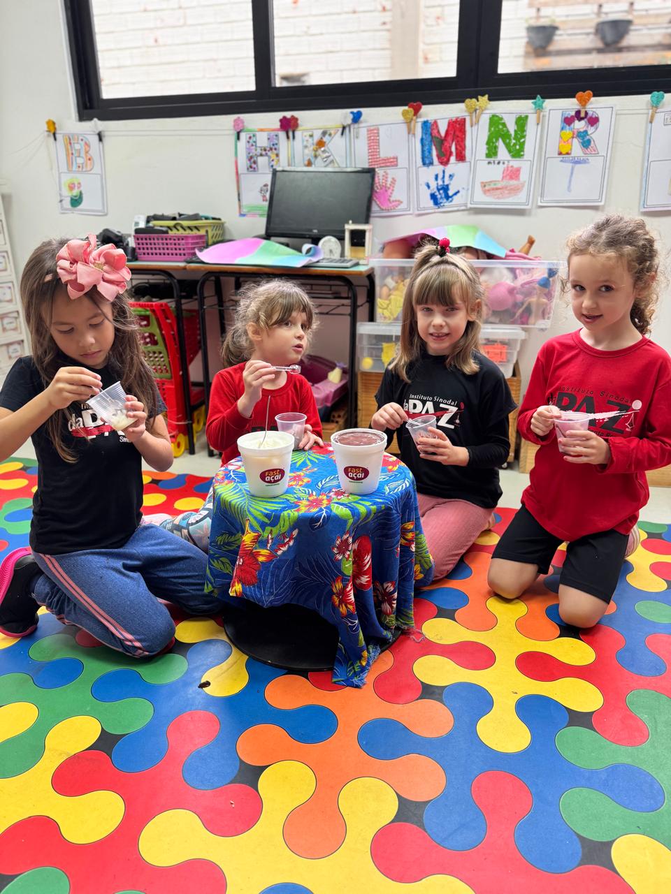 A degustação foi possível graças à parceria da família do colega Mateus. Sua mãe, Caroline, preparou um momento especial, oferecendo sorvete de açaí para a turma. Uma vivência cheia de sabor, afeto e aprendizado!