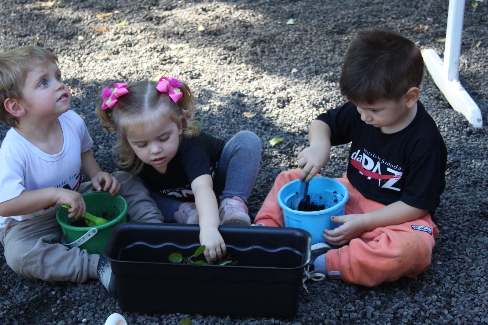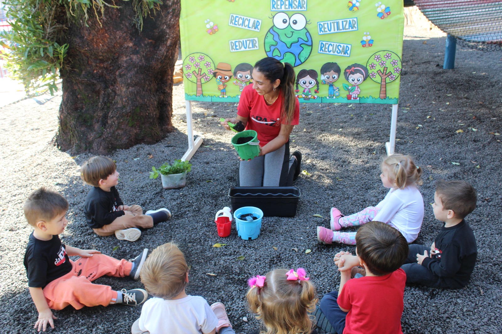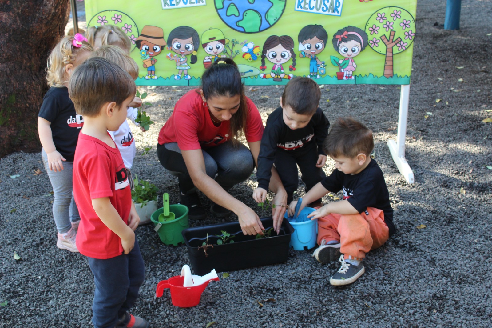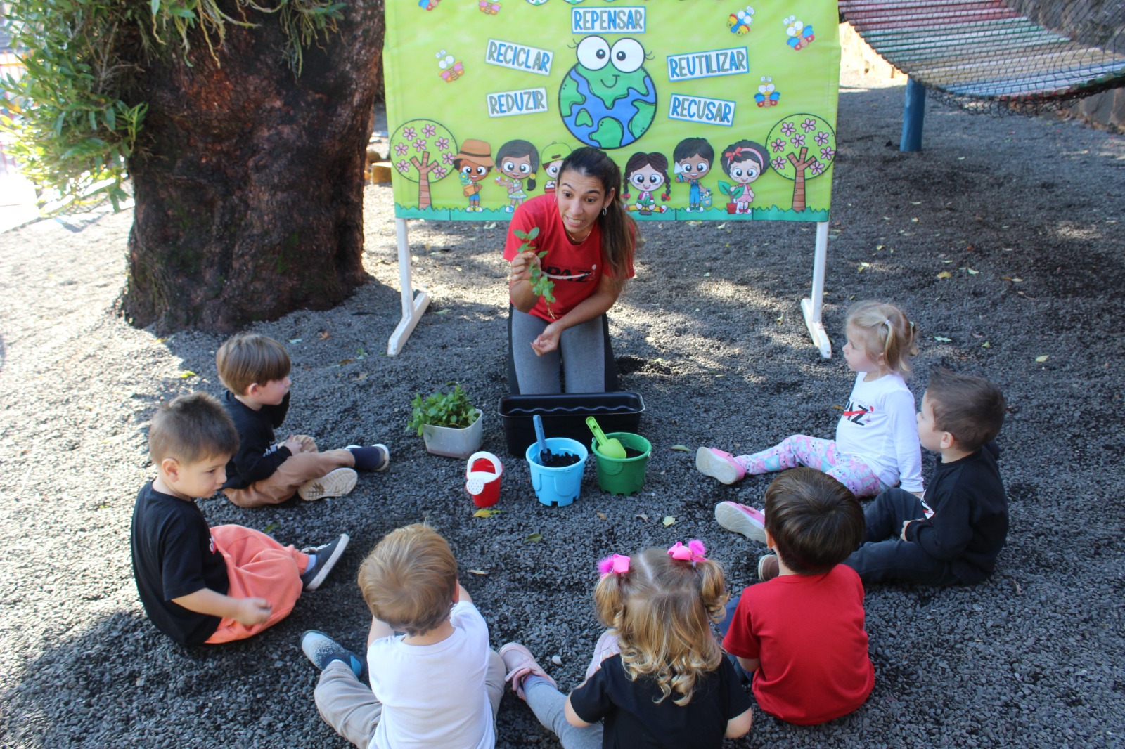 Durante a atividade sobre o meio ambiente, realizamos o plantio de chá, permitindo que as crianças sentissem o cheirinho das ervas, a textura da terra e se conectassem com a natureza de forma lúdica e afetiva.