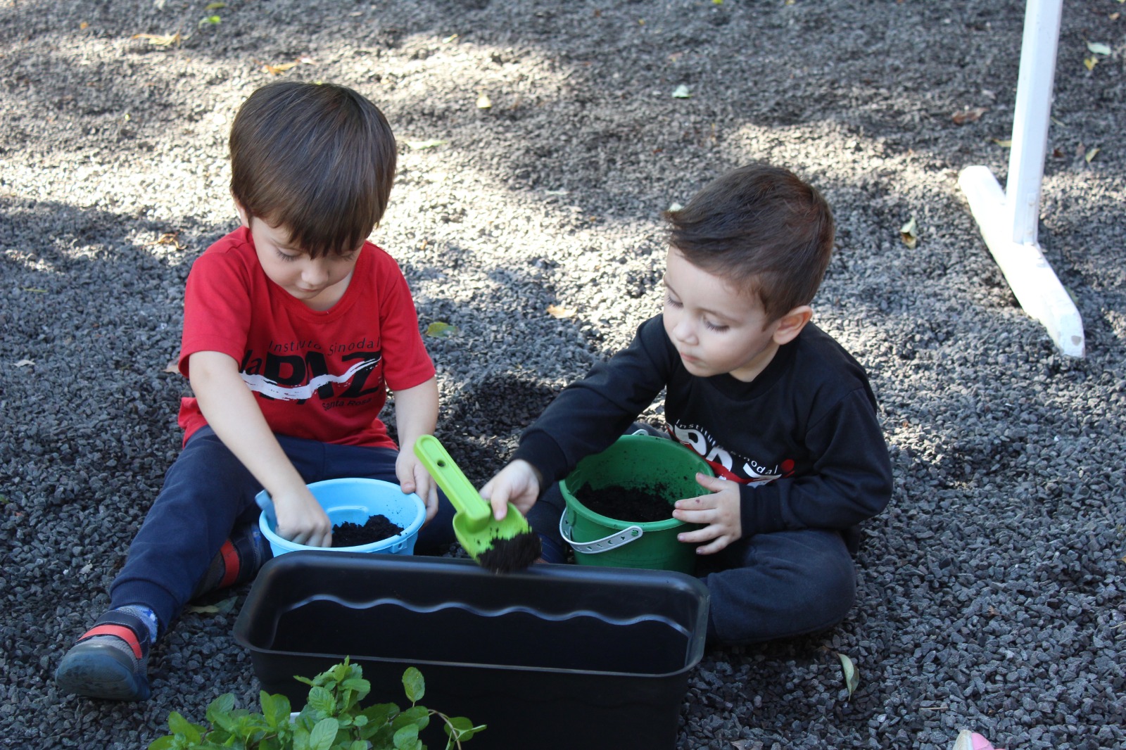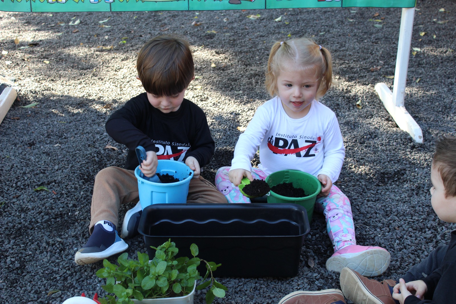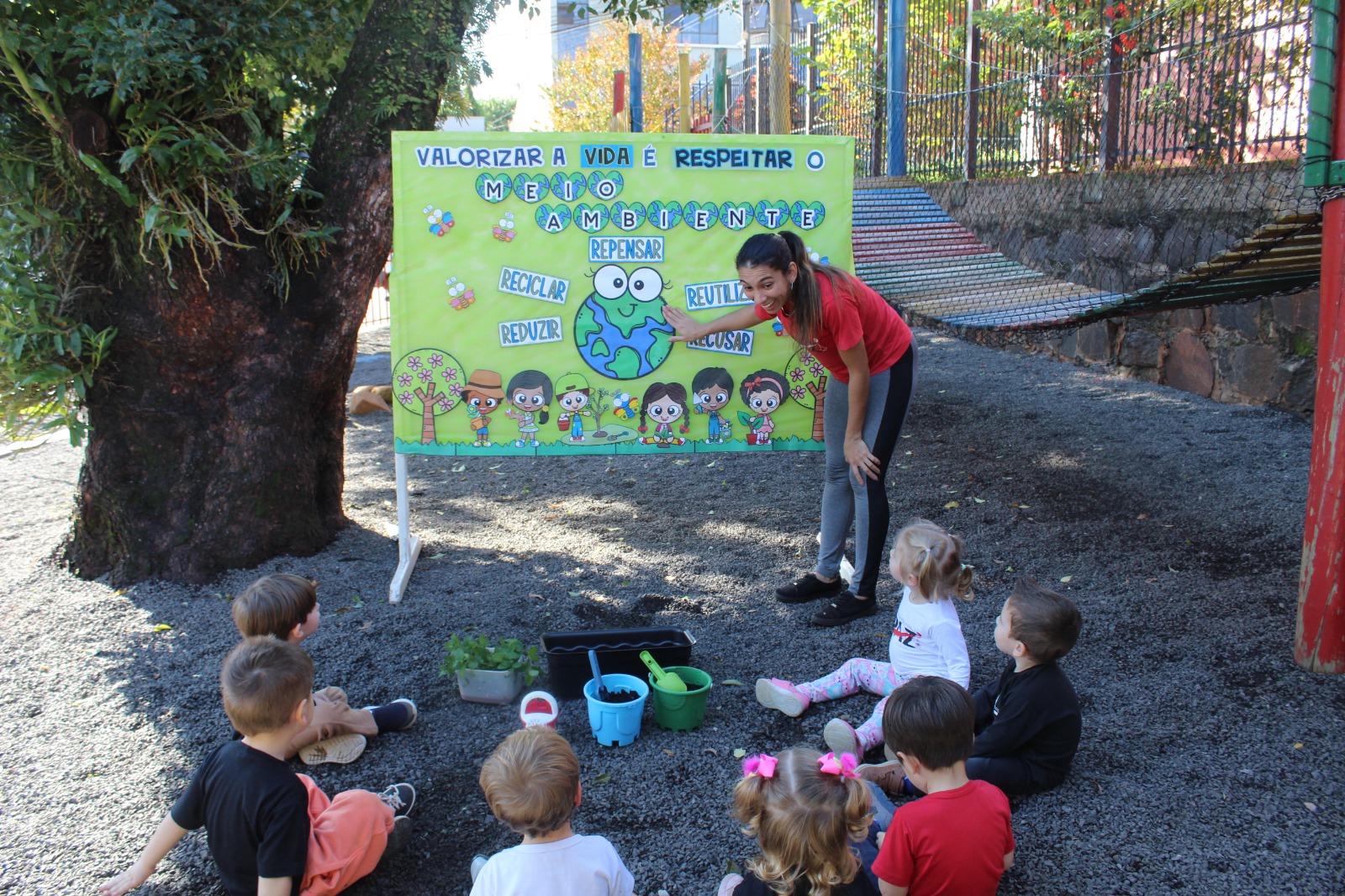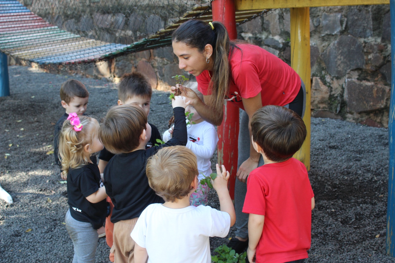 Durante a atividade sobre o meio ambiente, realizamos o plantio de chá, permitindo que as crianças sentissem o cheirinho das ervas, a textura da terra e se conectassem com a natureza de forma lúdica e afetiva.