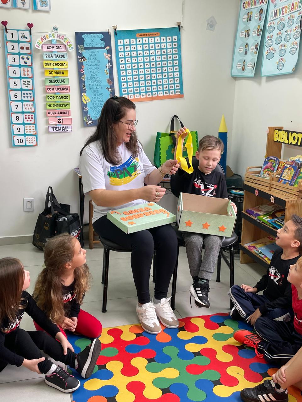 A proposta tem como objetivo a construção do alfabeto coletivo, de forma lúdica e participativa. A cada sorteio de letras, uma criança leva a caixa para casa e, junto com sua família, escolhe um objeto que começa com a letra sorteada. Depois, na escola, ela apresenta dicas e características do objeto, desafiando os colegas a adivinharem o que está dentro da caixa!