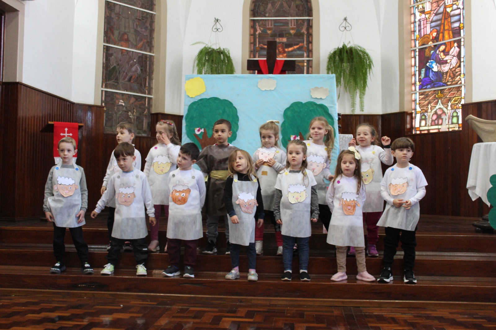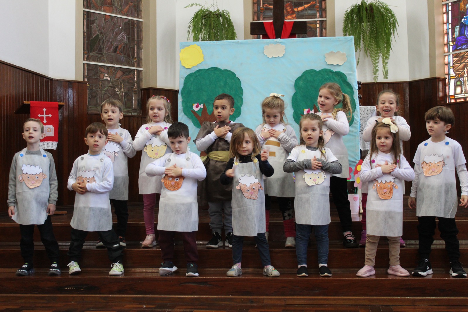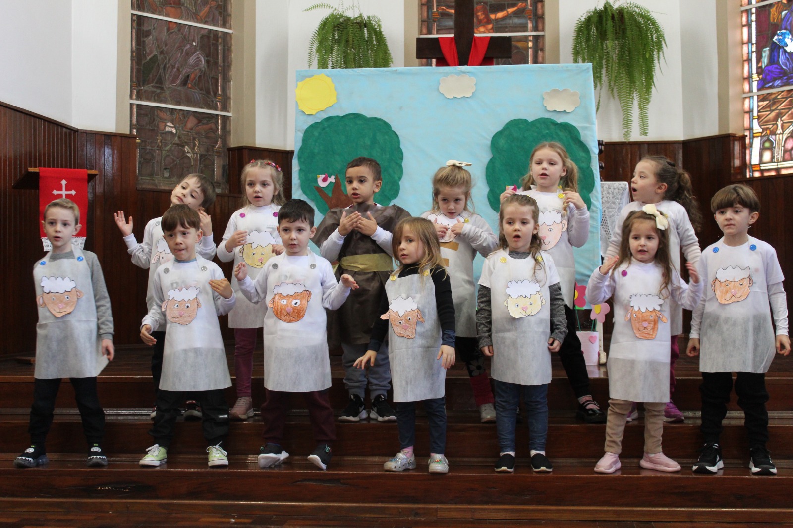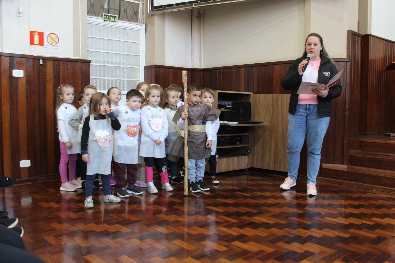 Após a encenação, os alunos cantaram a canção "Ovelhinha de Jesus – Música Infantil", encerrando com ternura essa bela apresentação.