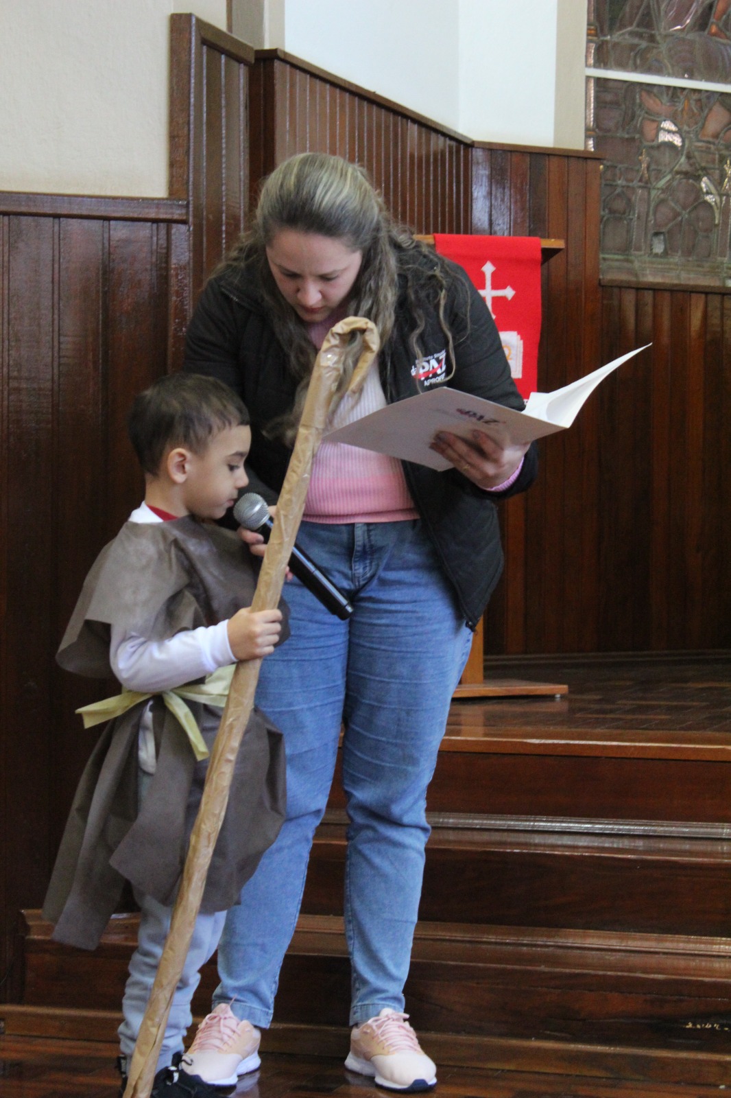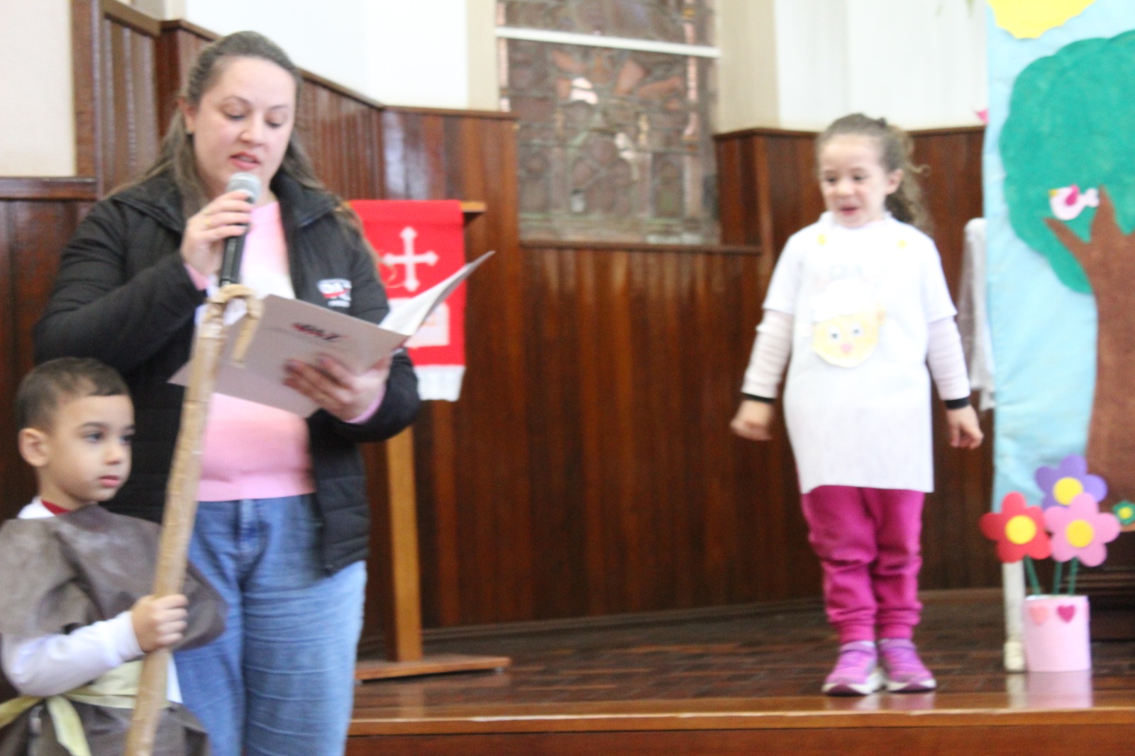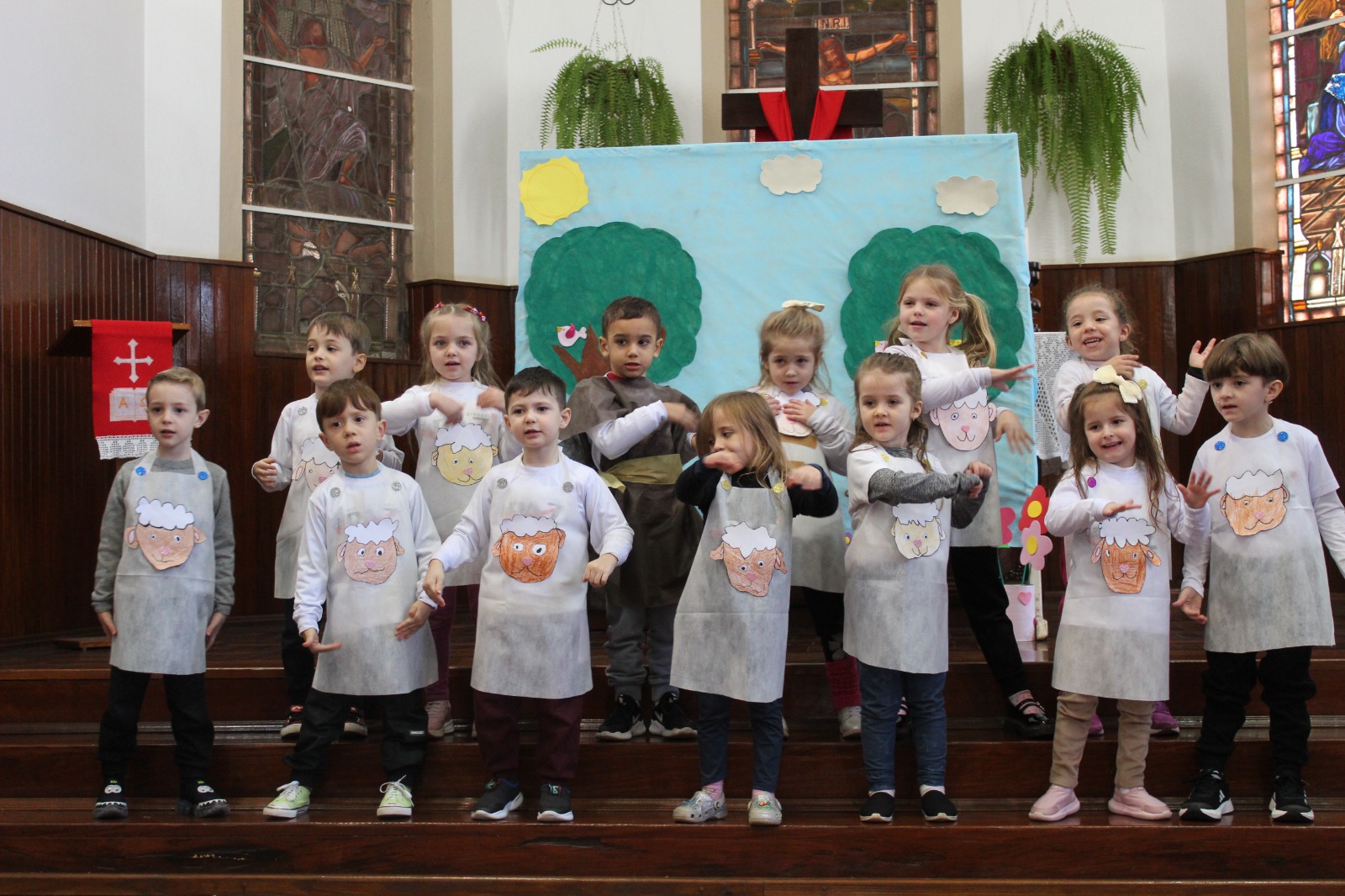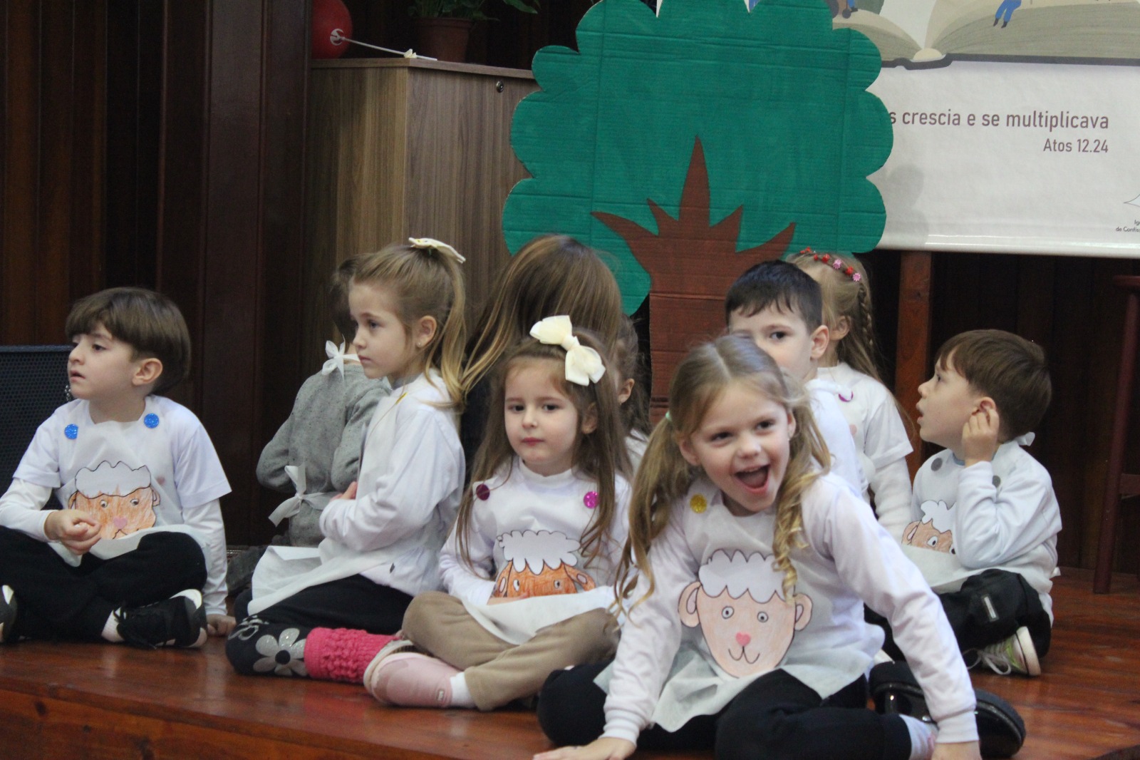 Após a encenação, os alunos cantaram a canção "Ovelhinha de Jesus – Música Infantil", encerrando com ternura essa bela apresentação.