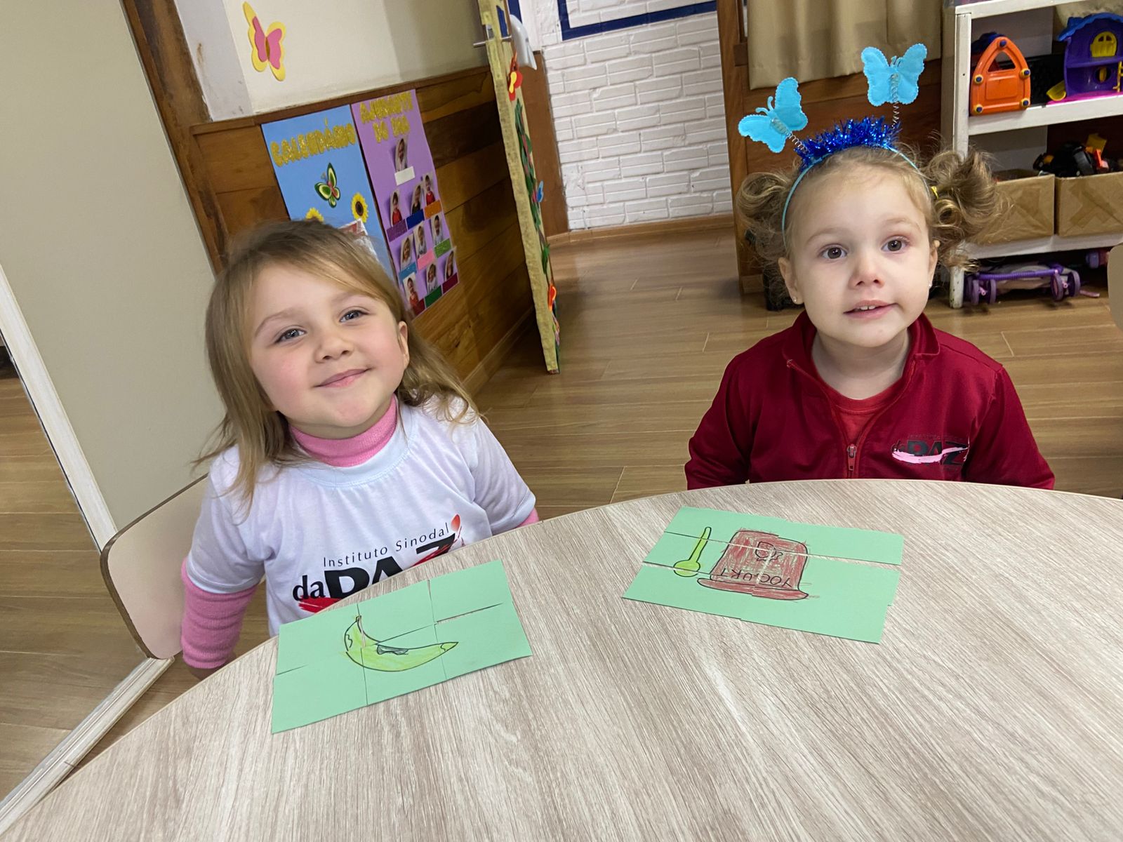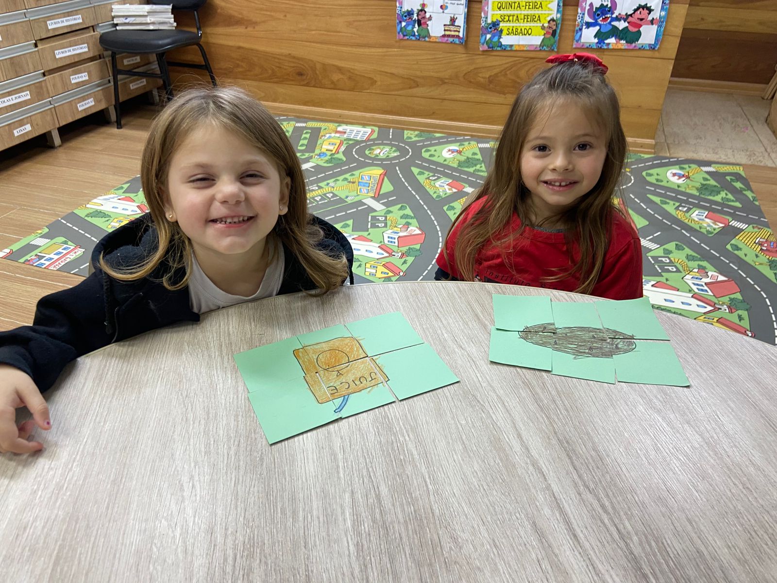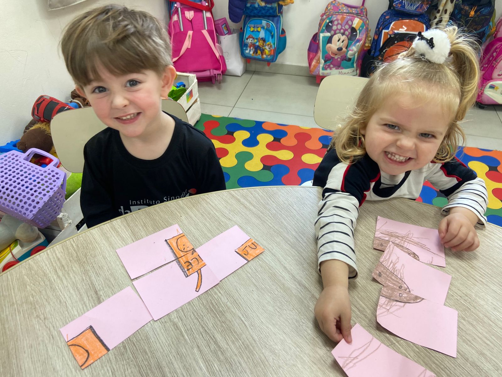 Durante a aula de Língua Inglesa, as crianças das turmas de 3 anos C e V revisaram os nomes de frutas, comidas e bebidas de um jeito super criativo: confeccionaram e montaram seus próprios quebra-cabeças temáticos!