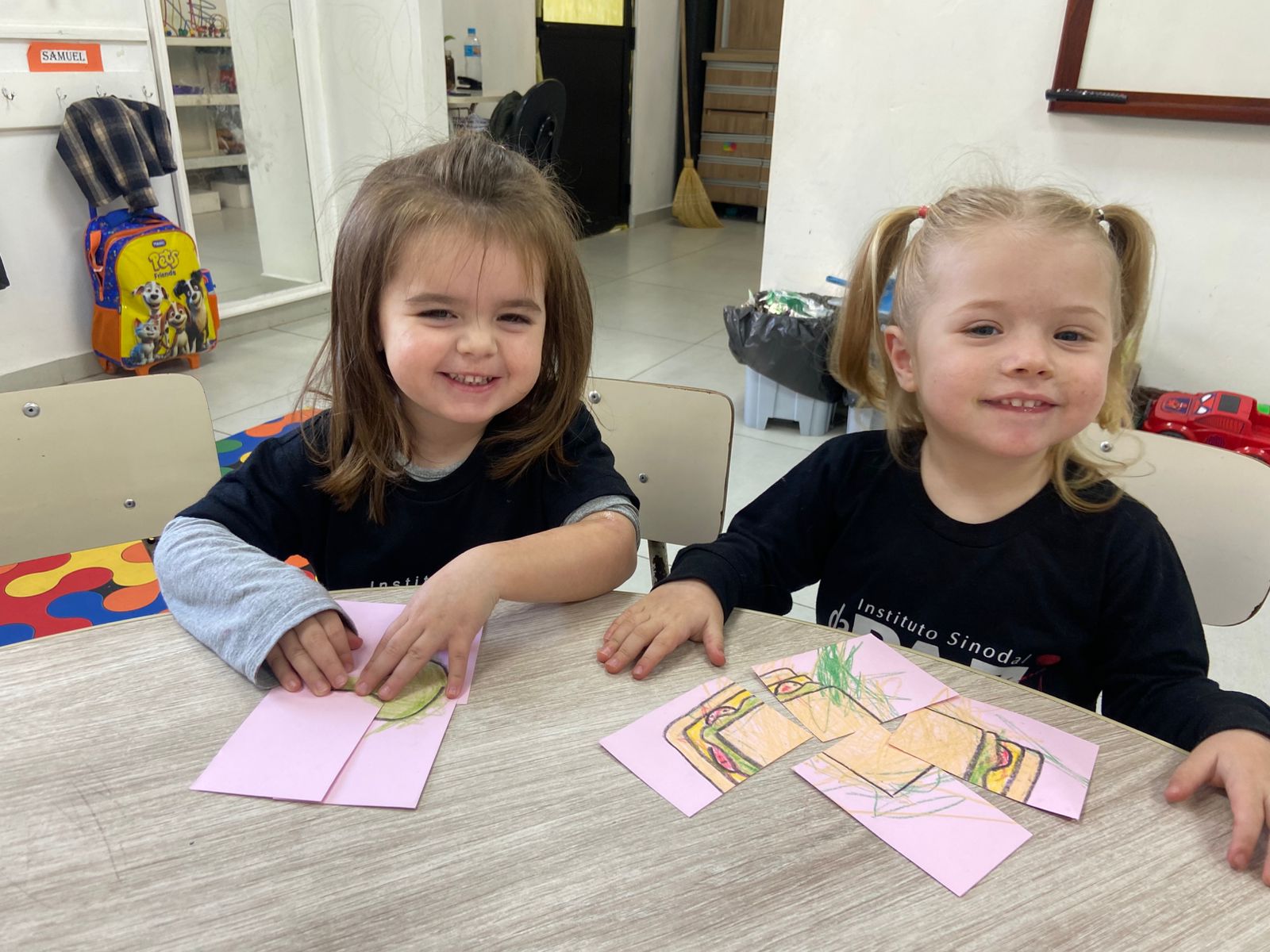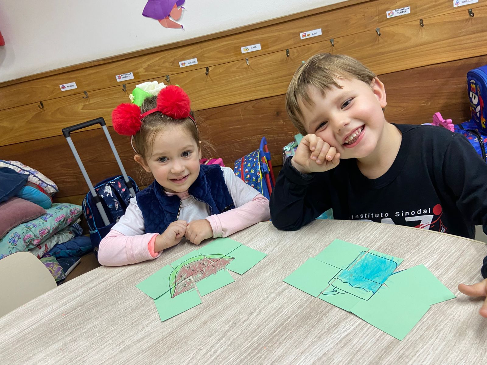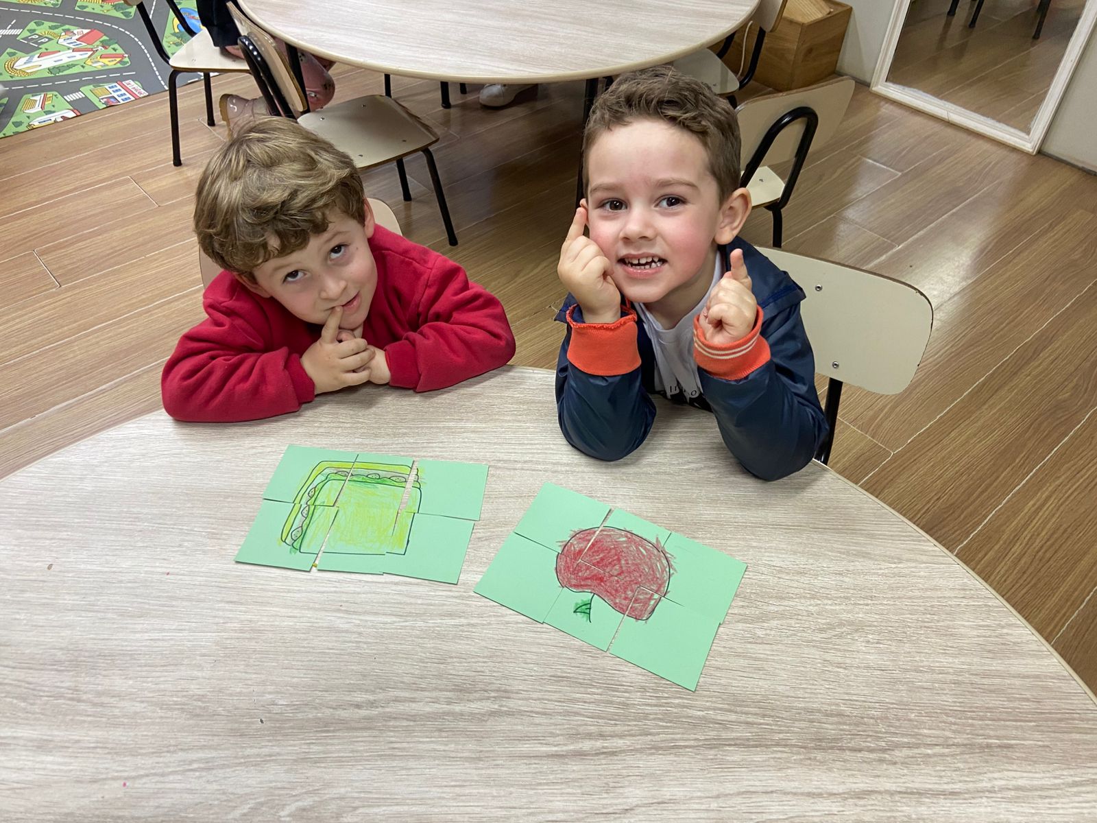 Durante a aula de Língua Inglesa, as crianças das turmas de 3 anos C e V revisaram os nomes de frutas, comidas e bebidas de um jeito super criativo: confeccionaram e montaram seus próprios quebra-cabeças temáticos!