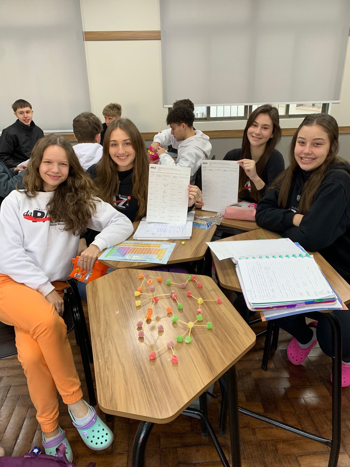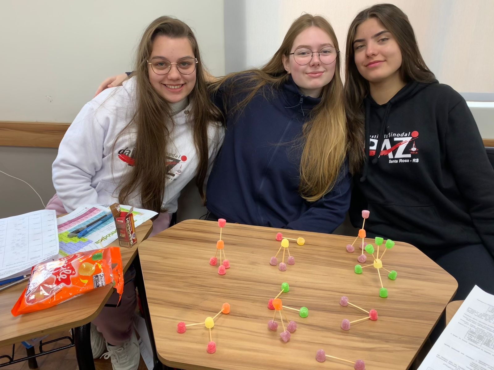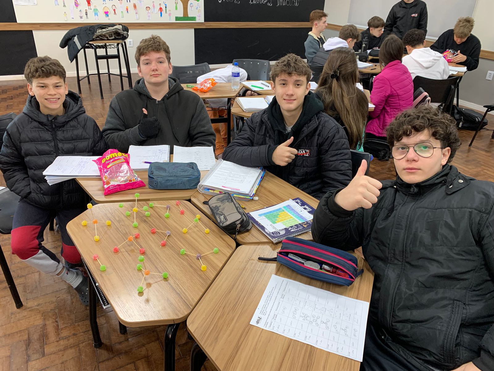 Alunos aprendem química com balinhas de goma em aula divertida sobre moléculas