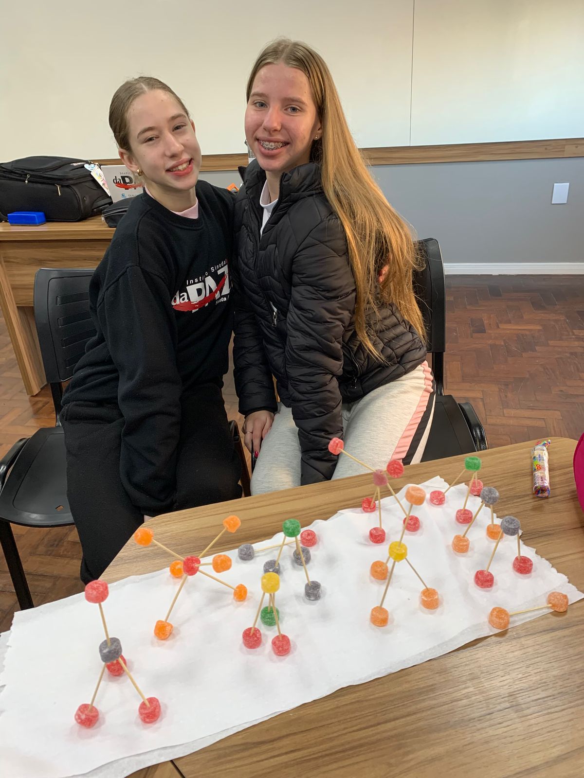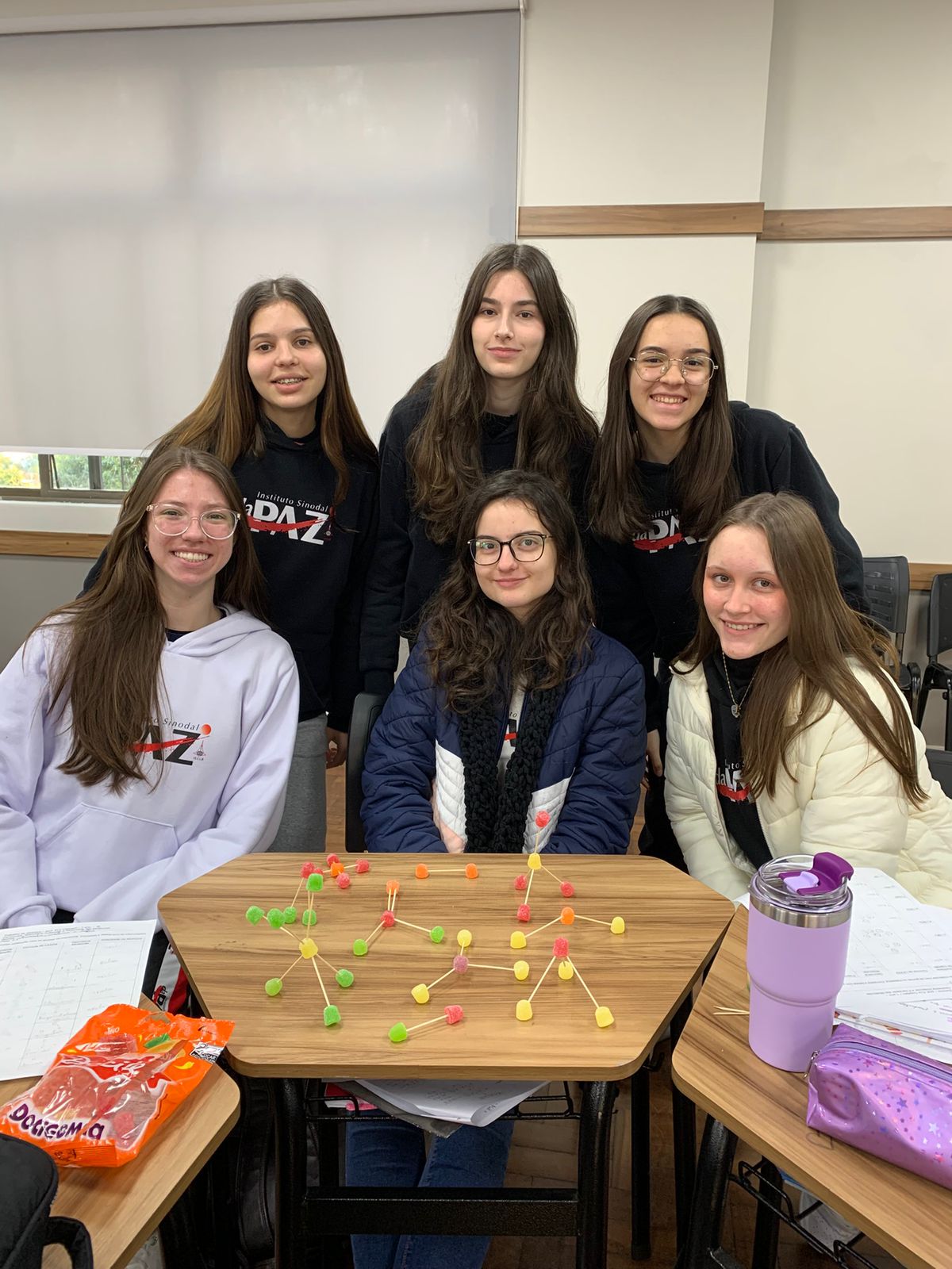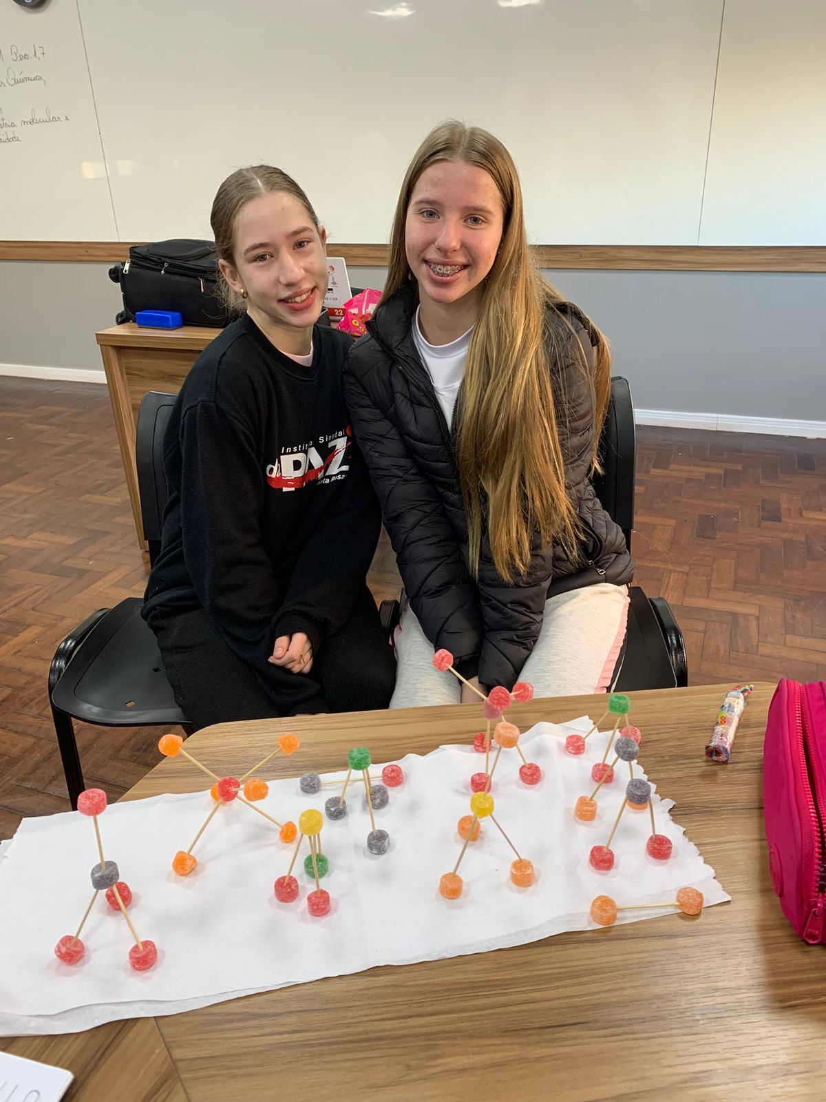 Alunos aprendem química com balinhas de goma em aula divertida sobre moléculas