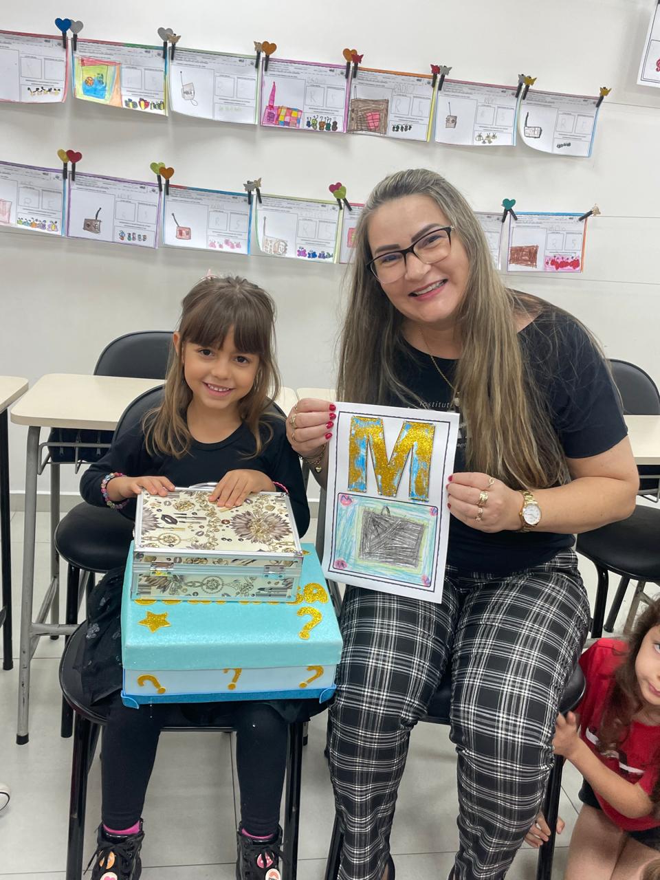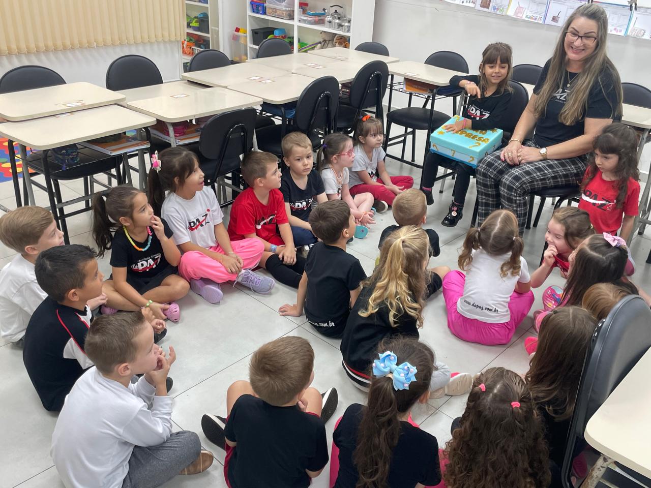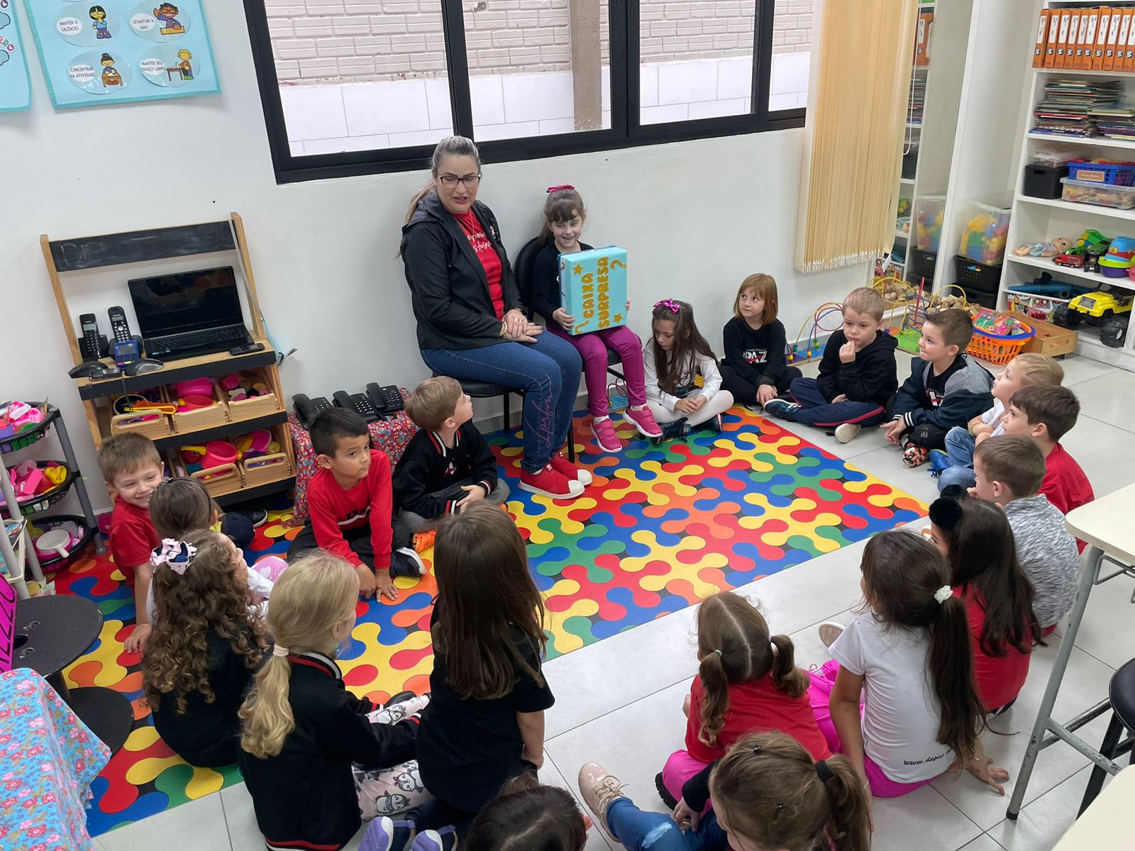 Os alunos da pré-escola 05 anos J, professora Janete Paz iniciaram o Projeto "Caixa surpresa" que tem como objetivo a construção do alfabeto coletivo, através de sorteio de uma letra por semana, cada criança leva a caixa para casa e escolhe algo significativo com sua família, para apresentar a turma.